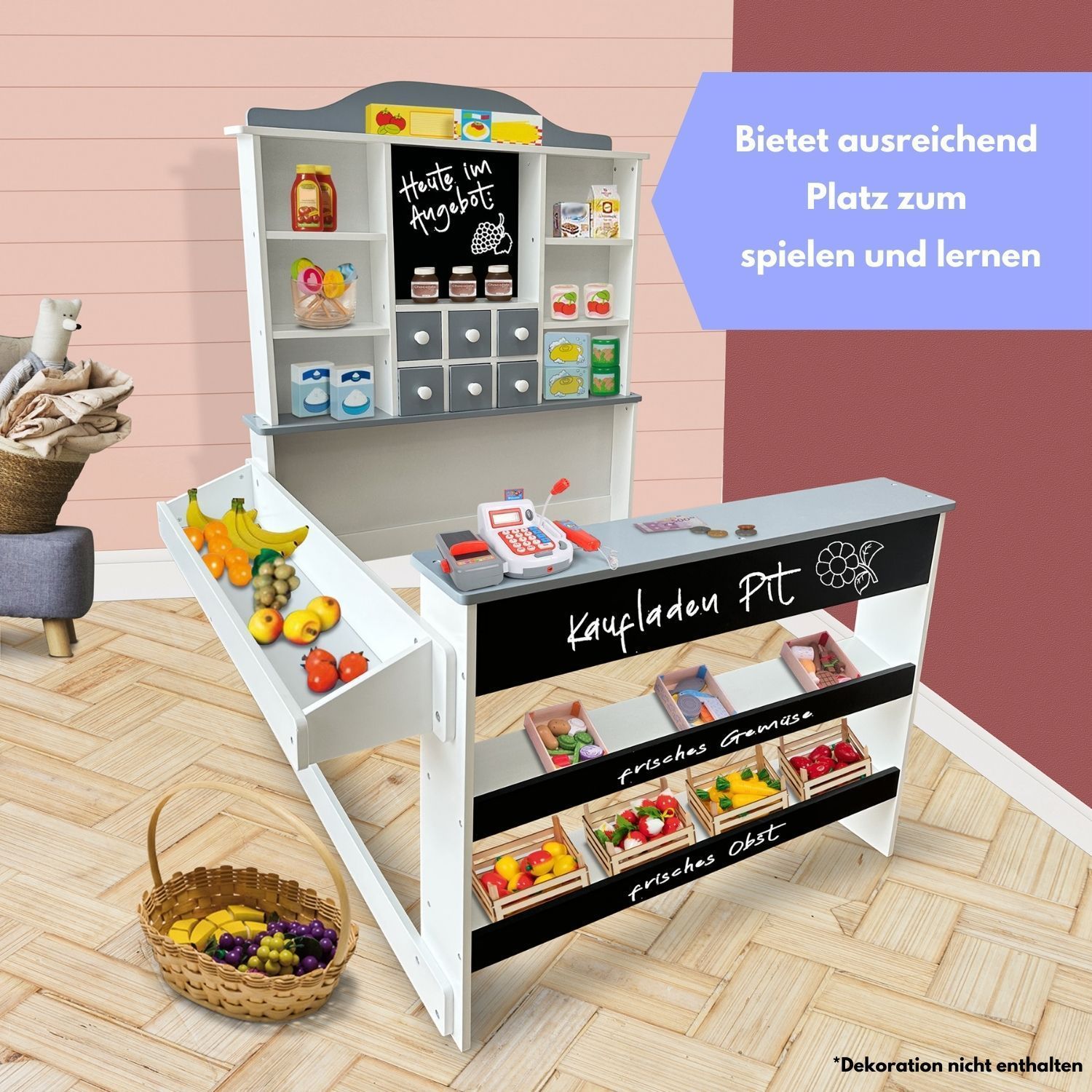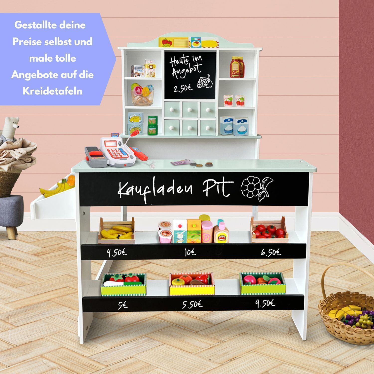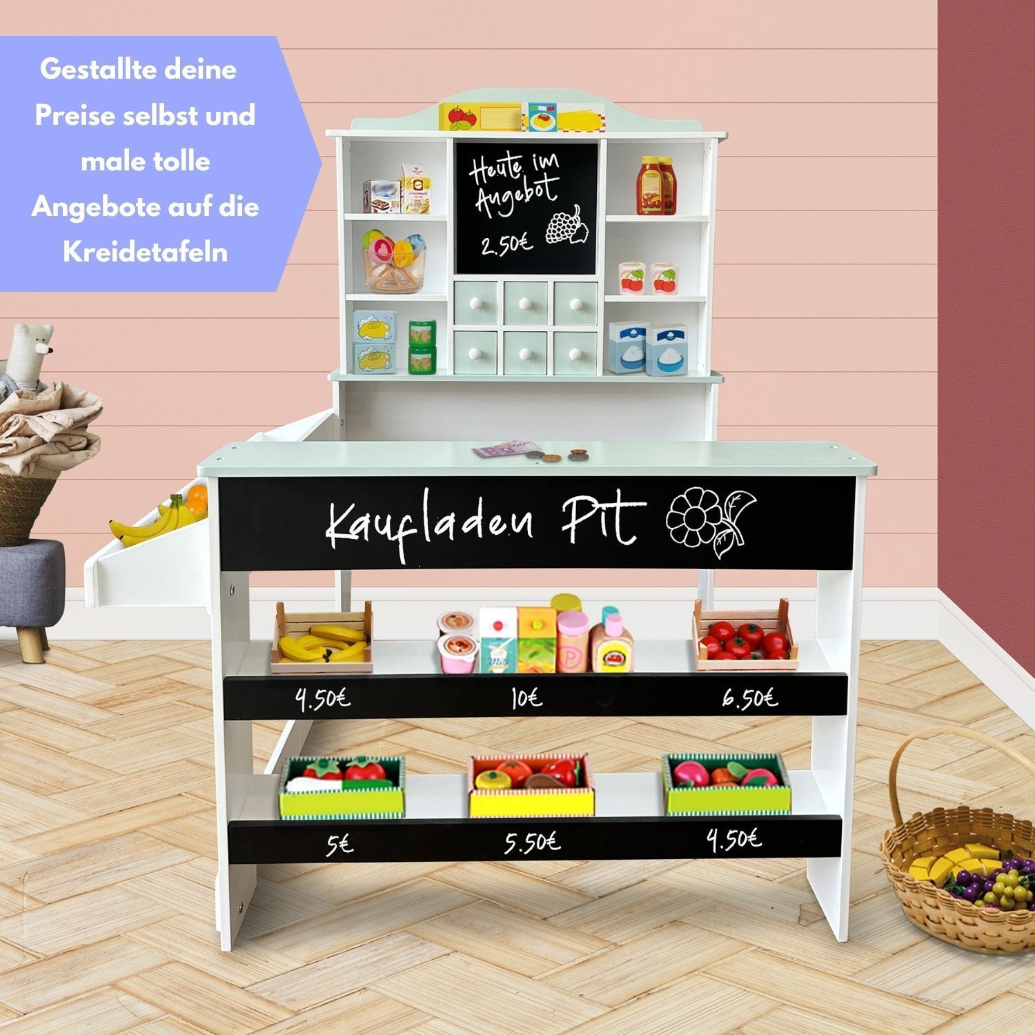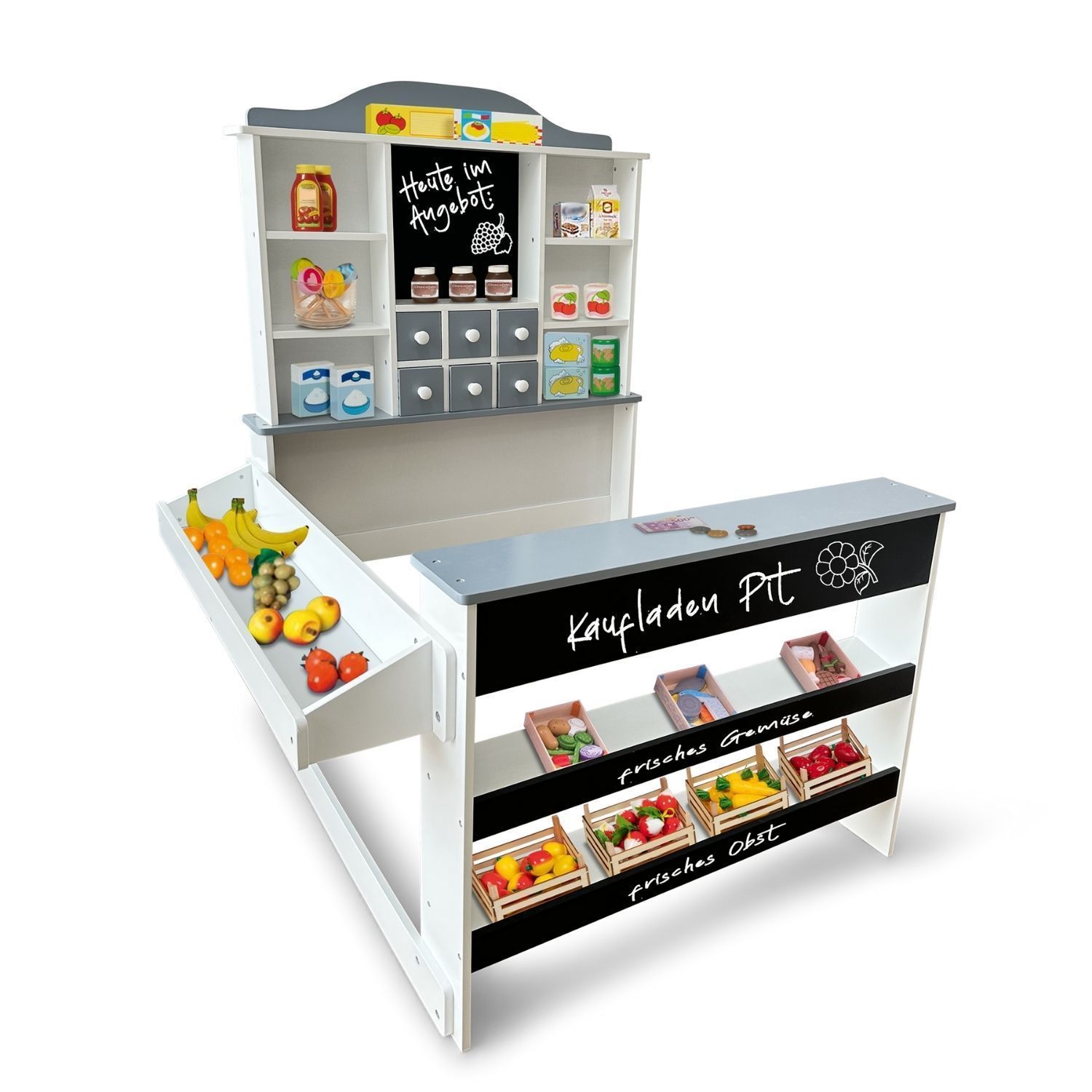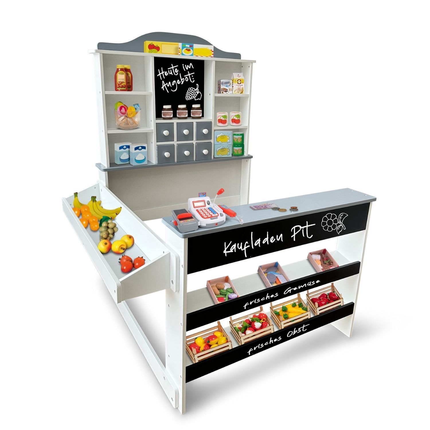 Coemo Kaufladen Pit aus Holz mit Preisschildern, wahlweise mit Spielkasse Linus
