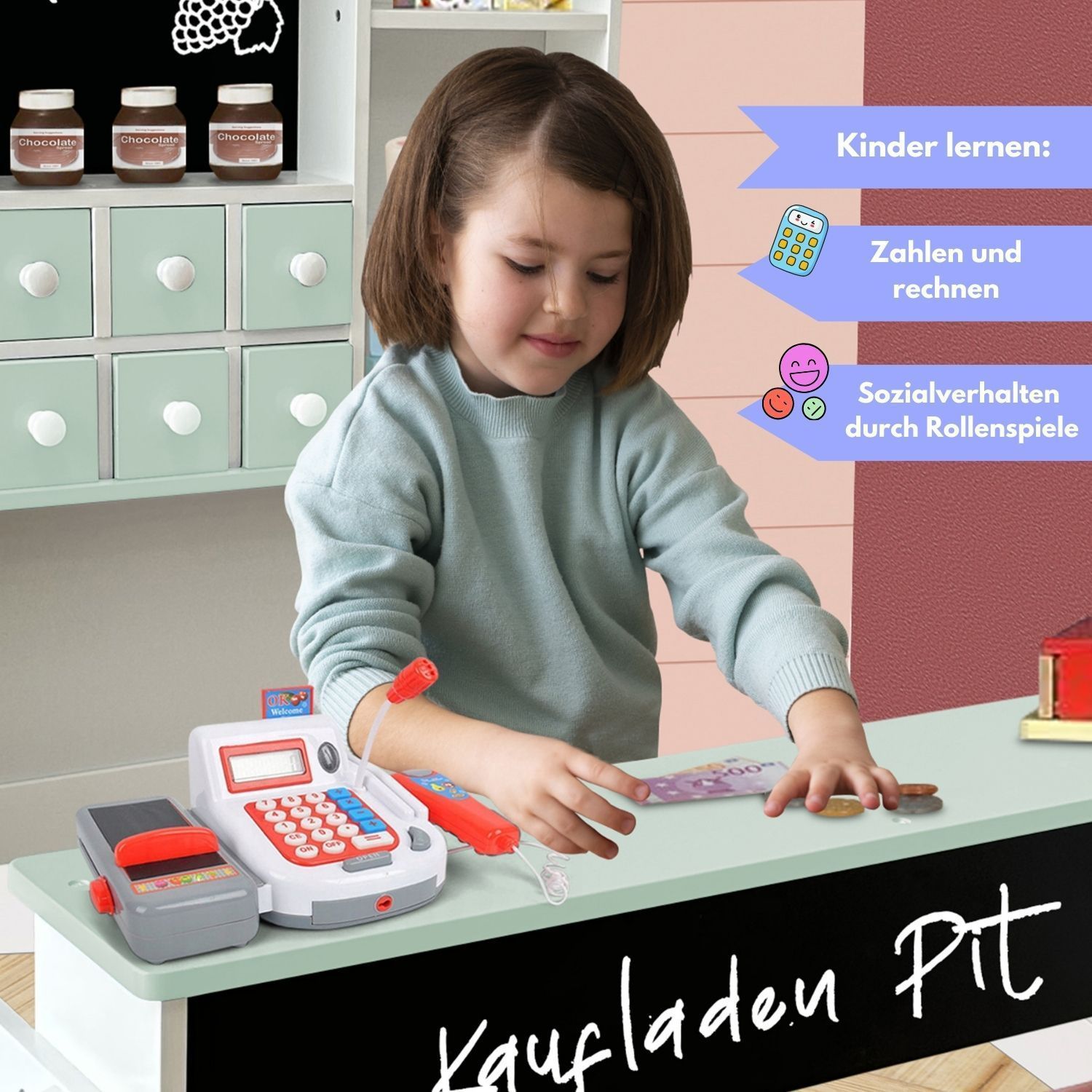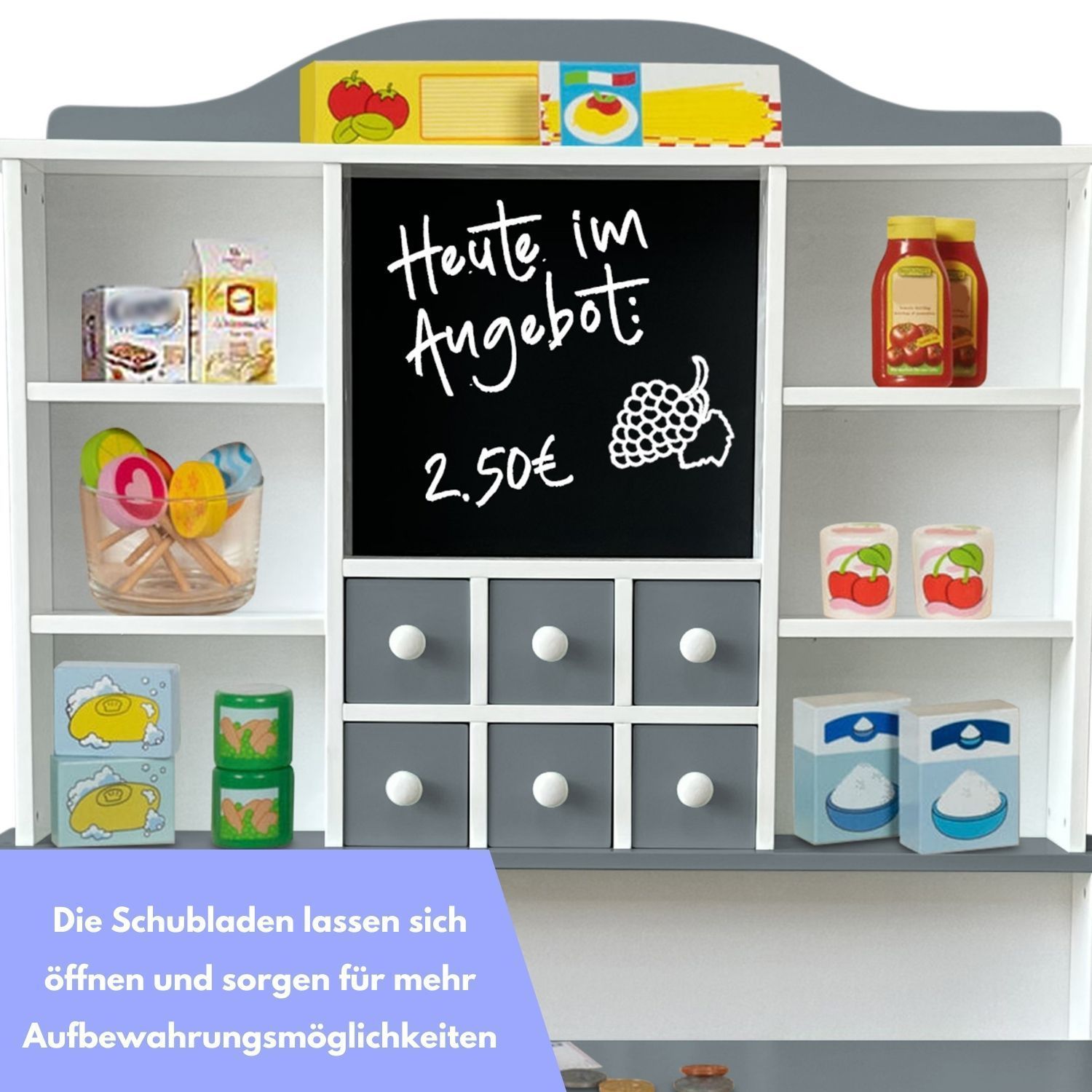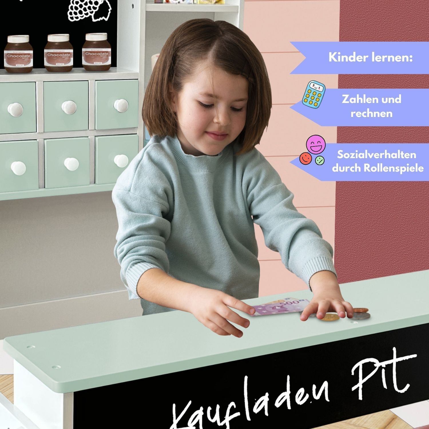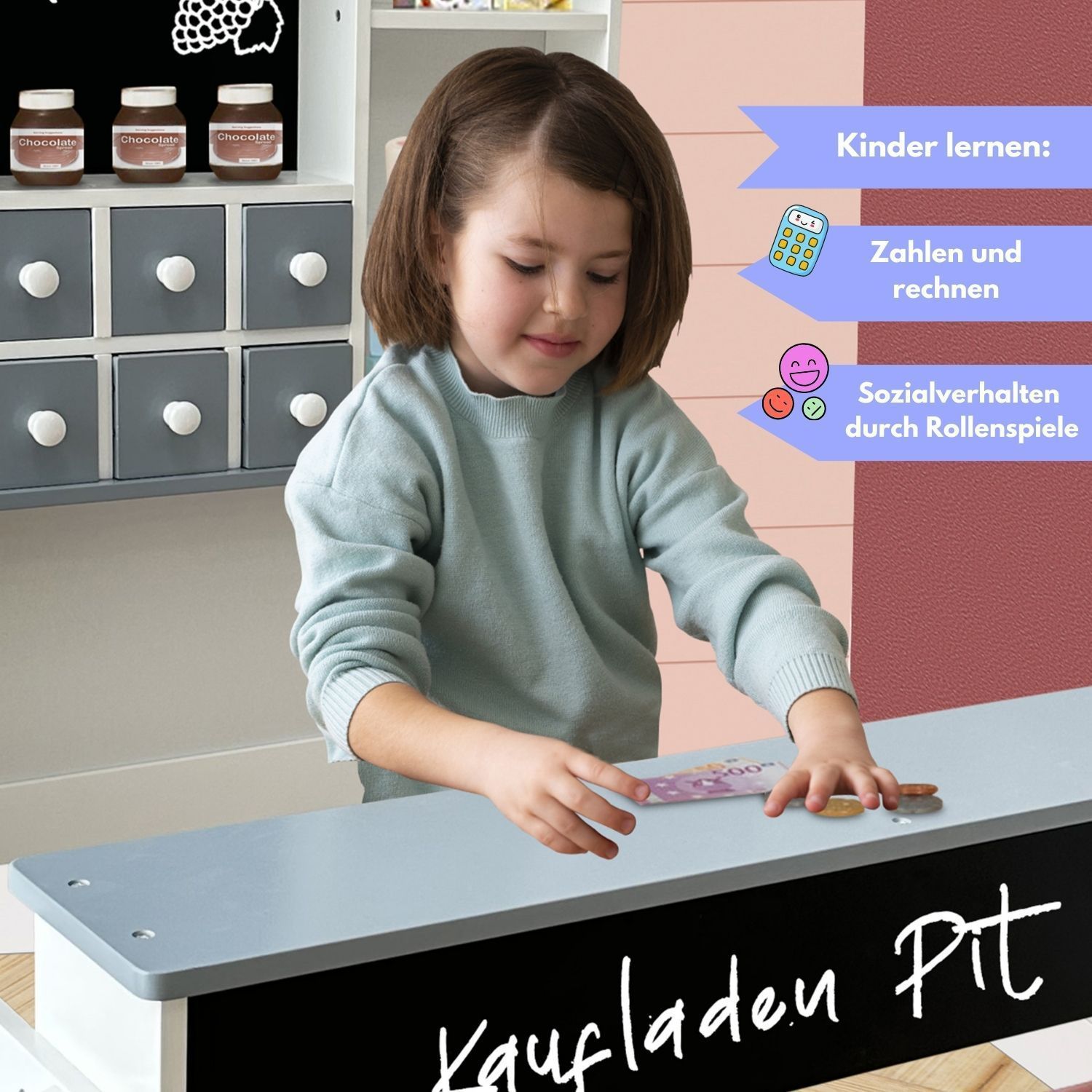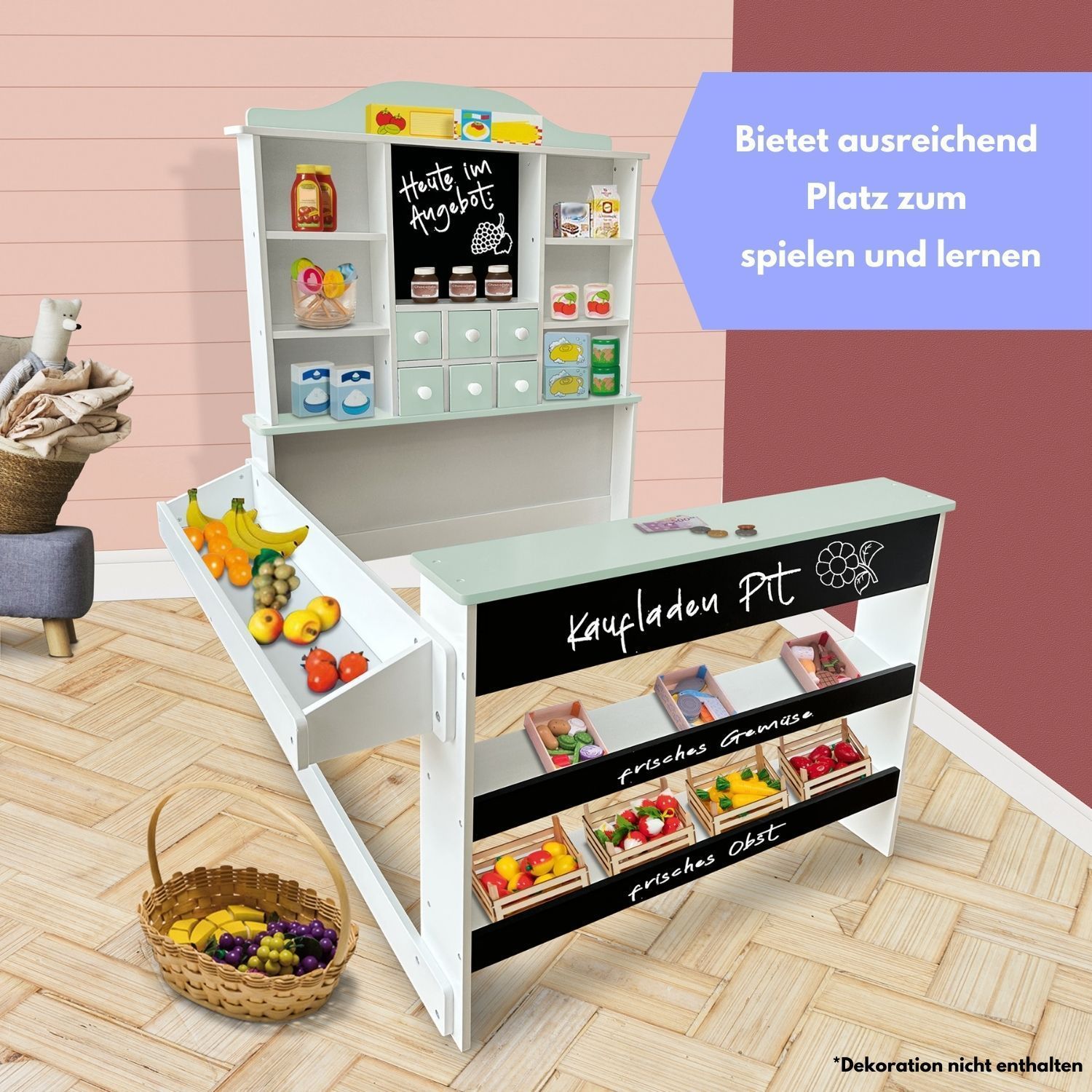 Coemo Kaufladen Pit aus Holz mit Preisschildern, wahlweise mit Spielkasse Linus