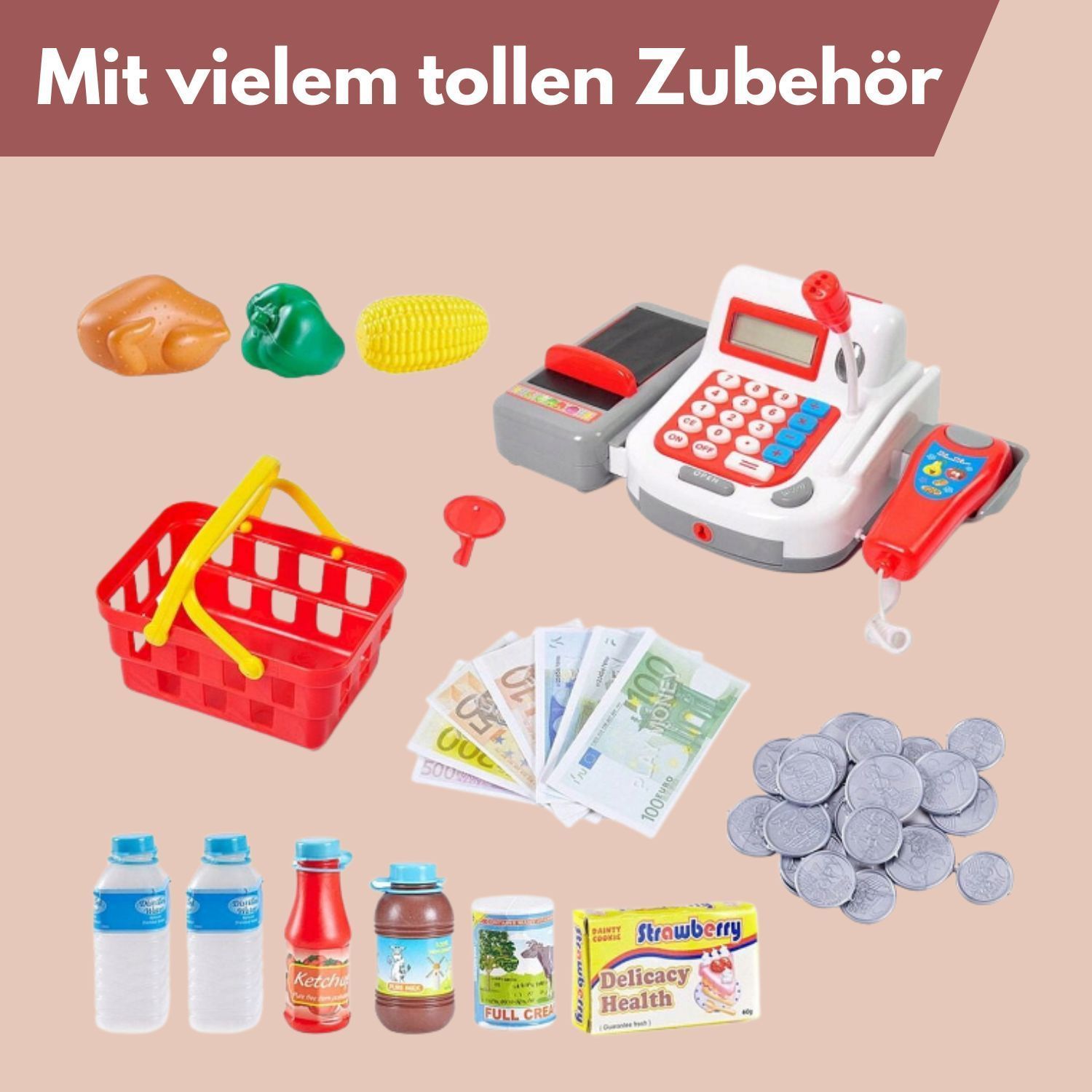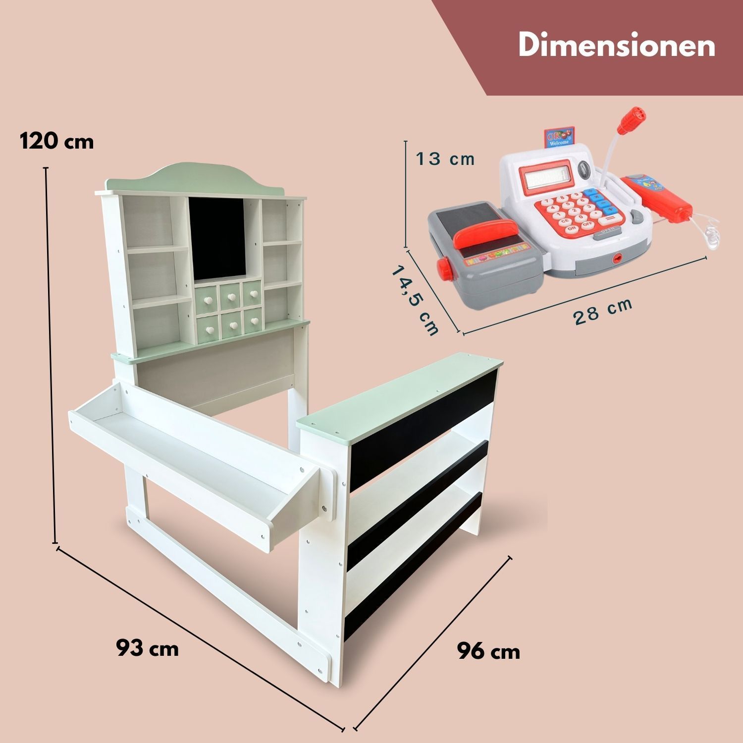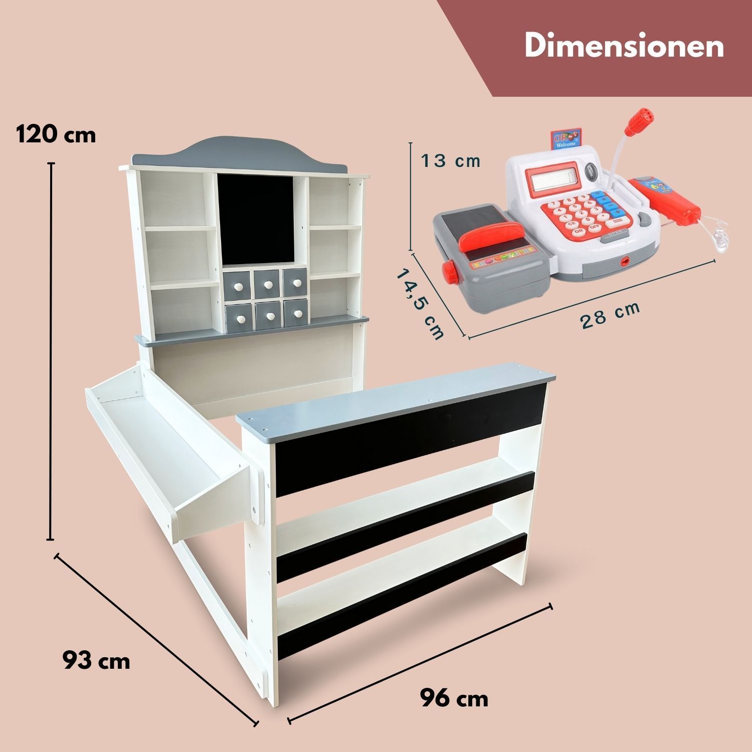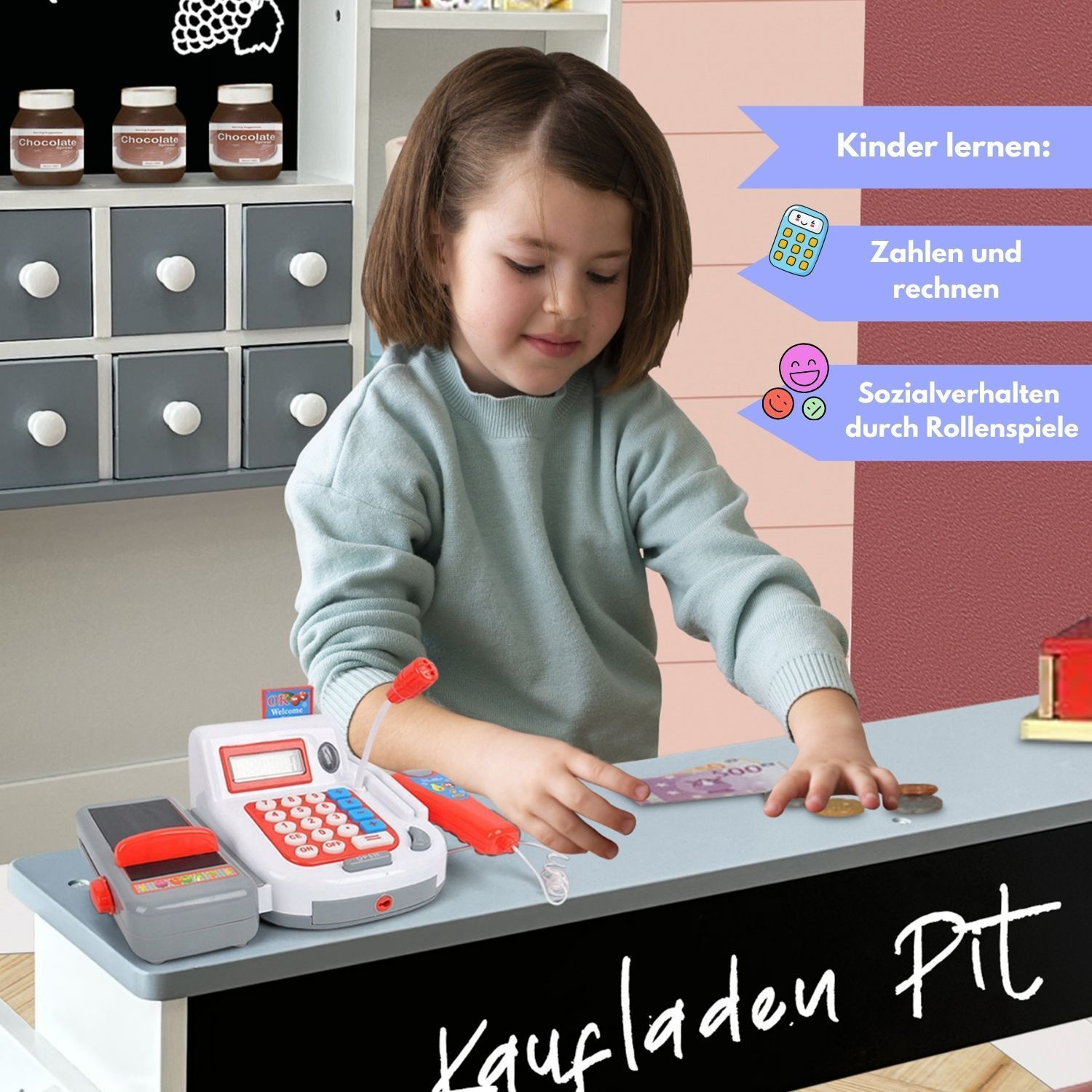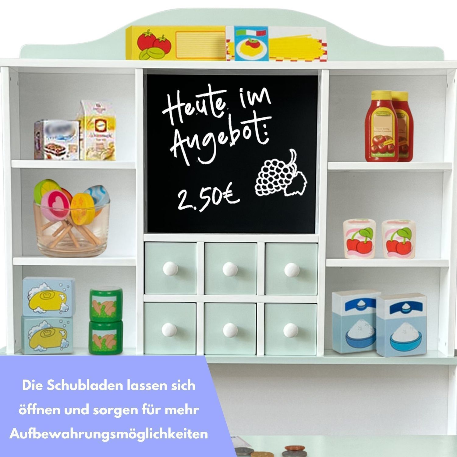 Coemo Kaufladen Pit aus Holz mit Preisschildern, wahlweise mit Spielkasse Linus
