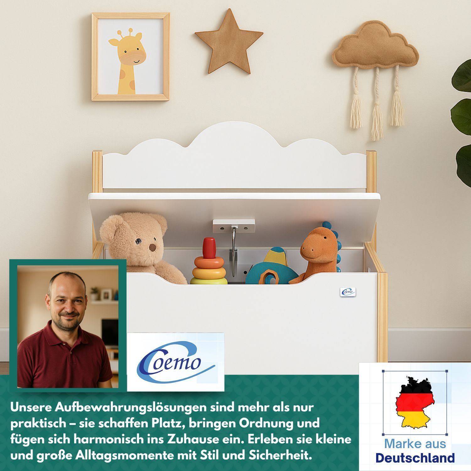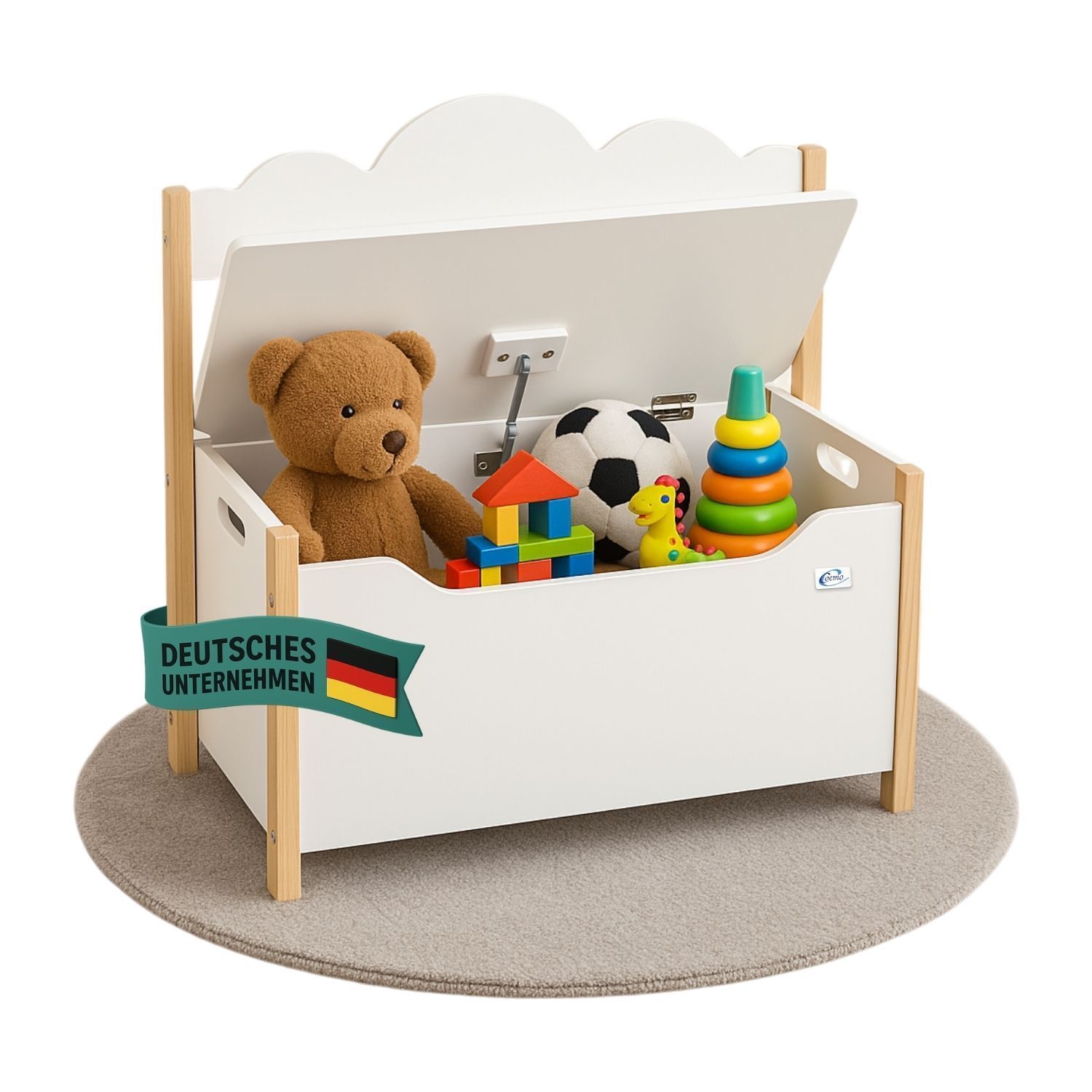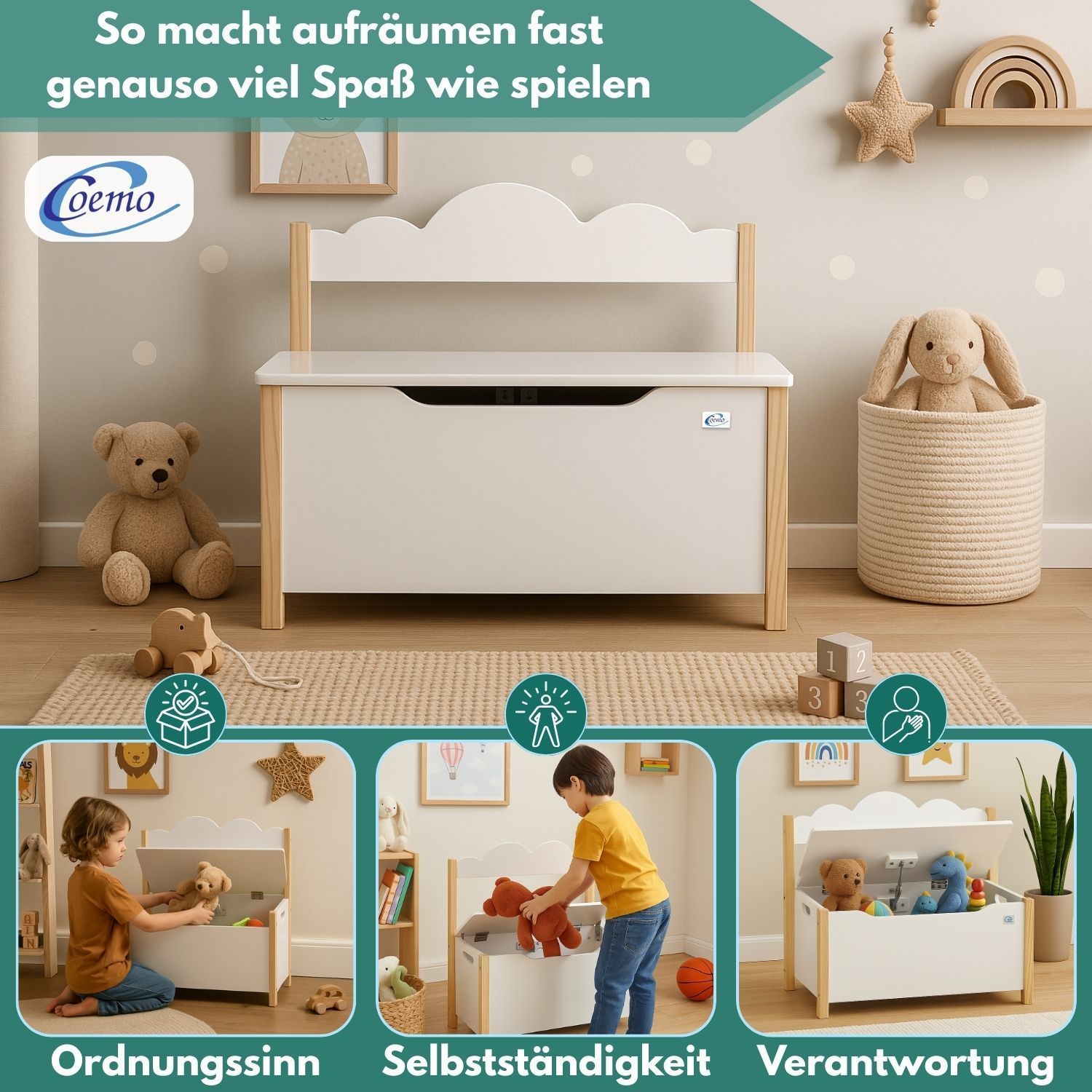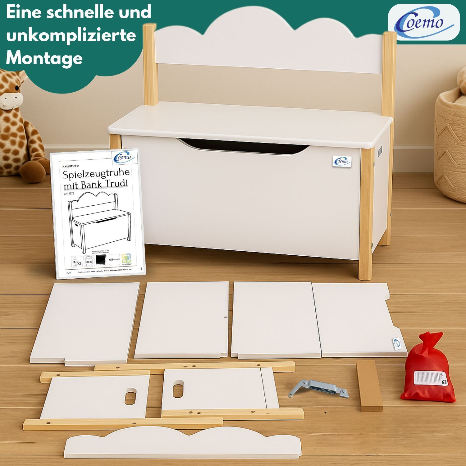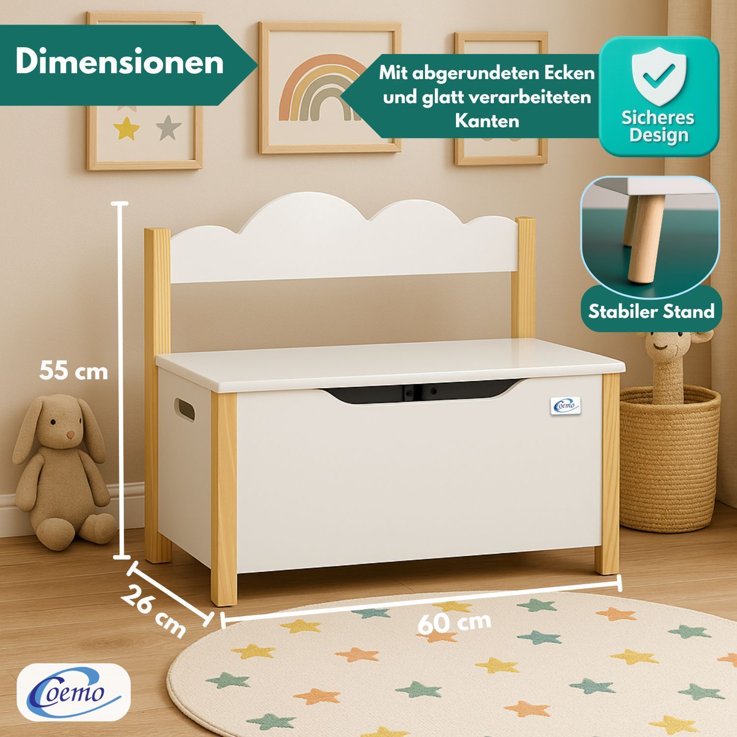 Coemo Spielzeugtruhe mit Bank TRUDI Kindersitzbank aus Holz 60×26×55 cm