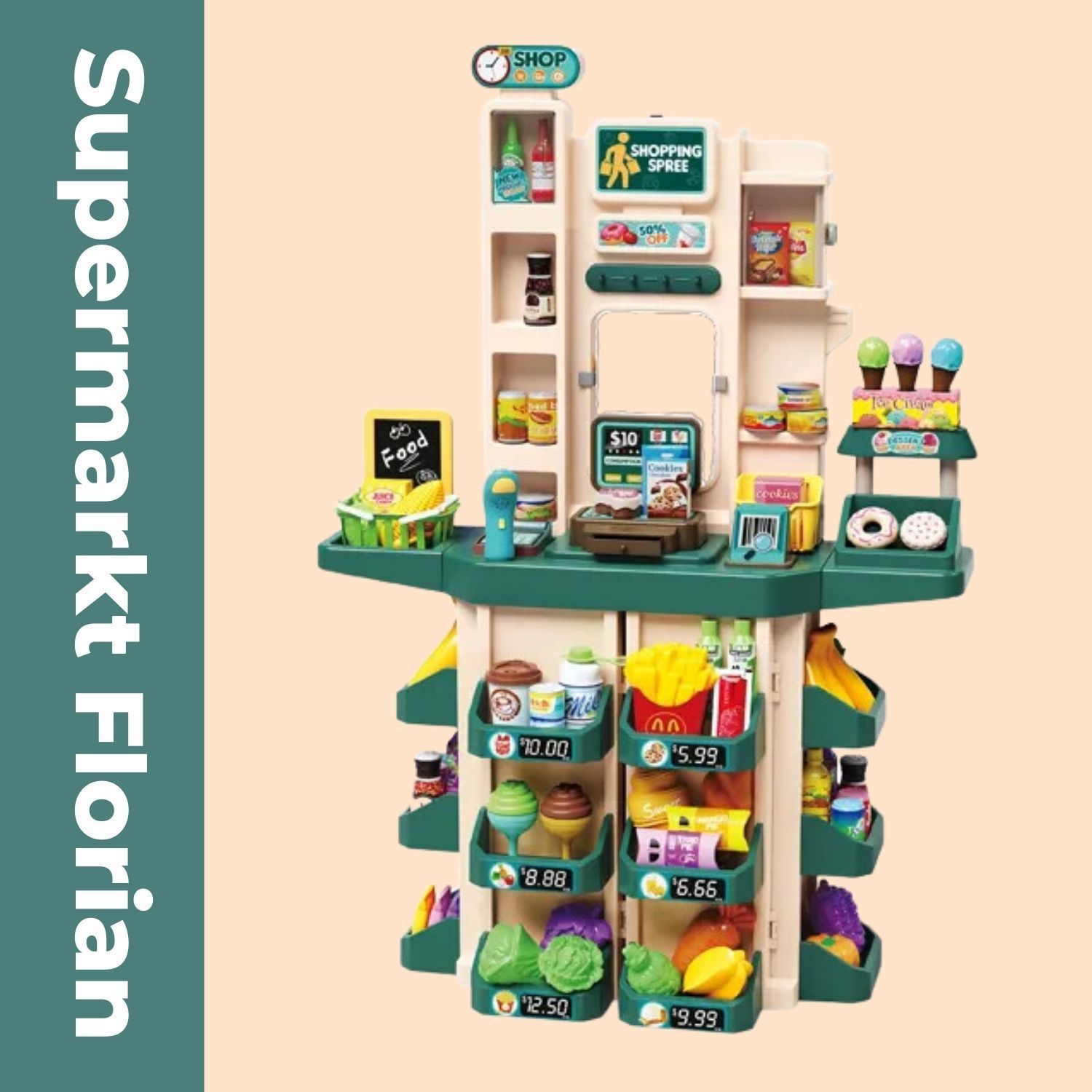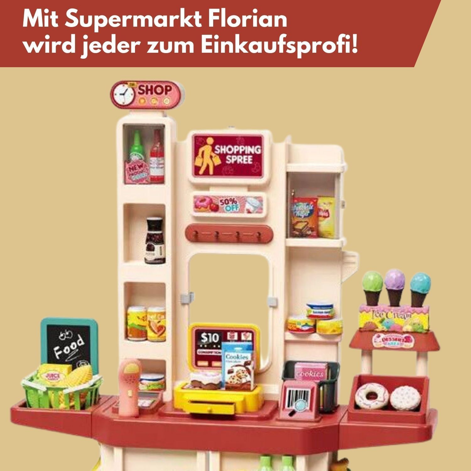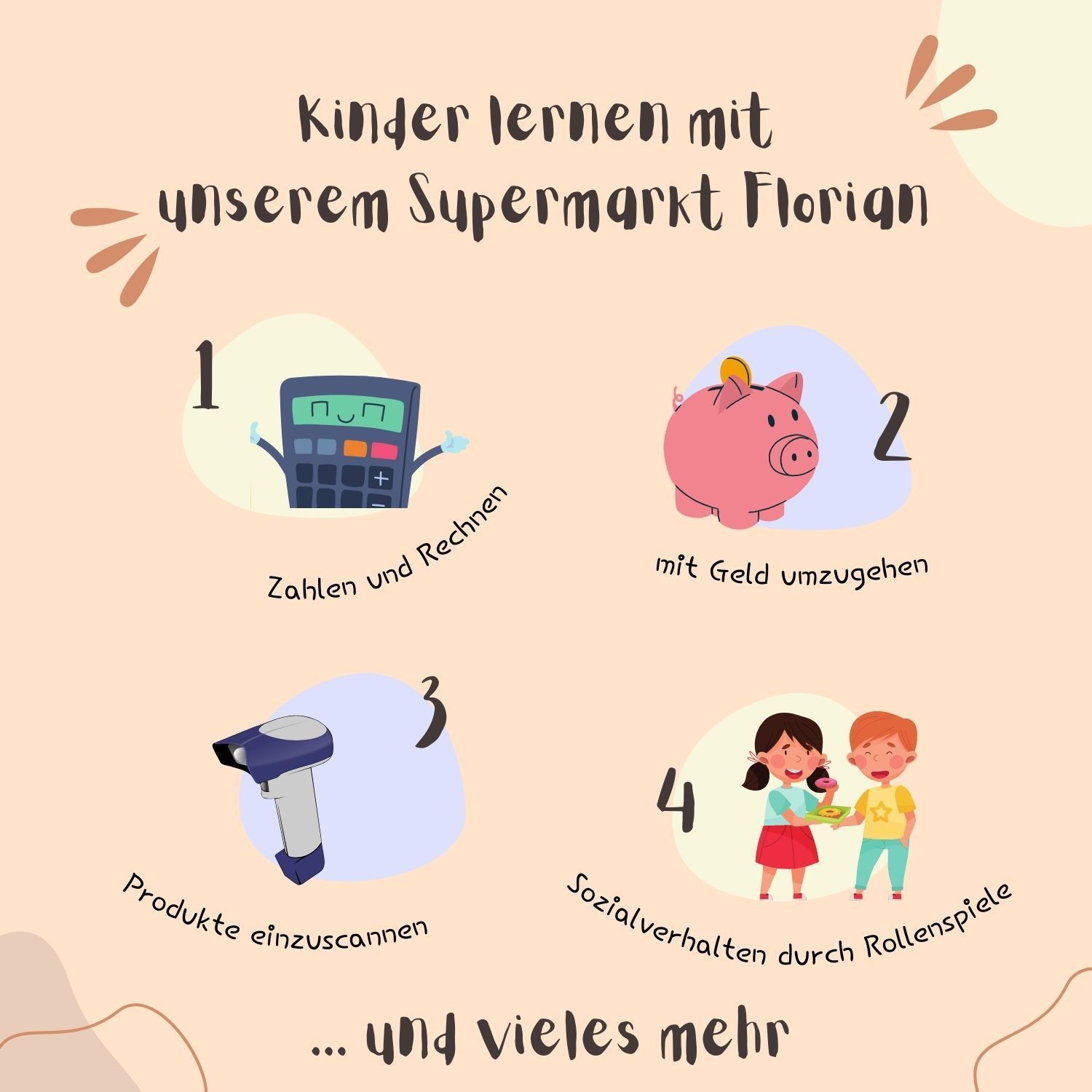 Garantierter Spielspaß für die ganze Familie mit dem Supermarkt Florian Der Supermarkt Florian mit vielem Spielzubehör ist ein moderner Kaufmannsladen. Hier können Kinder spielerisch ihren eigenen Lebensmittelladen führen und dabei Zahlen und Mengen kennenlernen. Egal ob hinter oder vor der Ladenthe