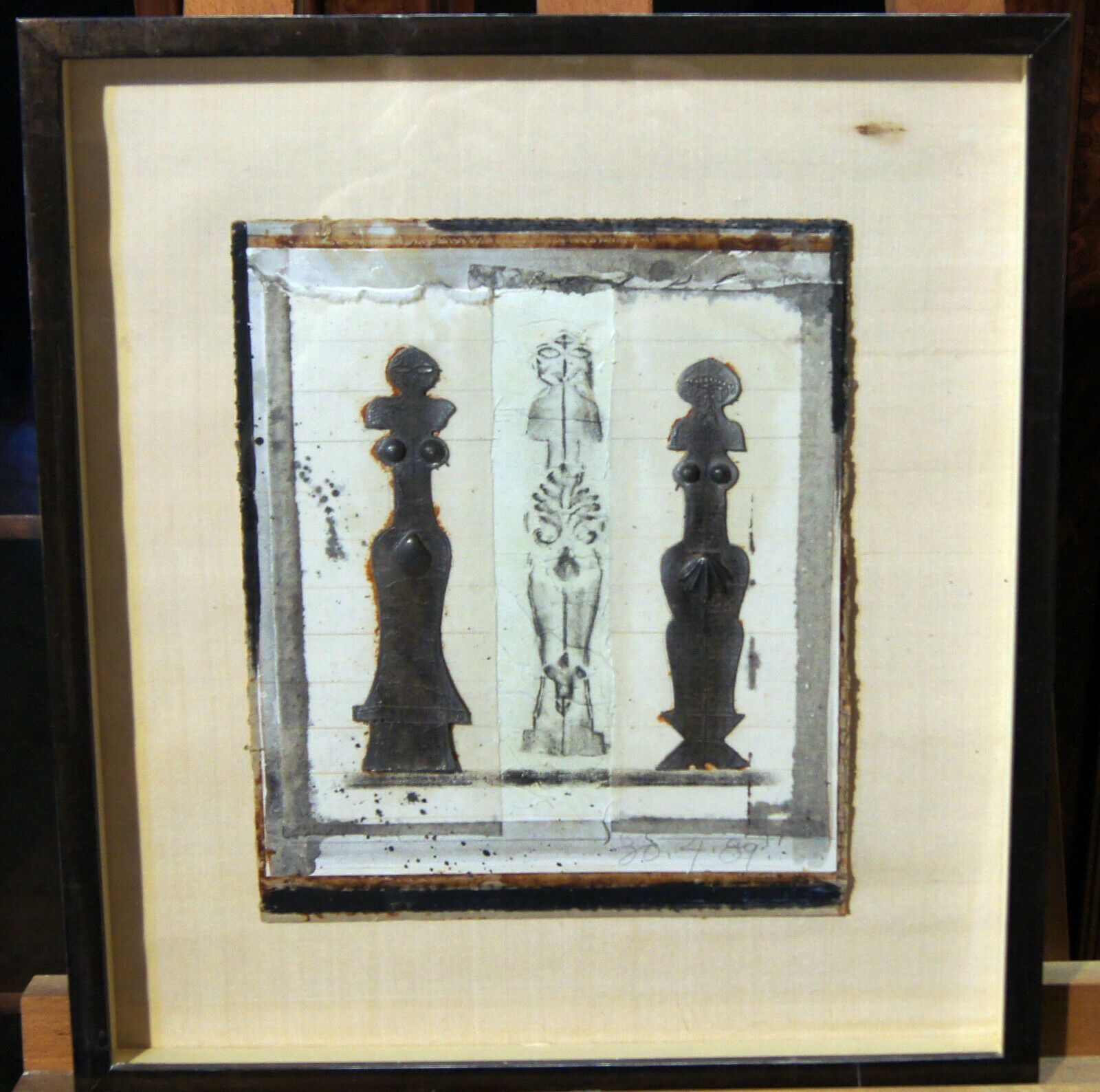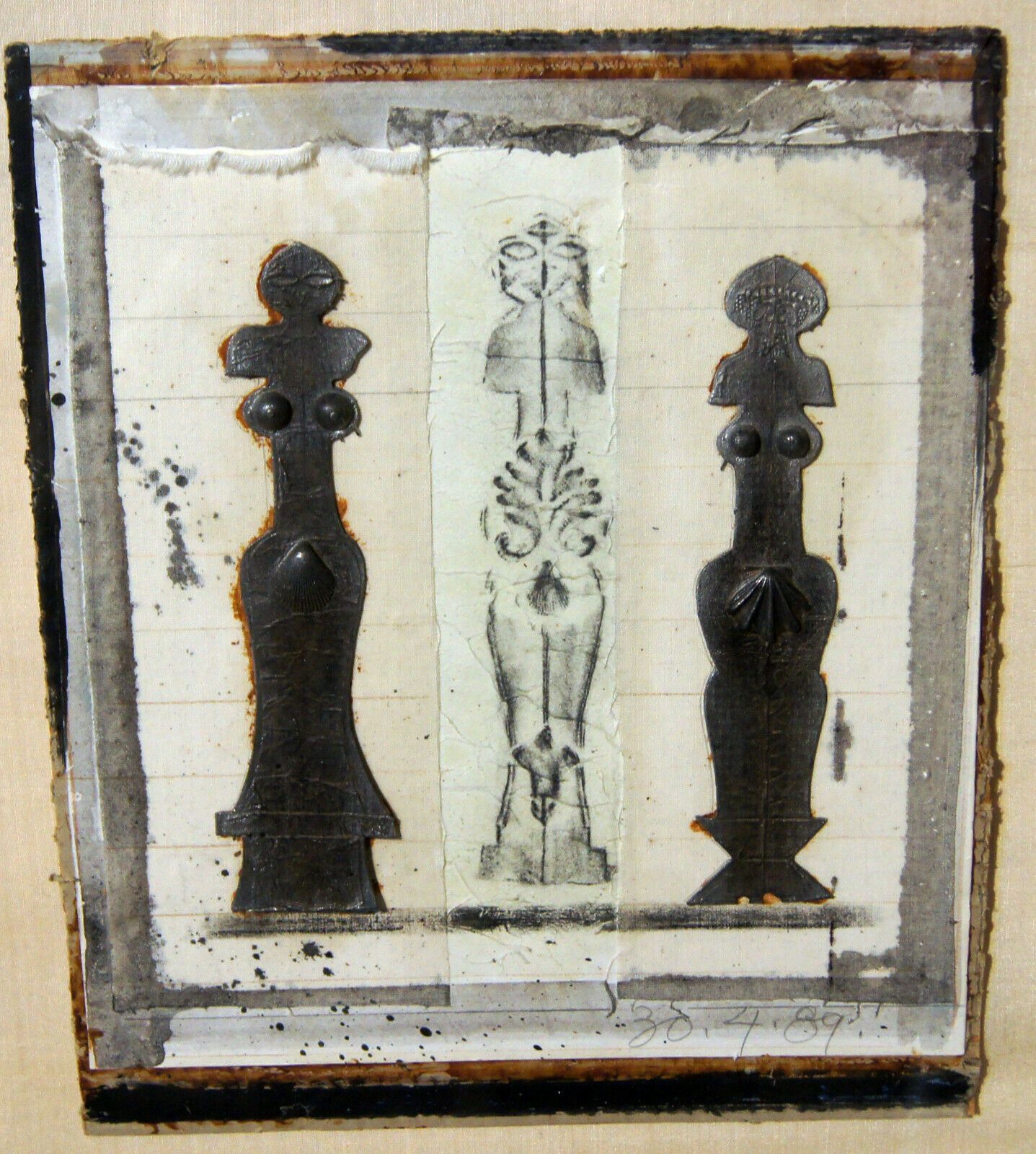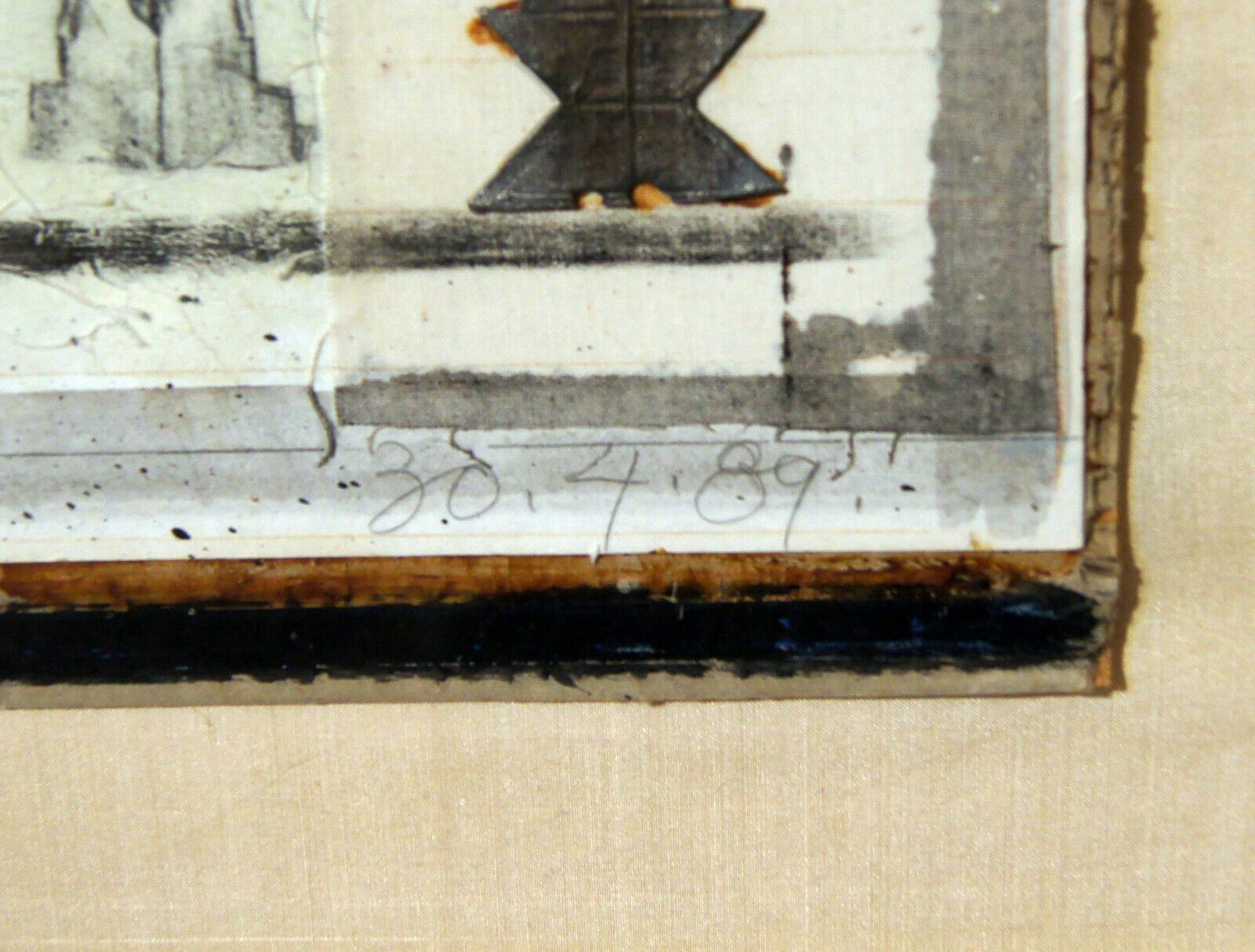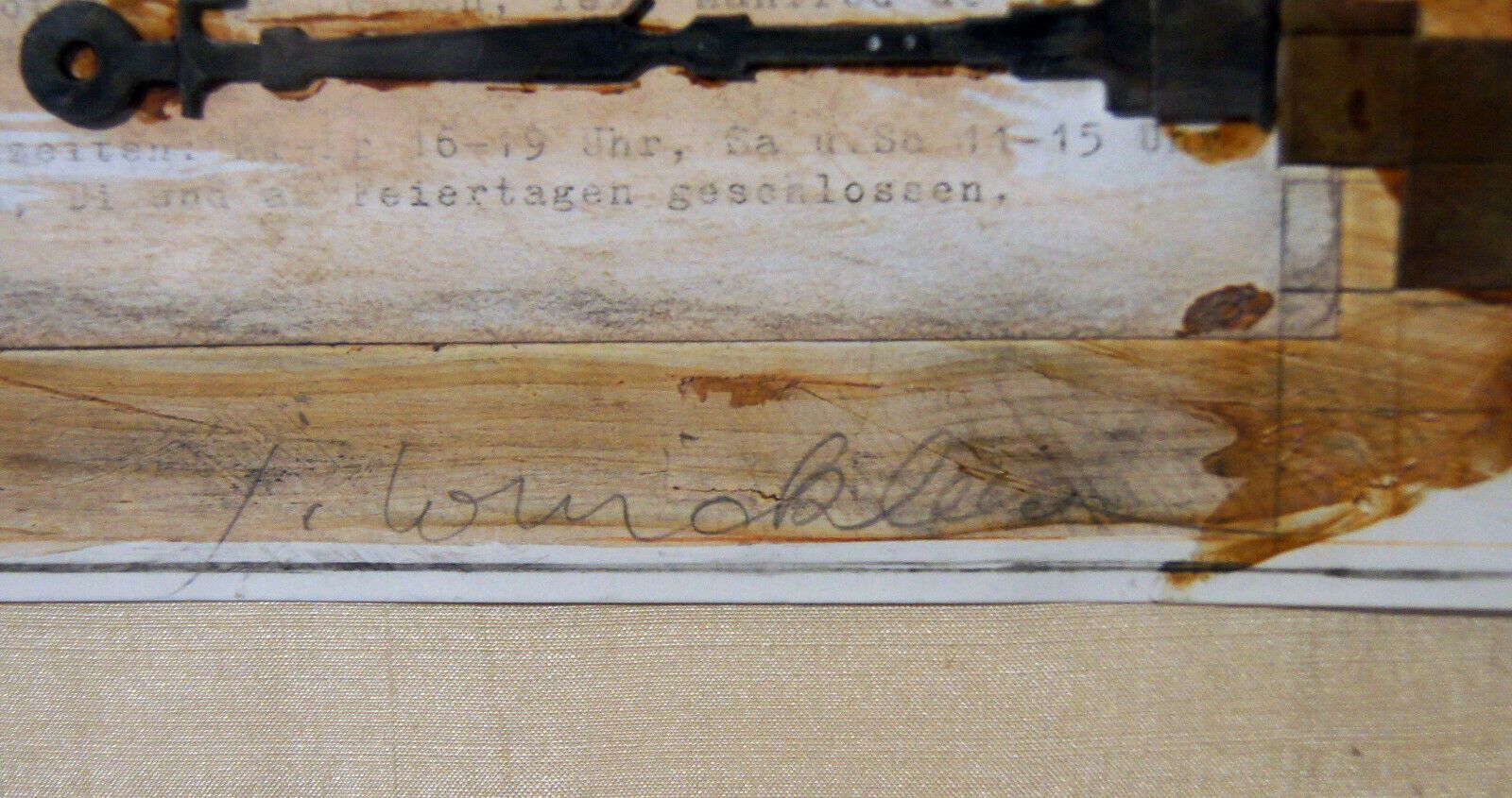 Collage von 1989. Unsigniert, aber ein ähnliches Bild wurde unleserlich signiert (siehe letztes Foto) . Material: Papier, Farbe, Eisenblech. Motiv: Figuren. Maße: Rahmen H 42, B 39 cm. Antikes am Deich - Inh: Oliver Kipp-Trense G M T Sprache erkennen Afrikaans Albanisch Arabisch Armenisch Aserbaidsc