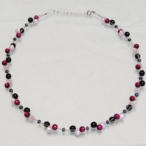 Kette aus Polaris und Glas Schwarz und Lila Das Collier besteht aus 6mm Polaris- und Glasperlen. Sowie 4mm großen Glasperlen. Aufgezogen sind die Perlen auf einem 3 reihigen Stahlseilchen. Die Kette wird mit einem Karabinerhaken sicher verschlossen. Das Schmuckstück hat eine Länge von ca. 42 cm mit einem zusätzlichen Verlängerungsstück von ca. 3 cm.