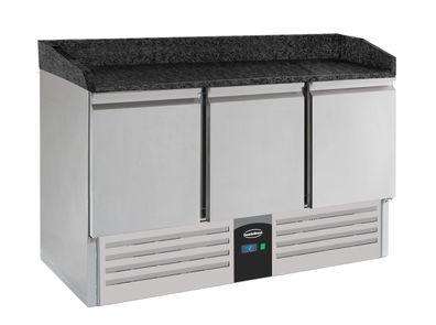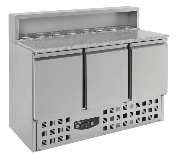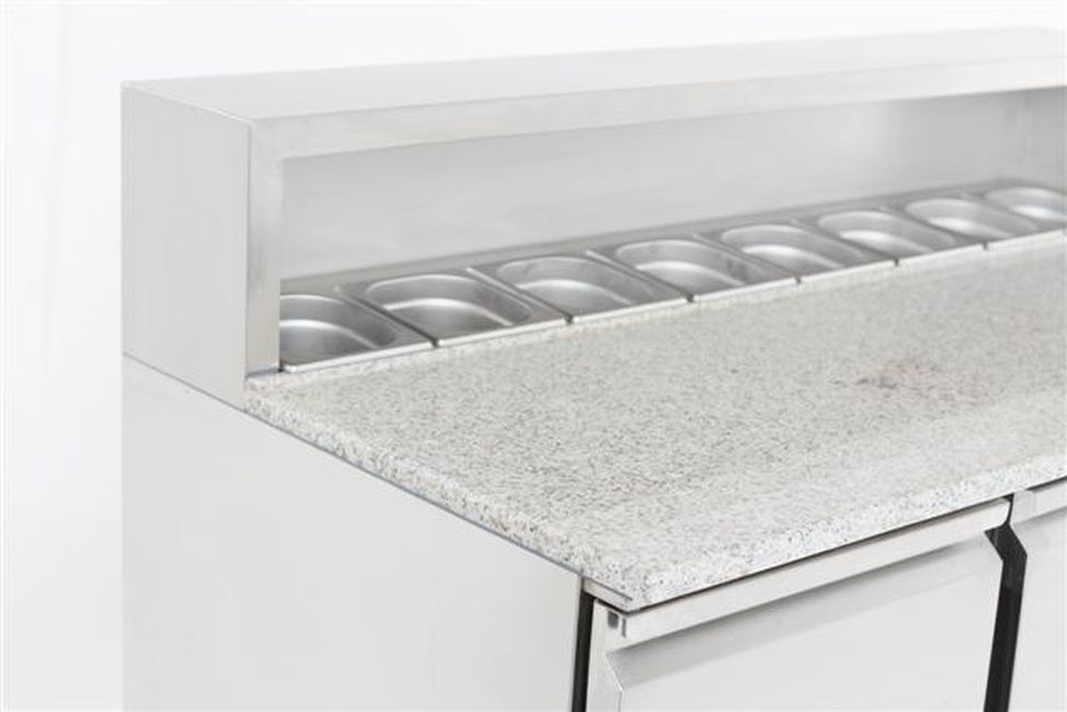 • Combisteel Pizzatisch 136 cm mit Granitplatte – 3 Türen, Kühlaufsatz für GN-Behälter