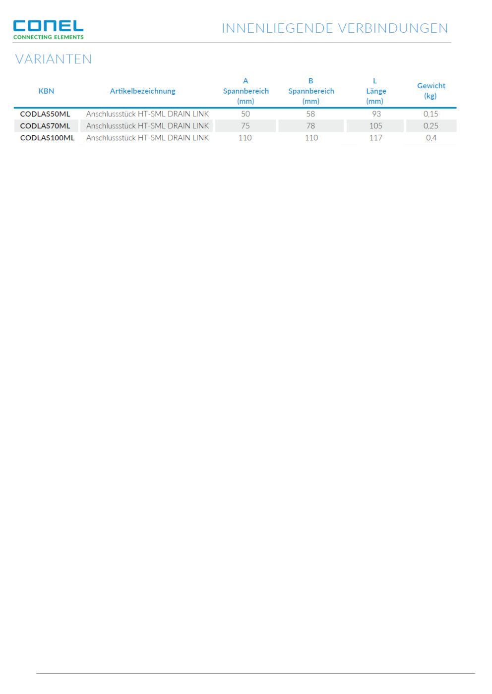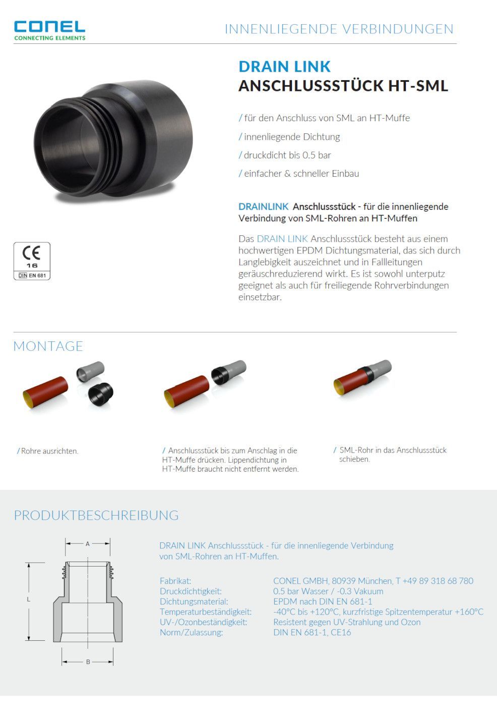 Conel Drain Link Gummi Anschlussstück DN50 für den Anschluss von SML an HT-Muffe Länge 93 mm innenliegende Dichtung druckdicht bis 0.5 bar einfacher & schneller Einbau Drain Link Anschlussstück - für die innenliegende Verbindung von SML-Rohren an HT-Muffen Das Drain Link Anschlussstück besteht a