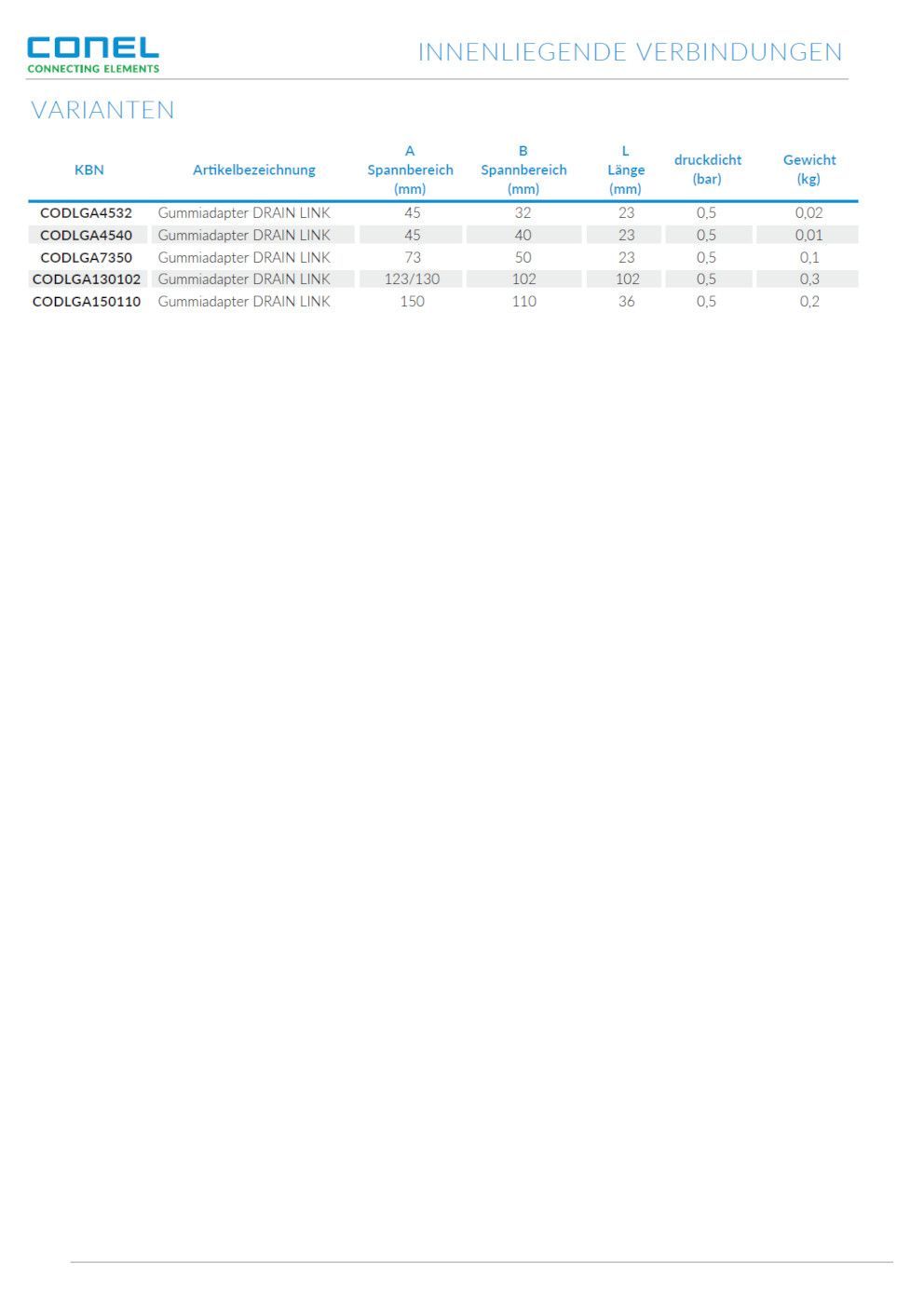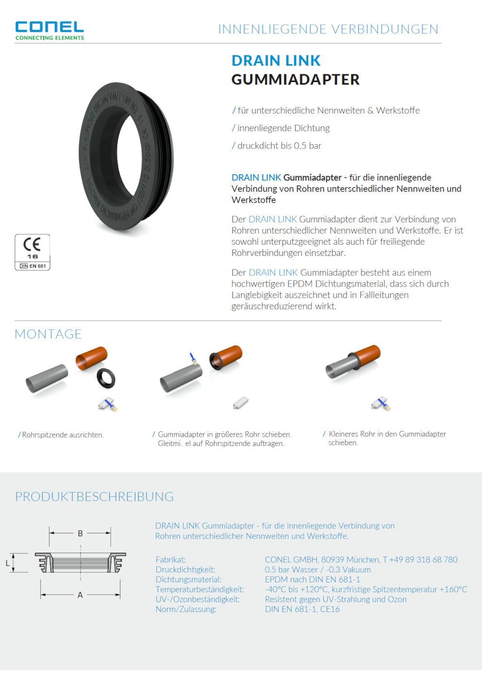 Conel Drain Link Gummiadapter 73 x 50 mm für die innenliegende Verbindung von Rohren unterschiedlicher Nennweiten und Werkstoffe druckdicht bis 0,5 bar Spannbereich 73 50 mm Länge 23 mm Sowohl unterputzgeeignet als auch für freiliegende Rohrverbindungen einsetzbar Er besteht aus einem hochwertigen E