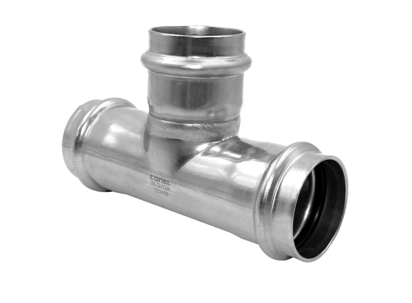 Connect Inox T-Stück 35mm Edelstahl Pressfitting verpressbar mit M- und V- Kontur hochwertige Edelstahllegierung 1.4404 extrem hohe Korrosionsbeständigkeit DVGW geprüft