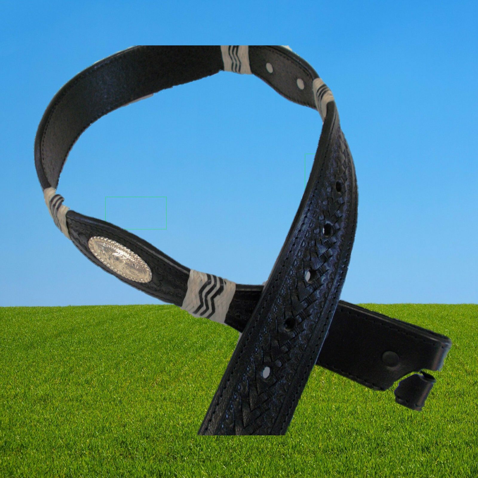 Continental Ledergürtel ohne Gürtelschnalle, schwarz Sehr hochwertiger punzierter Ledergürtel Dickes robustes Leder Schnalle mittels Druckknopf wechselbar (für Buckles geeignet) Mit Silber Concho und Rohhaut Flecht Verzierungen im Leder Der Gürtel wird ohne Gürtelschnalle geliefert. Sie können eine