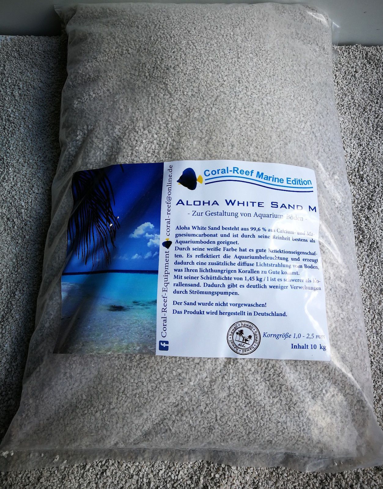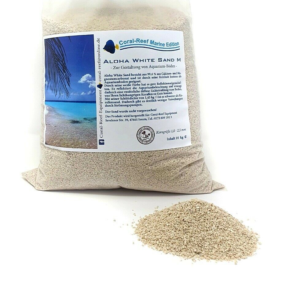Coral Reef Aloha White Sand M 1,0-2,5mm - 10kg Artikelbeschreibung: Aloha White Sand Größe M 1,0-2,5mm schneeweißer Bodengrund für Ihr Aquarium Aloha White Sand besteht aus 99,6 % Calcium- und Magnesiumcarbonat und ist durch seine Reinheit bestens als Aquariumboden geeignet. Durch seine weiße Farbe