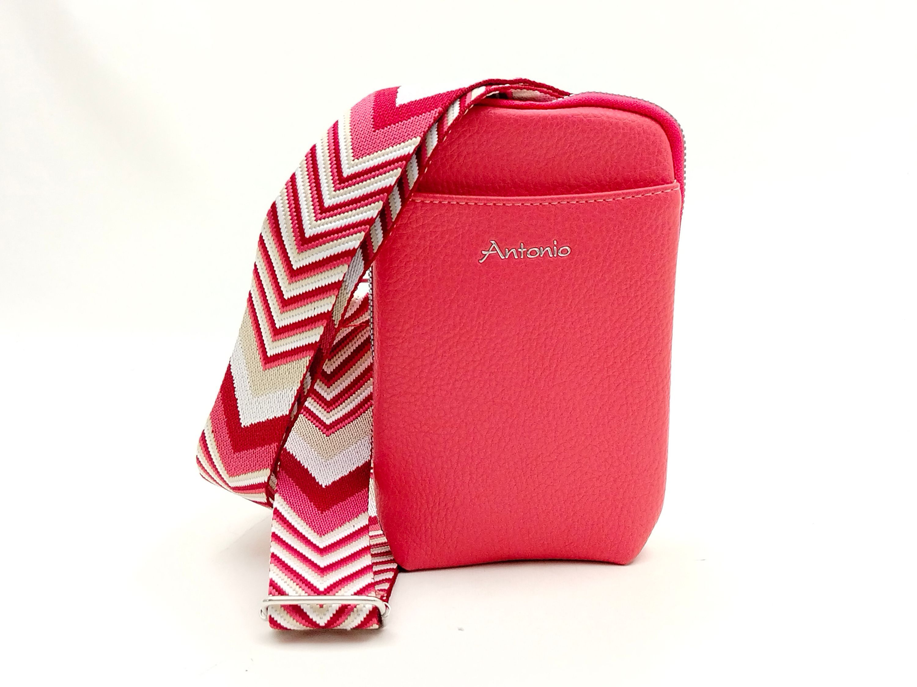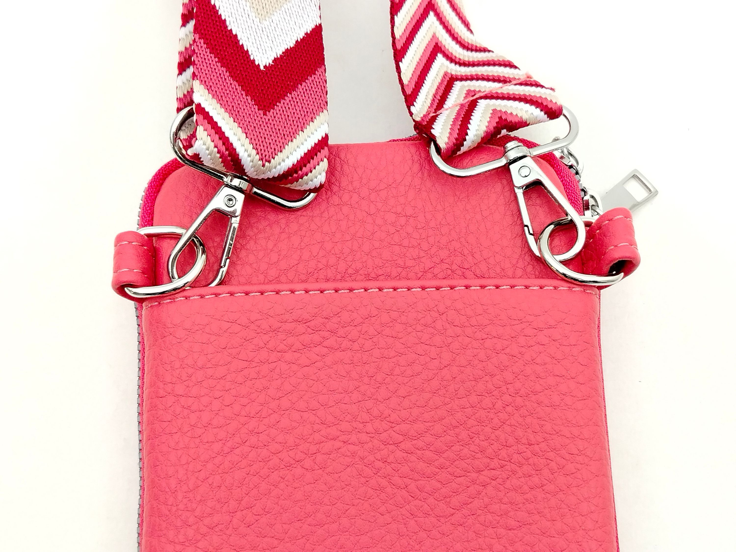 Coralfarbene Handytasche Umhängetasche – mit gemustertem Schultergurt und Fächern