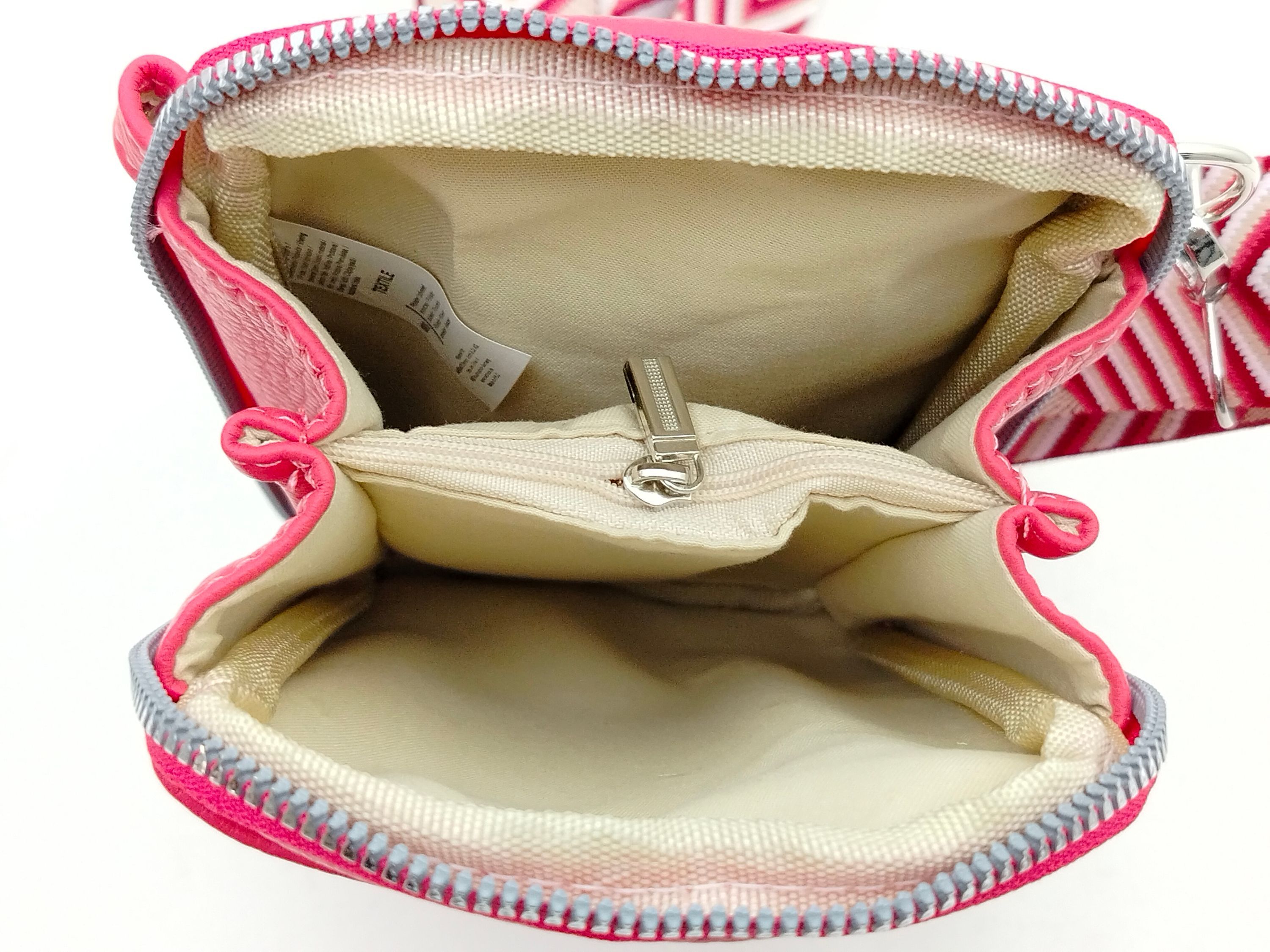Coralfarbene Handytasche – ideal für unterwegs und den Alltag Gemusterter, verstellbarer Schultergurt – flexibel tragbar Maße ca. 19 × 13 cm – passend für viele Smartphones Geteiltes Innenfach mit Innenreißverschluss für sichere Aufbewahrung Steckfächer vorne und hinten für schnellen Zugriff Metall-Reißverschluss – stilvoll und robust