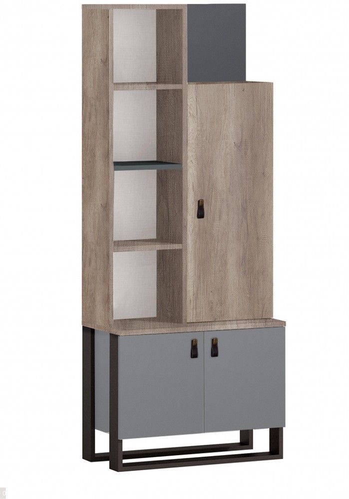 Corner Bücherregal 3-türig in Grau Holzoptik COR-BR 1x Bücherregal Corner 1x Türe, Holzoptik 2x Türe, Grau 4x offenes Fach Griffe aus Leder B H T: ca. 70x175x37 cm Die Ware wird zerlegt geliefert. _______________________________________________________________________________________________________