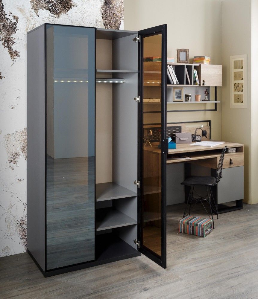 Corner Schrank 2 Glas Türen in Grau COR-02 Im Angebot enthalten: 1x Schrank Corner 1x Kleiderstange 2x Glas Türen 6x Ablagen Maße : B H T 204 x 60 x 89 cm Produktinformation: Modular Erweiterbar Farbe: Grau besondere Griffe in Schwarz Optional erhältlich: Jedes Element einzeln oder als Kinderzimmer