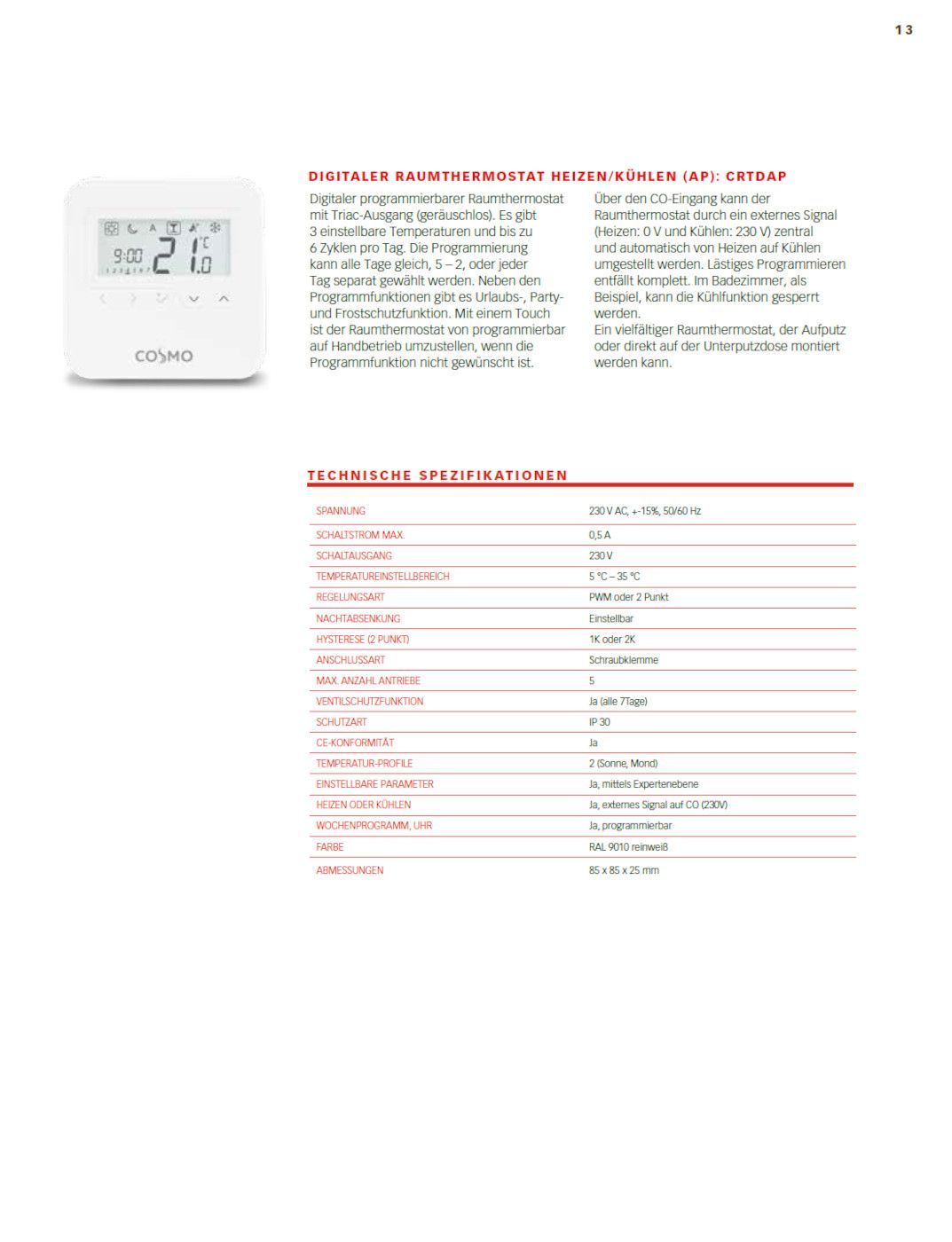 Cosmo Digital-Raumthermostat 230V AP programmierbar RAL9010