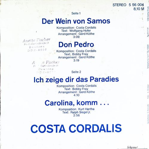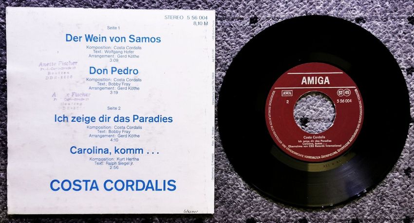 Im Privatangebot aus Auflösung meines Schallplatten-Schrankes eine Vinyl (Quartett)-Single (4 Titel!): Costa Cordalis: Der Wein von Samos, Don Pedro, Ich zeige dir das Paradies, Carolina, komm... 1981, AMIGA 556004, DDR GDR Optische Bewertung: Vinyl: 1+ nm near mint, Keine oder so gut wie keine rele
