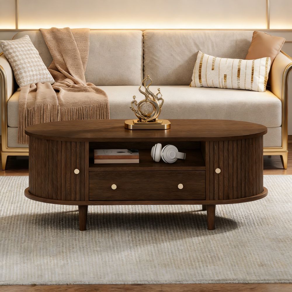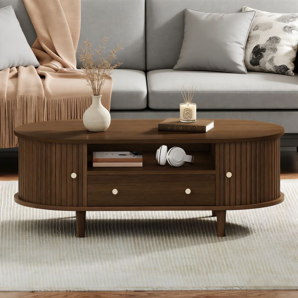 Wohnzimmertisch in Walnussfarbe aus MDF. Maße: 100 x 50 x 36 cm. Mit 1 Schublade, offenem Stauraum und Rolltür. Ideal als Couchtisch, Sofatisch oder Beistelltisch. Stabile Konstruktion mit 4 Stützbeinen. Paketmaße: 116,69 x 59,99 x 11,81 cm. Paketgewicht: 21,75 kg.