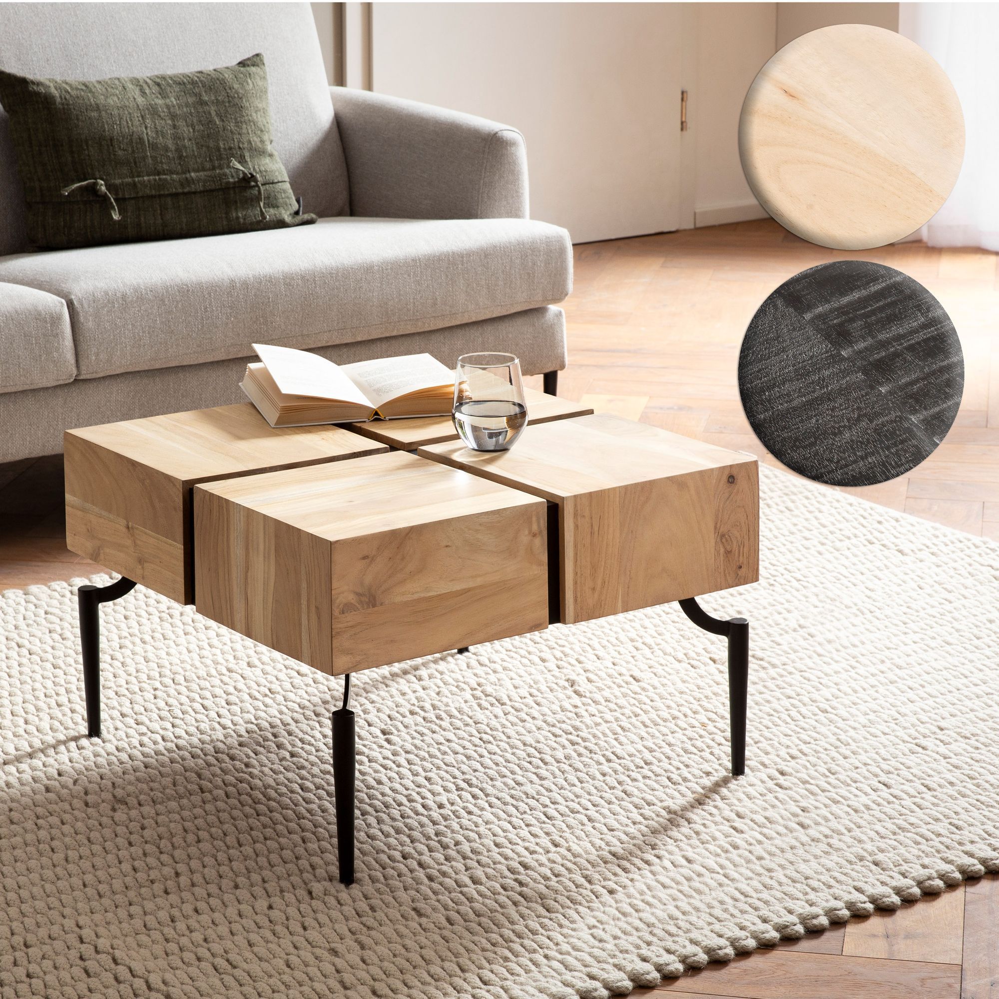 FineBuy Couchtisch Akazie Massivholz quadratisch 60x60 cm · moderner Wohnzimmertisch 4 Blocks · Design Tisch mit Metallbeinen im Industrial Cube Stil