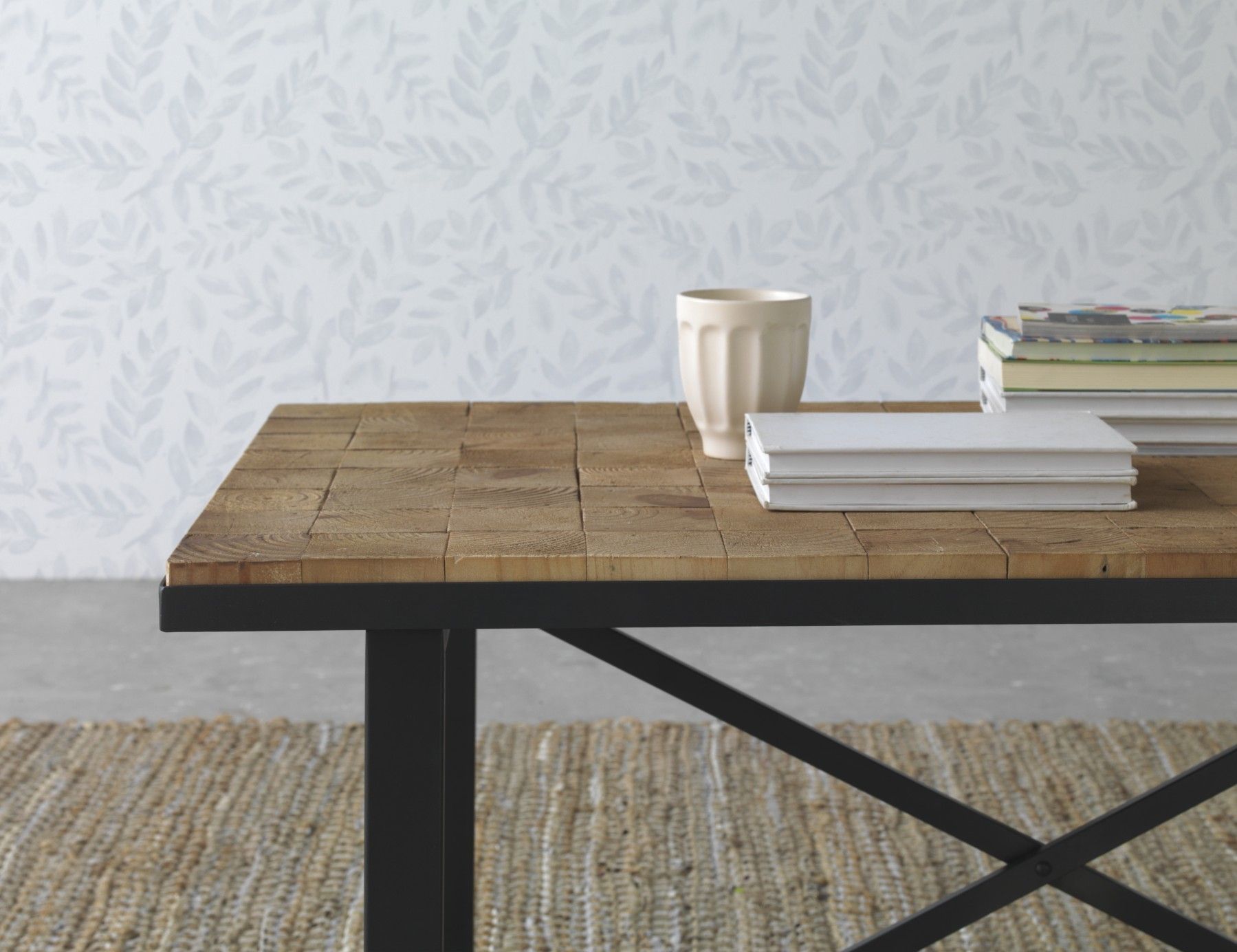 Couchtisch aus Holz mit schwarzen Metallbeinen