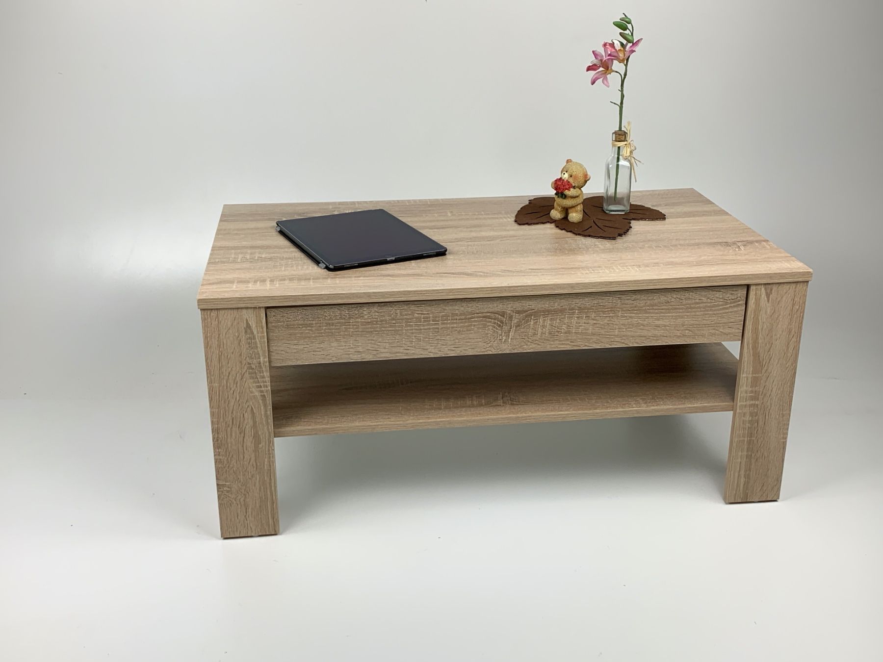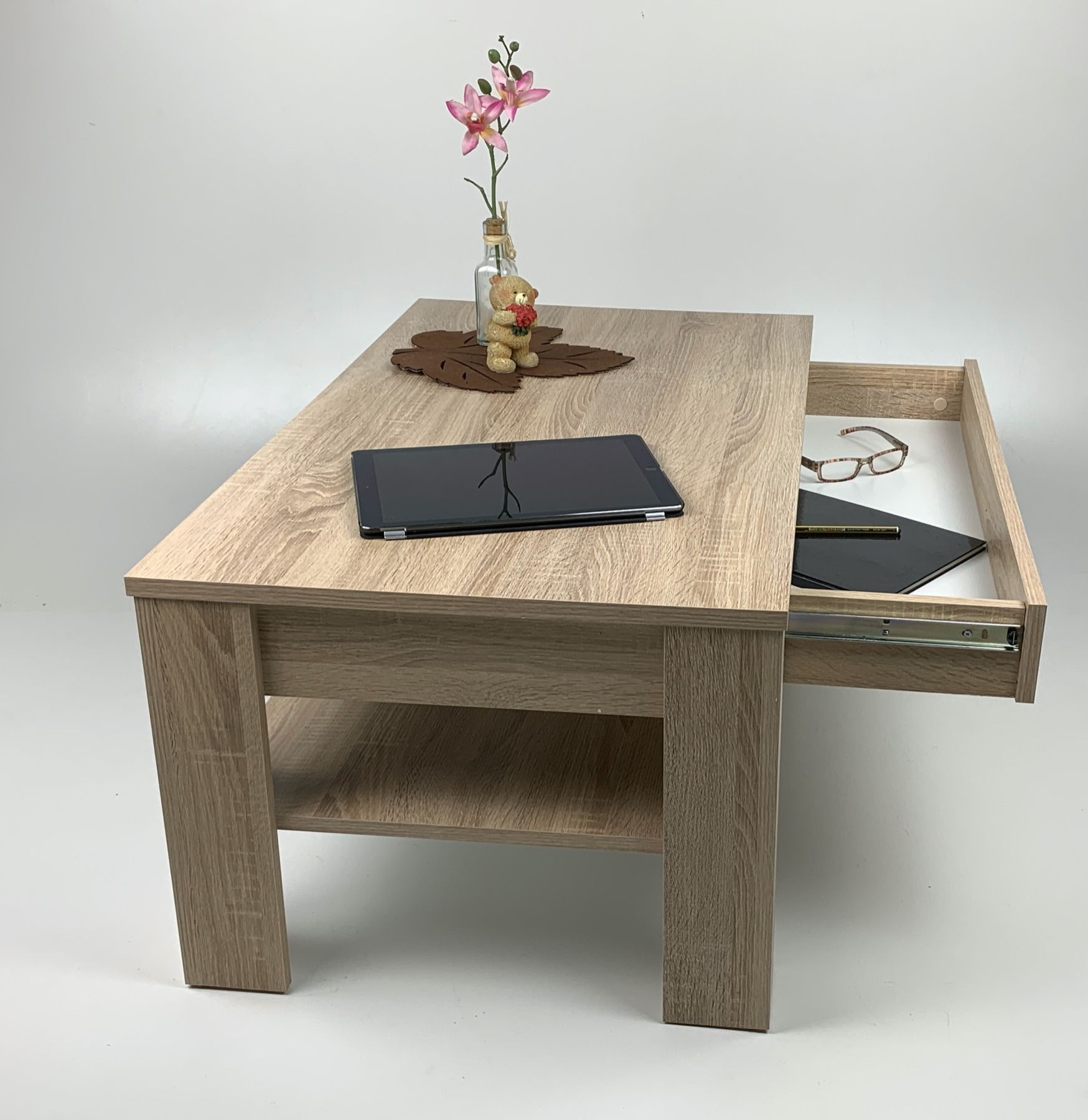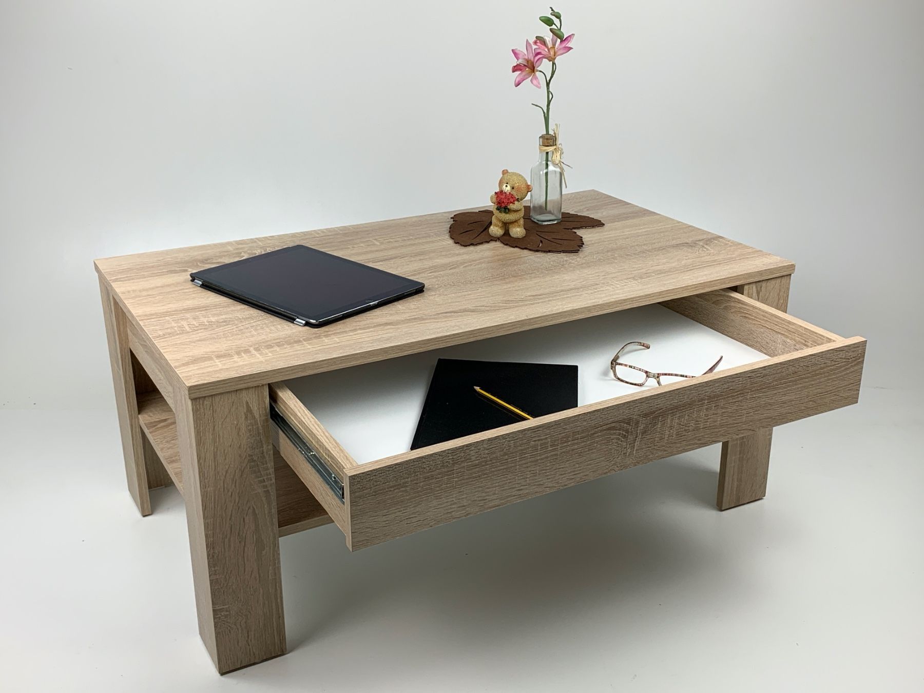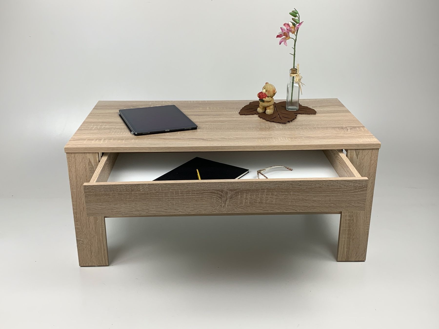 Couchtisch Ewa Sonoma Eiche hell Sägerau mit Schublade und Ablage . Made in Germany