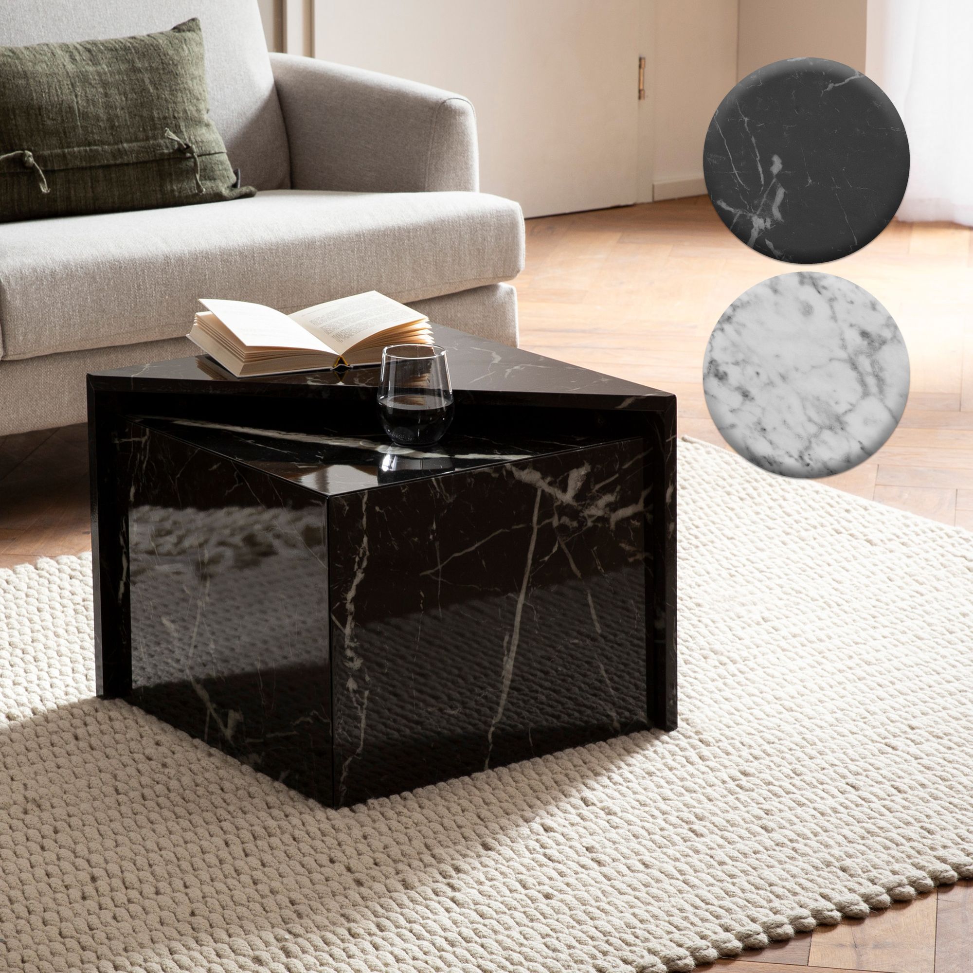 FineBuy Couchtisch 2er Set MONOBLOC Hochglanz Sofatisch mit Marmor Optik, Design Satztisch Eckig, Wohnzimmertisch Ineinanderschiebbar, Lounge Verschachtelungstisch Beistelltisch Klein