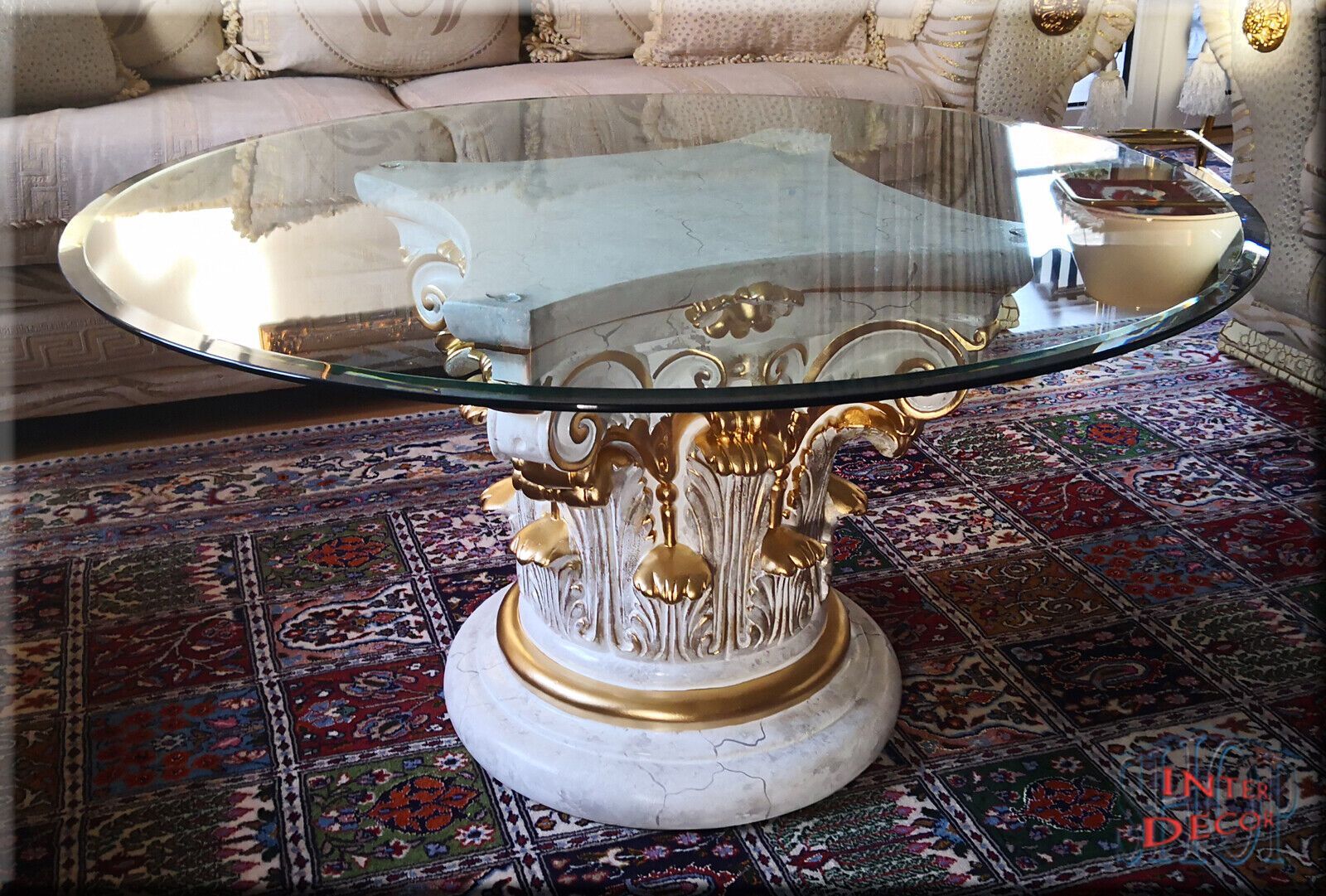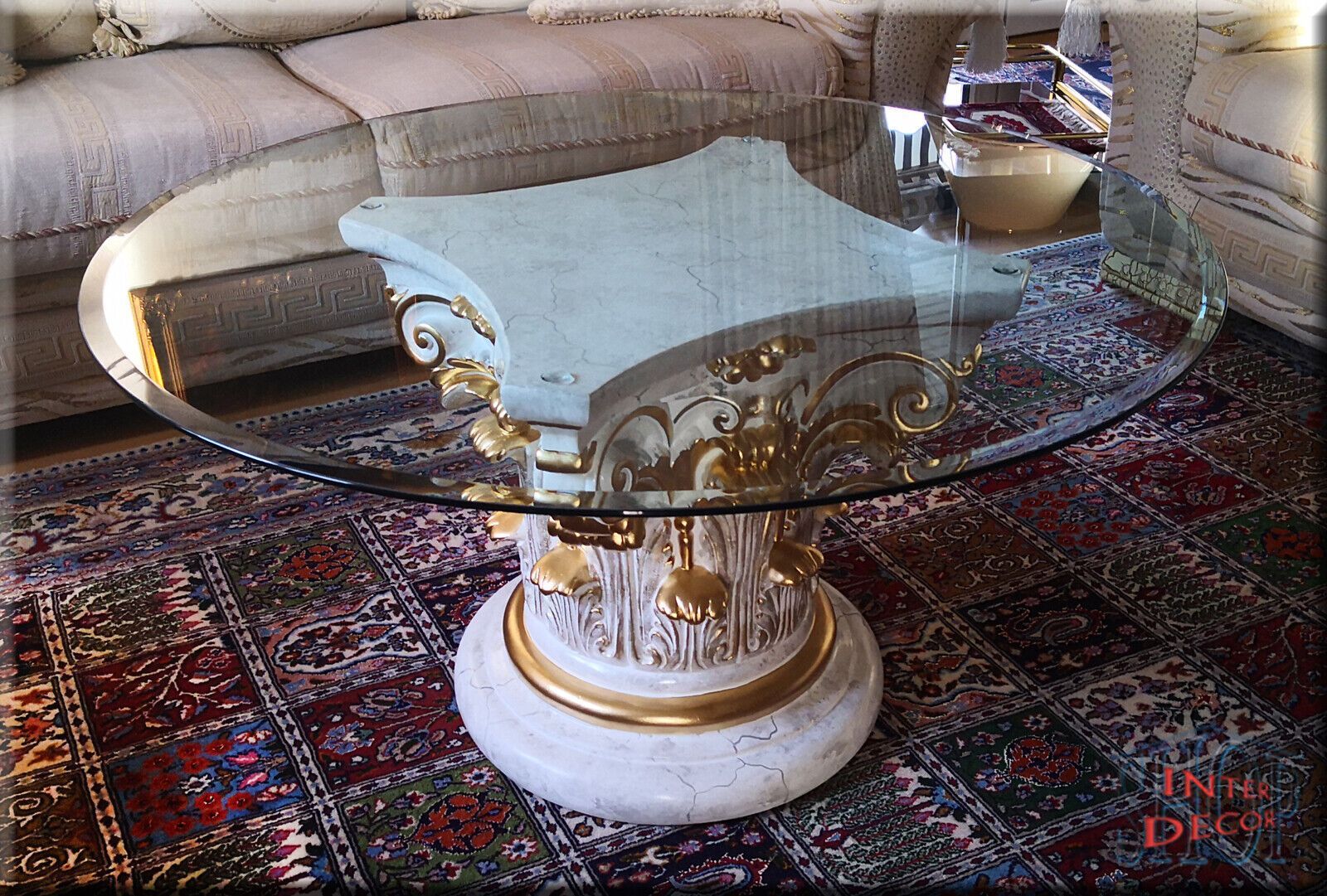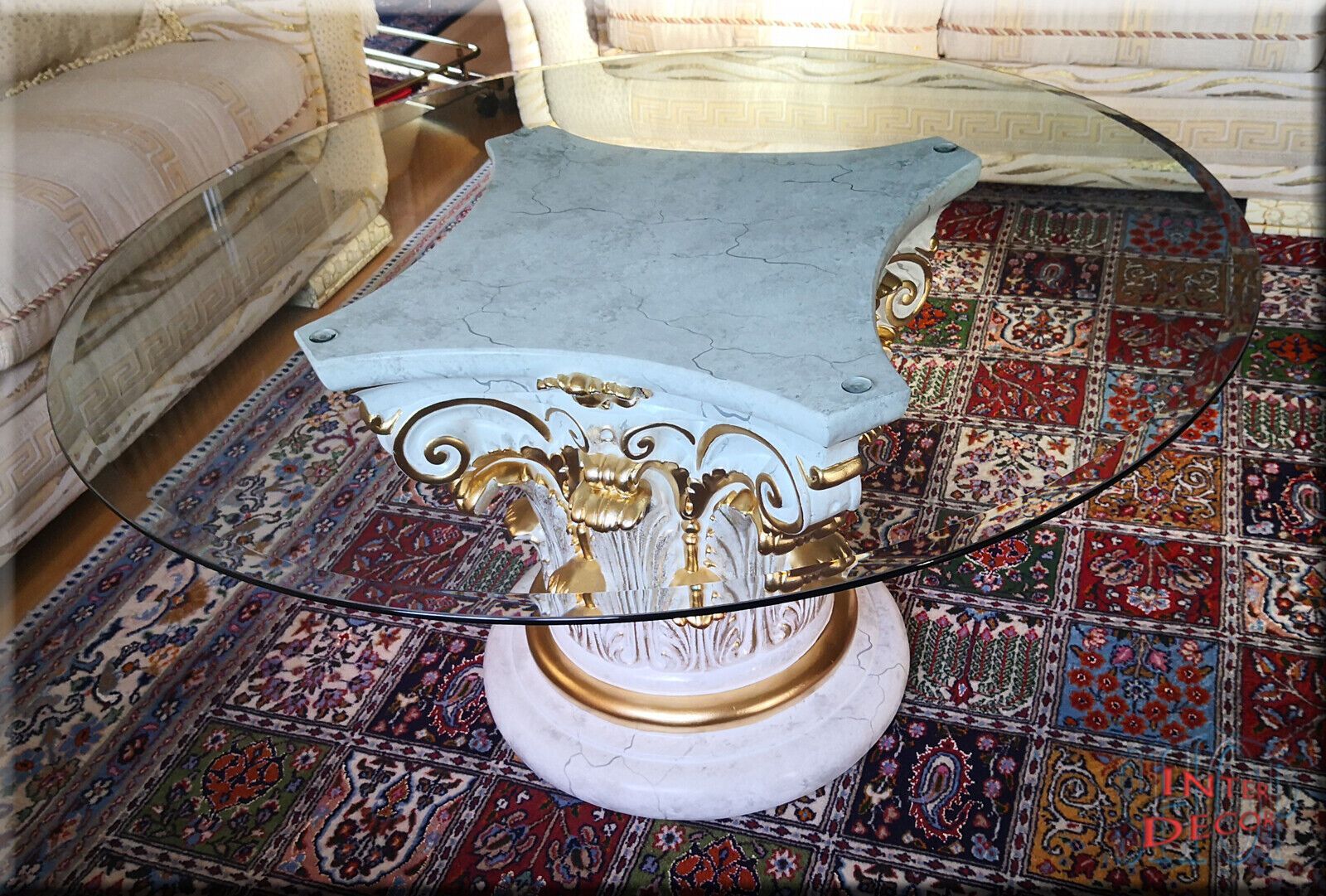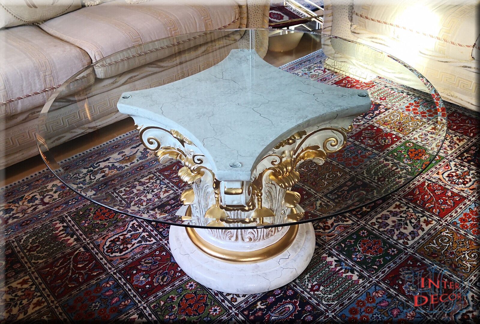 Couchtisch Glas Glastisch Wohnzimmertisch Säulen Design Antik Marmor Optik 100cm