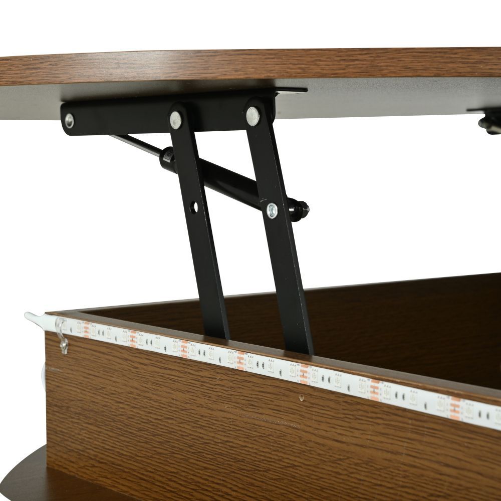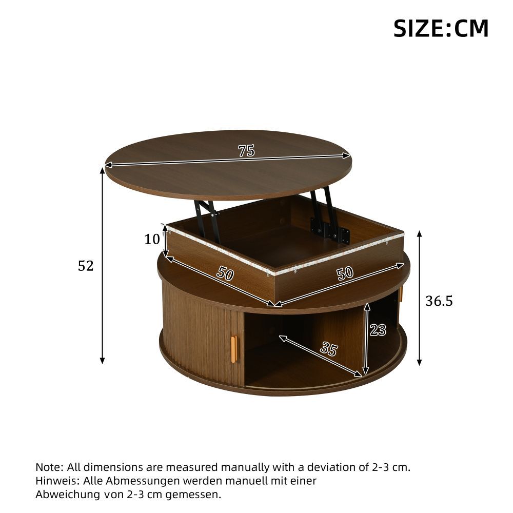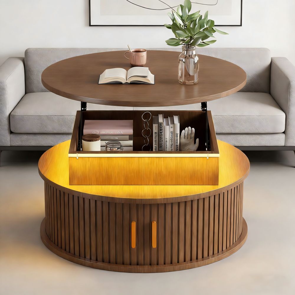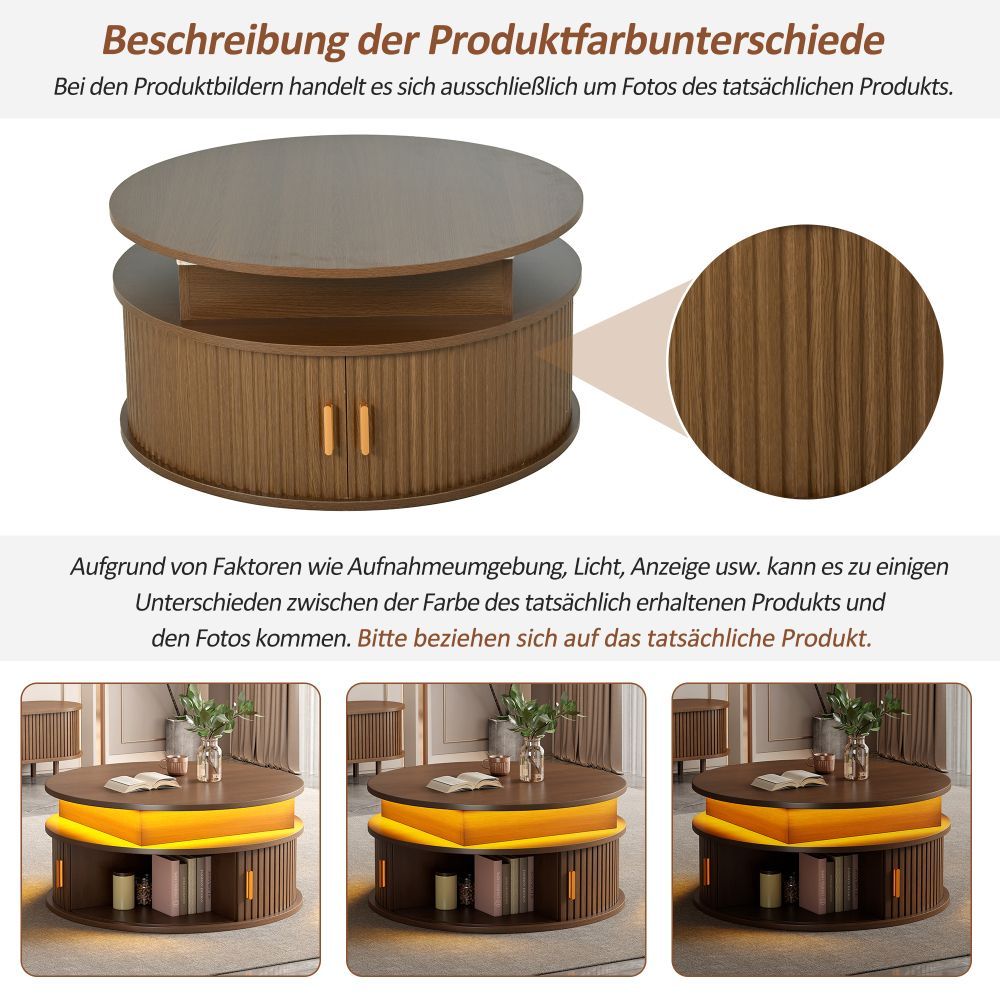 Runder Couchtisch aus MDF mit höhenverstellbarer Funktion und integrierter LED-Beleuchtung. Der Tisch verfügt über zwei Rolltüren und bietet praktischen, versteckten Stauraum. Ideal als Sofatisch, Beistelltisch oder Teetisch für ein modernes Wohnambiente.