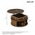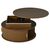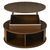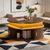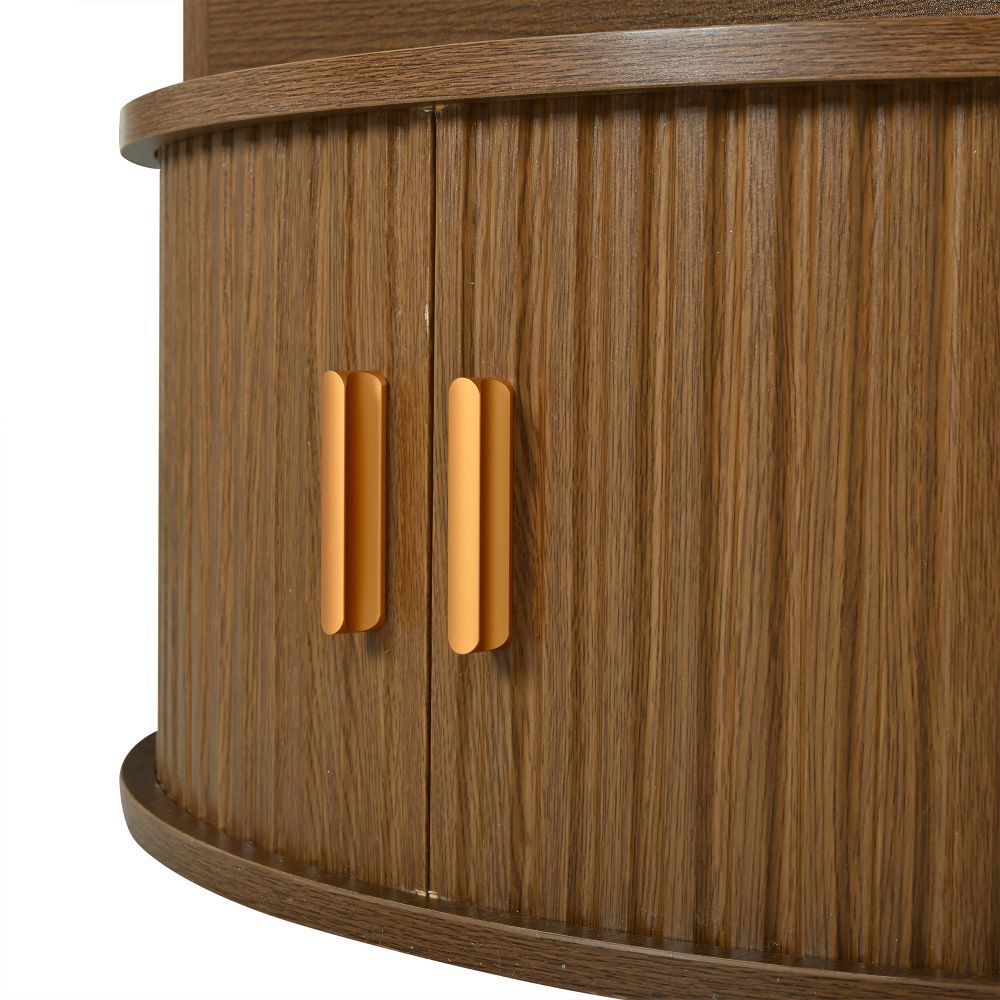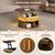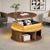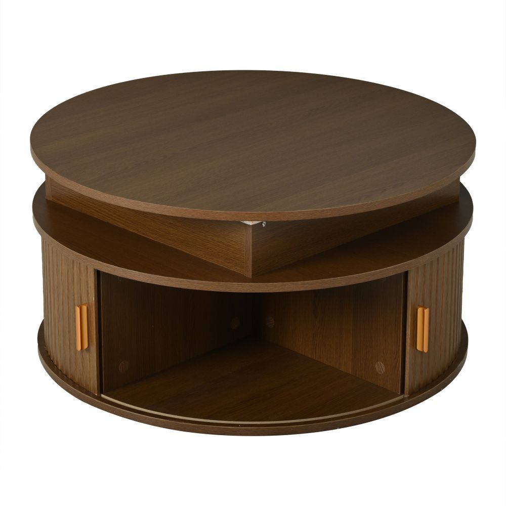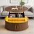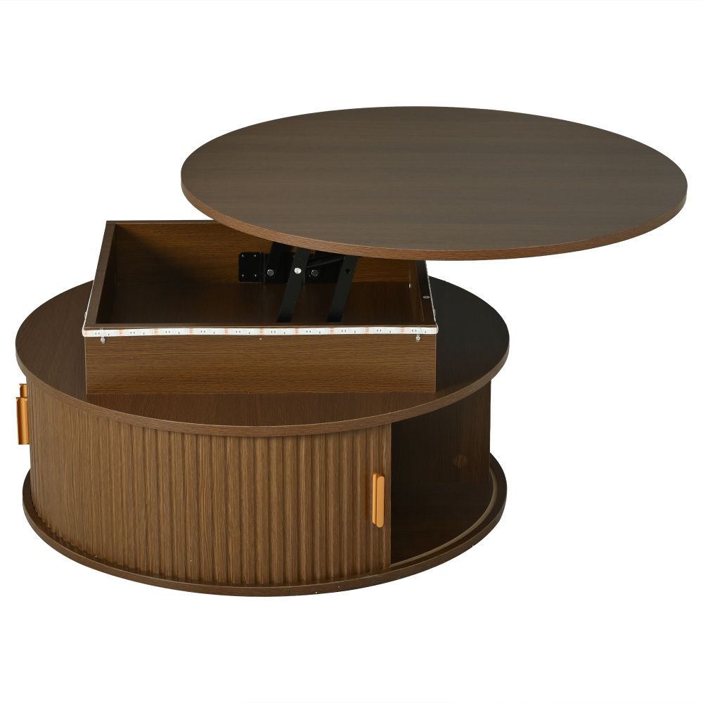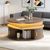 Runder Couchtisch aus MDF mit höhenverstellbarer Funktion und integrierter LED-Beleuchtung. Der Tisch verfügt über zwei Rolltüren und bietet praktischen, versteckten Stauraum. Ideal als Sofatisch, Beistelltisch oder Teetisch für ein modernes Wohnambiente.