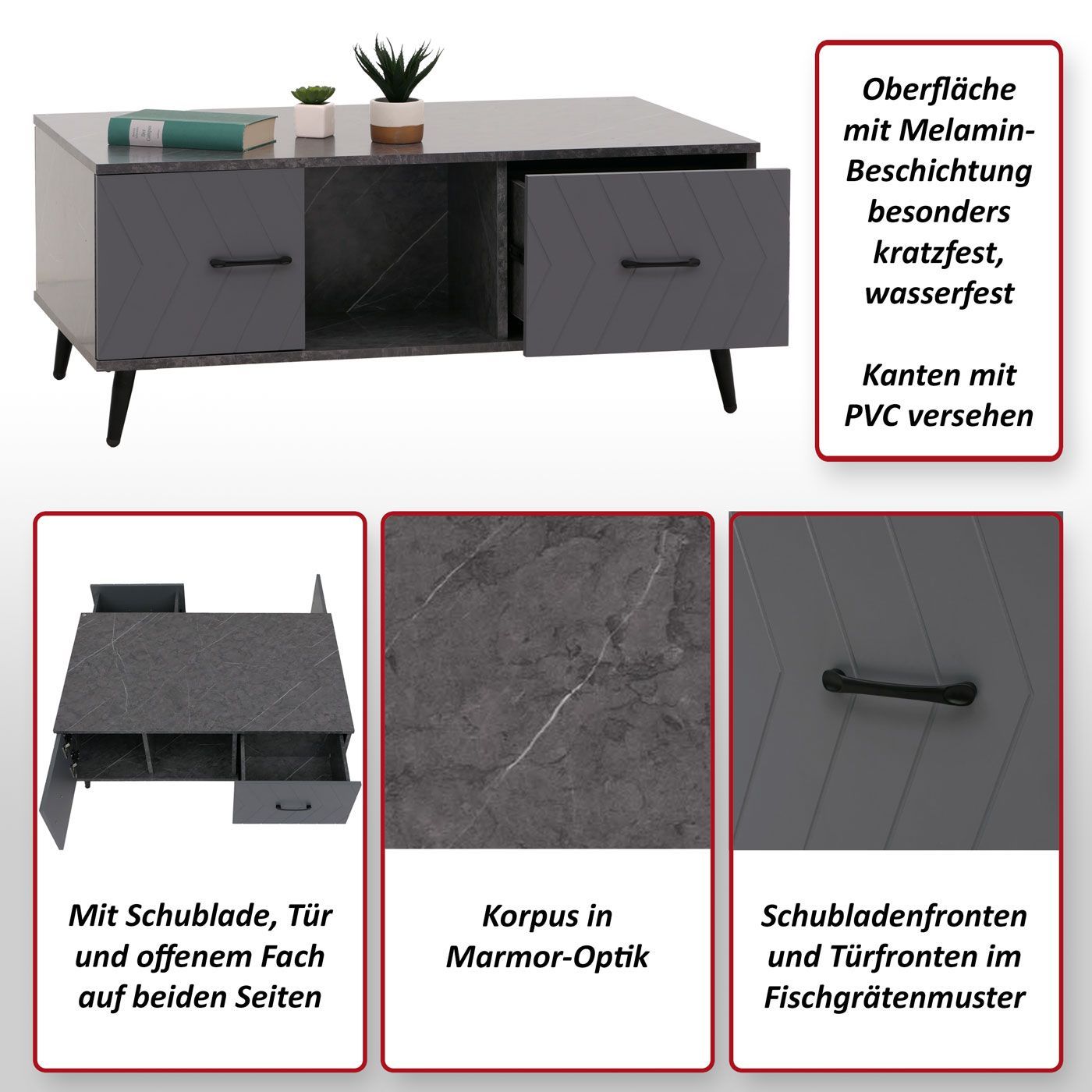 Mendler Couchtisch HWC-N89, Sofatisch, Schubladen Türen Fächer Fischgrätenmuster Melamin