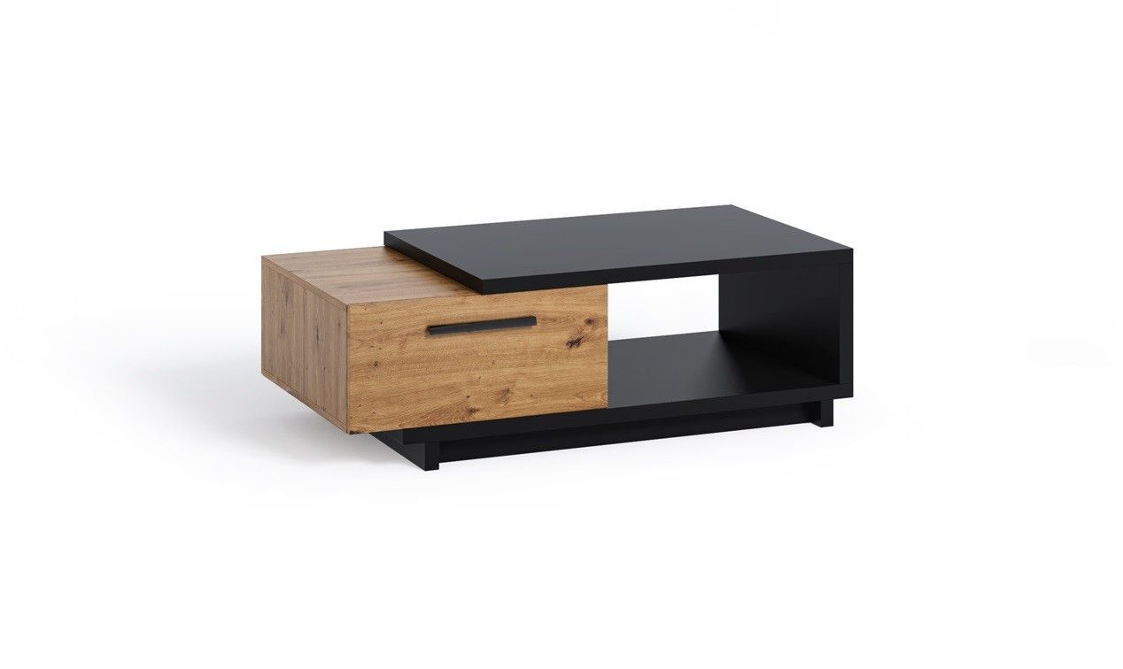 Couchtisch INES IN-03 Fronten aus laminierter Platte 16 mm Korpus aus laminierter Platte 16 mm und 32 mm Rollgleitschienen 1 geräumige Schublade ABS-Kanten schwarze Kunststoffgriffe Spezifikation Maße Breite: 120 cm Höhe: 40 cm Tiefe: 60 cm Farbe Artisan Eiche + Schwarz Andere Infos Versandkosten Ko