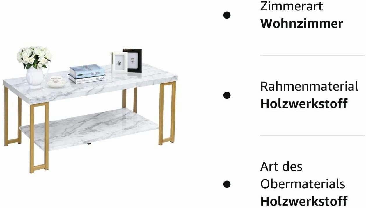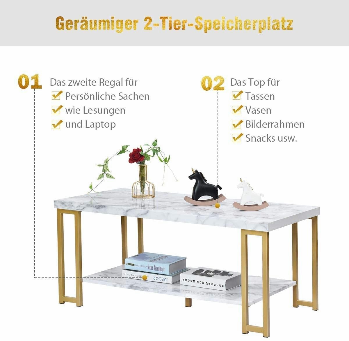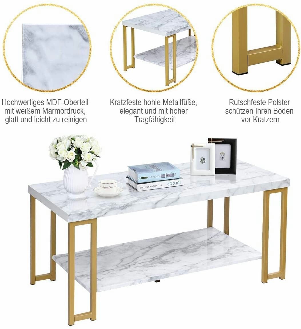 Couchtisch Marmor Optik, Beistelltisch mit Ablage, Gold Sofatisch, Modern Kaffeetisch
