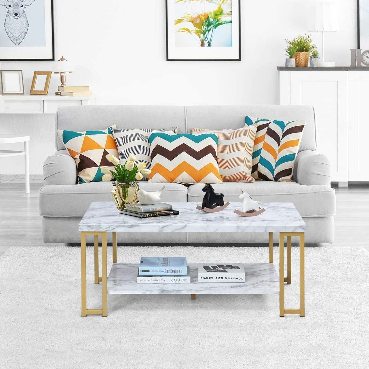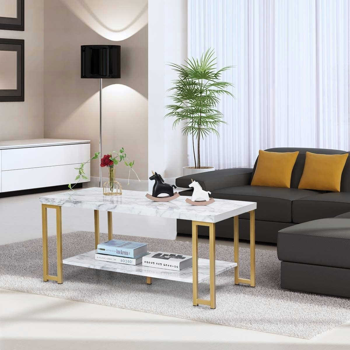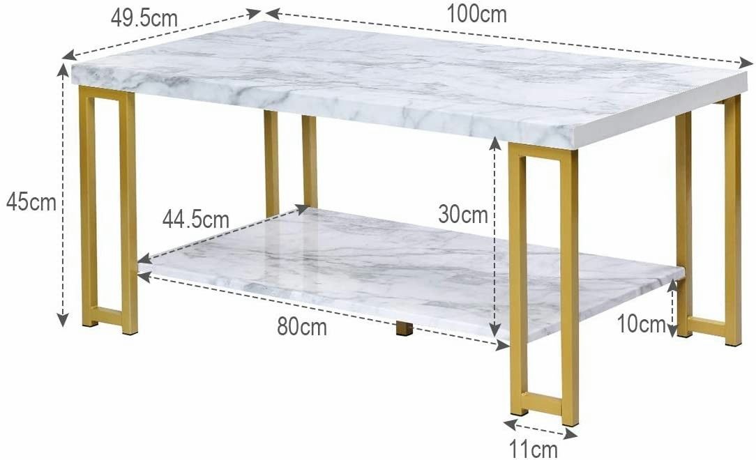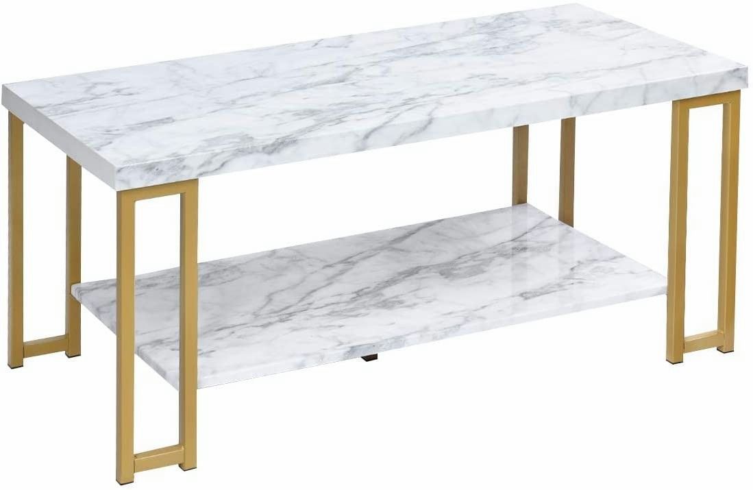 Couchtisch Marmor Optik, Beistelltisch mit Ablage, Gold Sofatisch, Modern Kaffeetisch