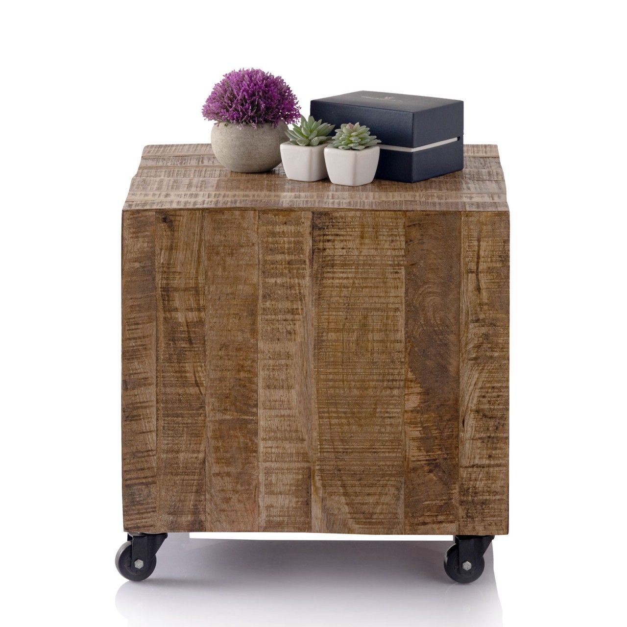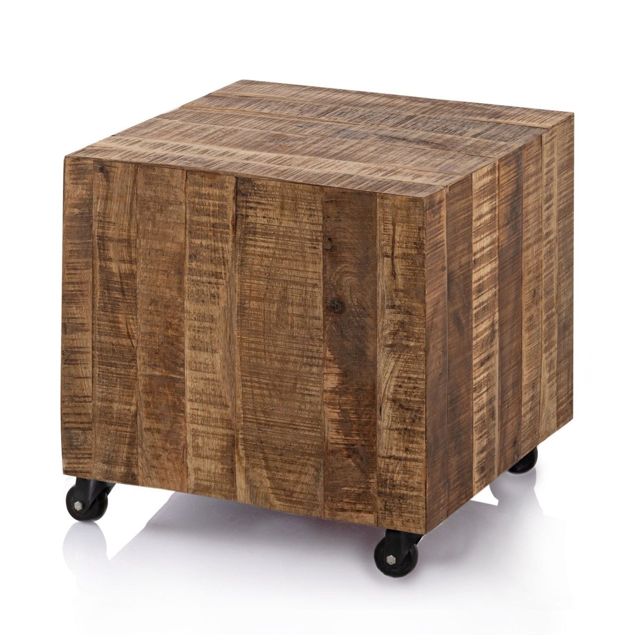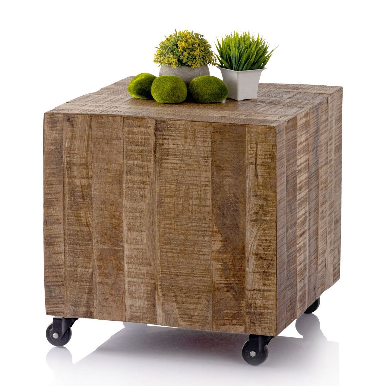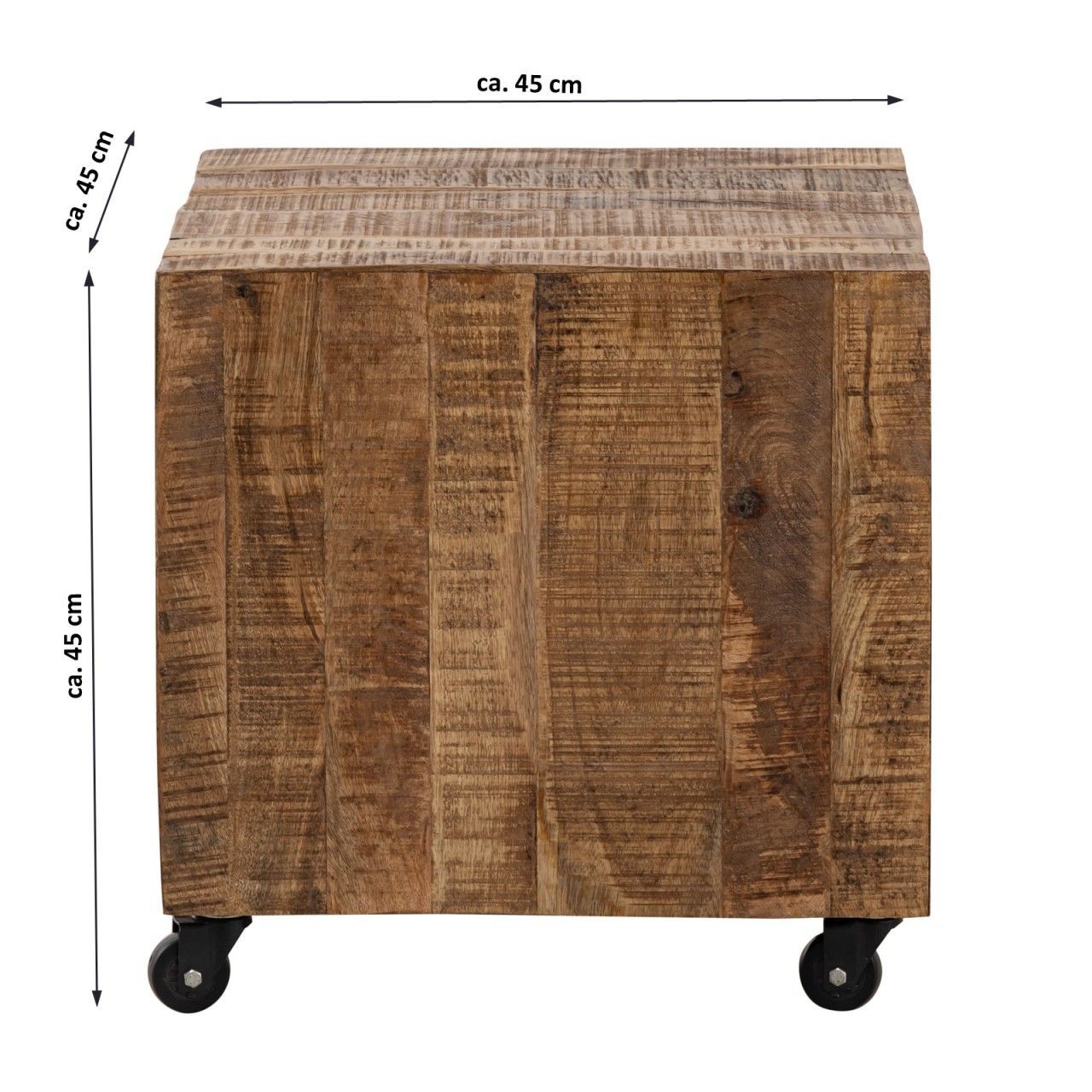 Quadratischer Couchtisch aus massivem Mangoholz mit den Maßen 45 x 45 x 45 cm. ., Couchtisch von Hand hochwertig verarbeitet aus 100% recyceltem Mango Altholz mit Säge und Gebrauchsspuren, Beistelltisch quadratisch für Lampen - Zeitungen - Blumensäule oder Dekoration geeignet ohne Dekoration!, Blumensäule mit toller Holzstruktur passend zu allen Einrichtungen durch Handarbeit jedes Stück ein Unikat!, Hocker mit Metallgestell und Rollen für leichtes Bewegen aus Mangoholz massiv mit ...