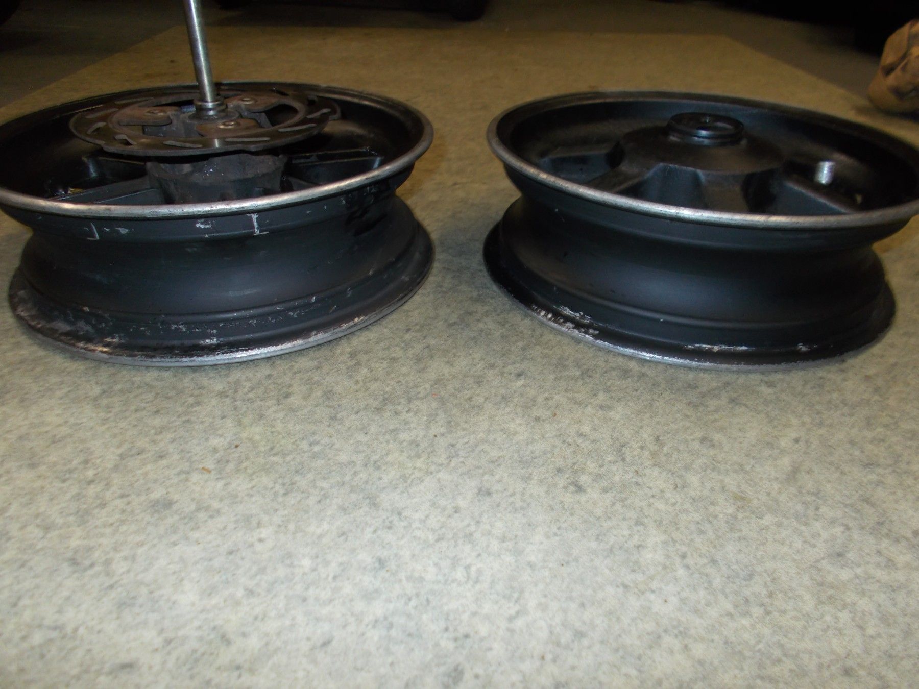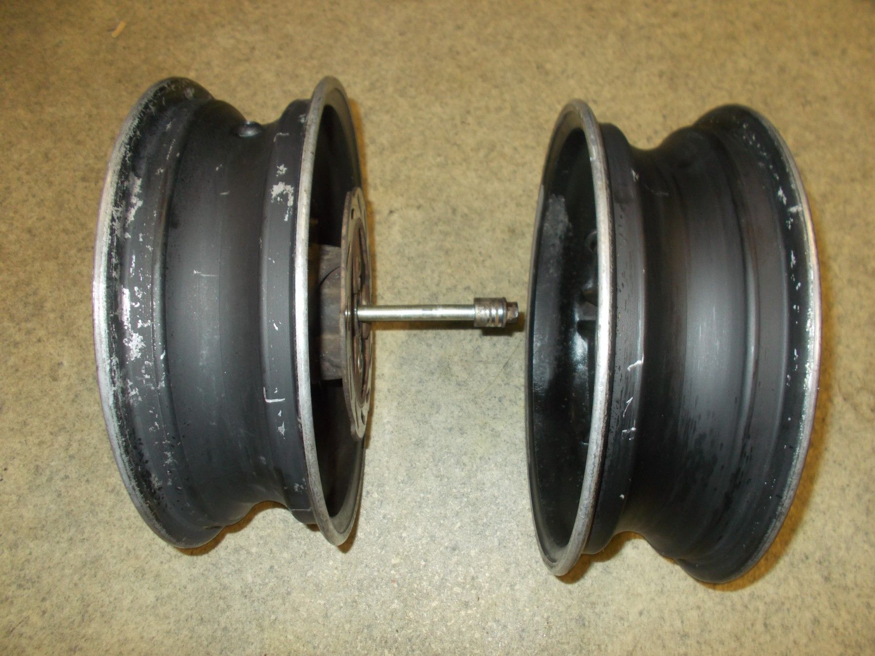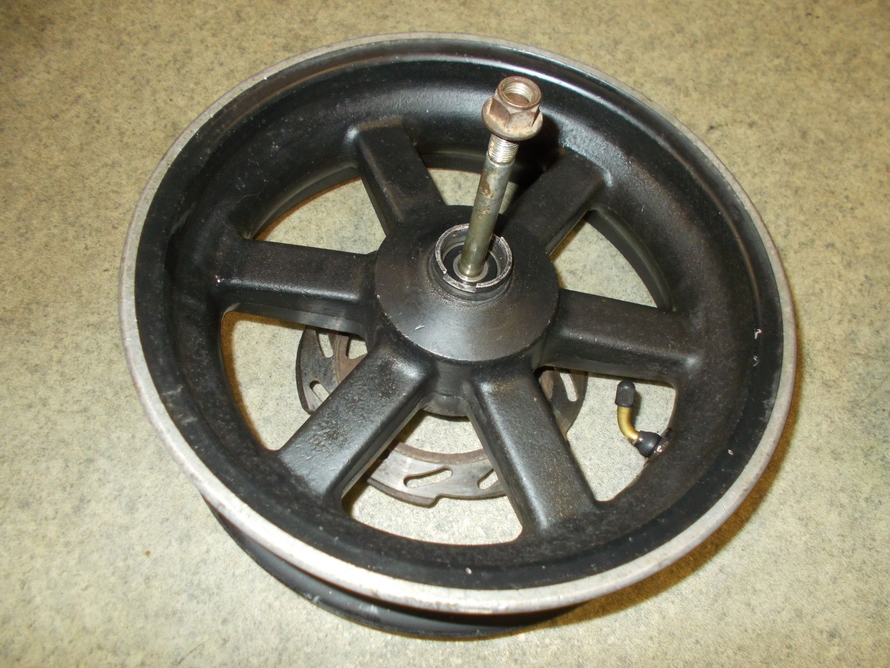 Gebrauchter Felgensatz (Felge vorne und hinten) von einem Motorroller CPI Oliver 50ccm. Es handelt sich um 12 Zoll Alufelgen. Bezeichnung 12x3.50. Zustand siehe Bilder. Die vordere Felge ist incl. Bremsscheibe, Distanzbuchse und Steckachse.