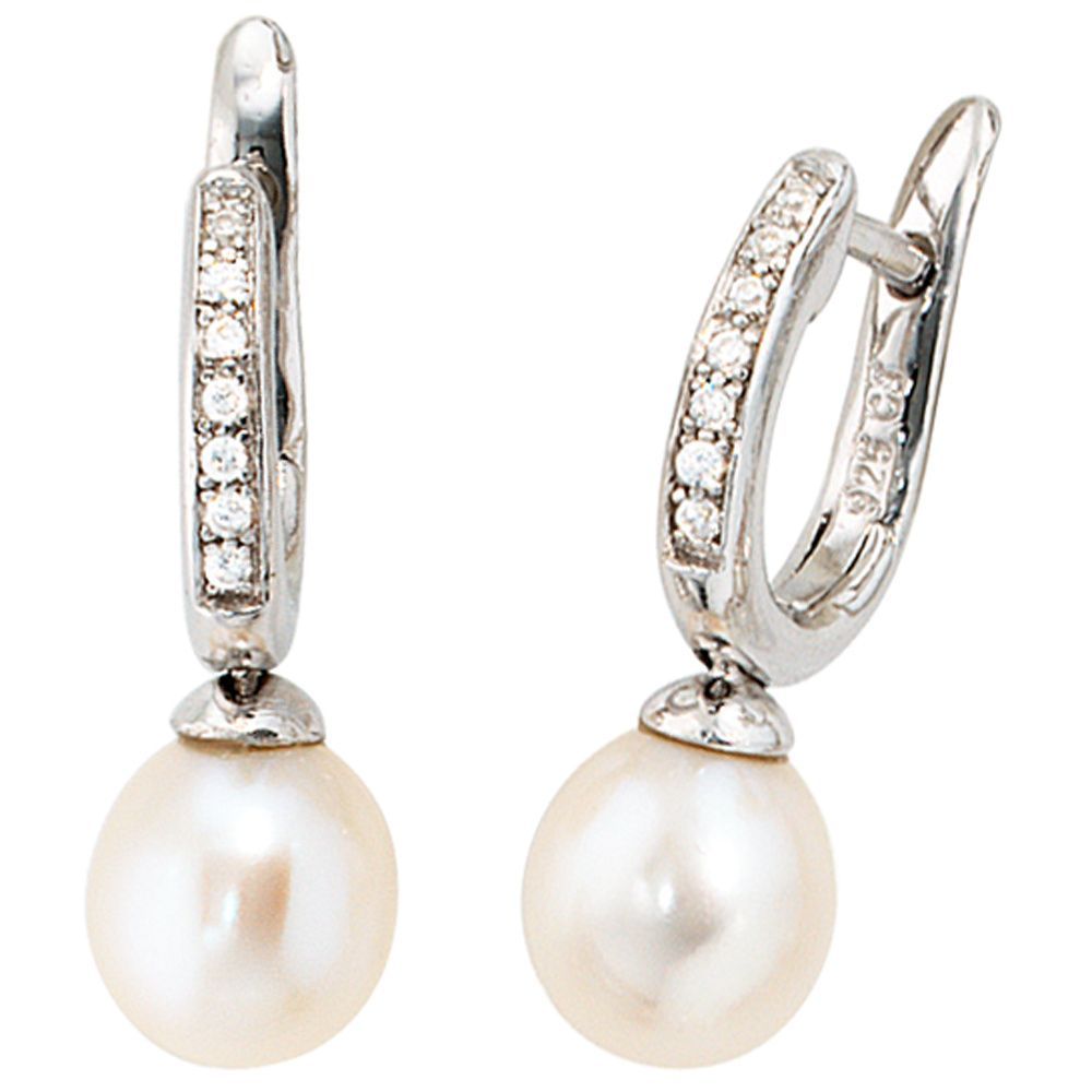 Creolen 925 Silber 2 Süßwasser Perlen 14 Zirkonia Ohrringe Perlenohrringe