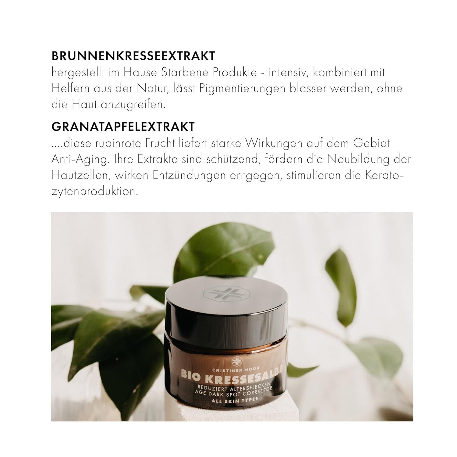 Naturkosmetik mit Brunnenkresse, reinem Vitamin C, Granatapfel & Ingwer zur natürlichen Milderung von Pigmentflecken. Bio-Aloe Vera & Hyaluron polstern Fältchen auf. Bio-Nachtkerzenöl & Sheabutter beruhigen, lindern Rötungen und fördern die Elastizität. Reich an Vitamin A,B,C,E & Mineralien. Als Tages- & Nachtpflege für Damen & Herren. 100% natural, vegan, tierversuchsfrei. Made in Bochum, Germany, ISO 9001 und GMP zerifiziert.