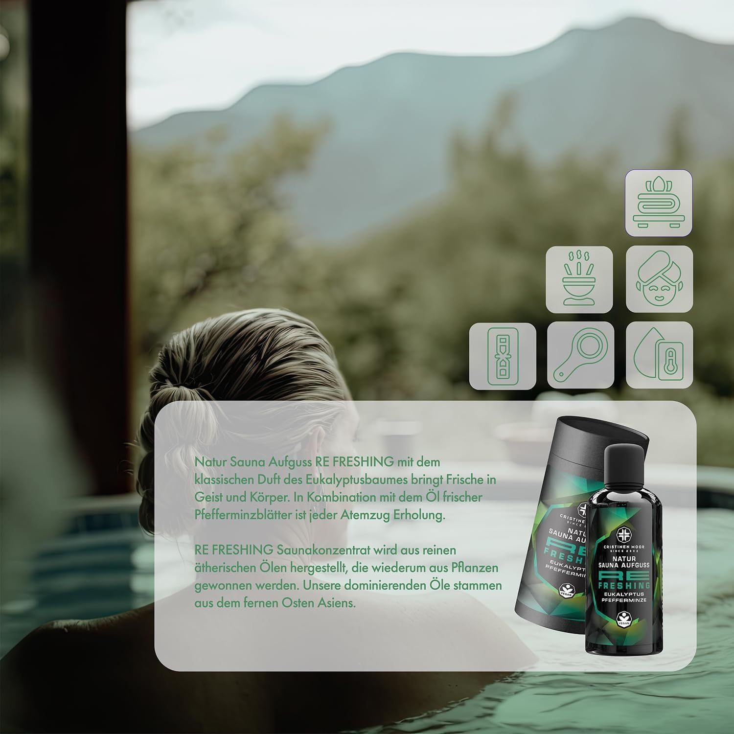 Saunaöl Saunaduft - Re Freshing: Eine klassische Mischung mit 100% naturreinem Pfefferminz- und Eukalyptusöl - bringt mit jedem Atemzug Erholung. Bio Ethanol - pflanzlicher Herkunft - und naturreine ätherische Öle sind die Inhaltsstoffe unserer hochwertigen Saunaaufguss Konzentrate der Marke Cristin