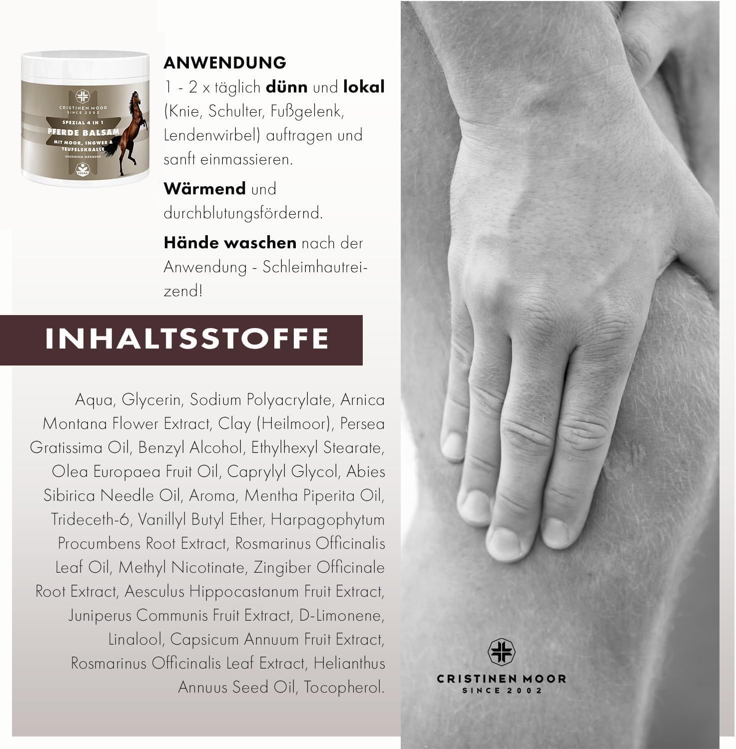 WOHLTUENDER Pferdebalsam mit spürbarer Wärme, durchblutungsfördernd, regenerierend für lokale Anwendungen im Schulter-, Knie-, Hüft- u.ä. Bereich. HOHER Gehalt an wertvollen 100% naturreinen ÄTHERISCHEN ÖLEN und Auszügen aus ARNIKA, WACHOLDER, ROSSKASTANIE, TEUFELSKRALLE, INGWER. Frei von synthetischen Farb- und Duftstoffen, vegan, 100% organic, frei von Tierversuchen, keine Mineral - Silikon - Öle. Zertifizierter Kosmetikhersteller nach ISO 9001 und GMP.
