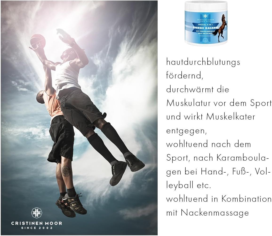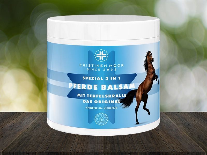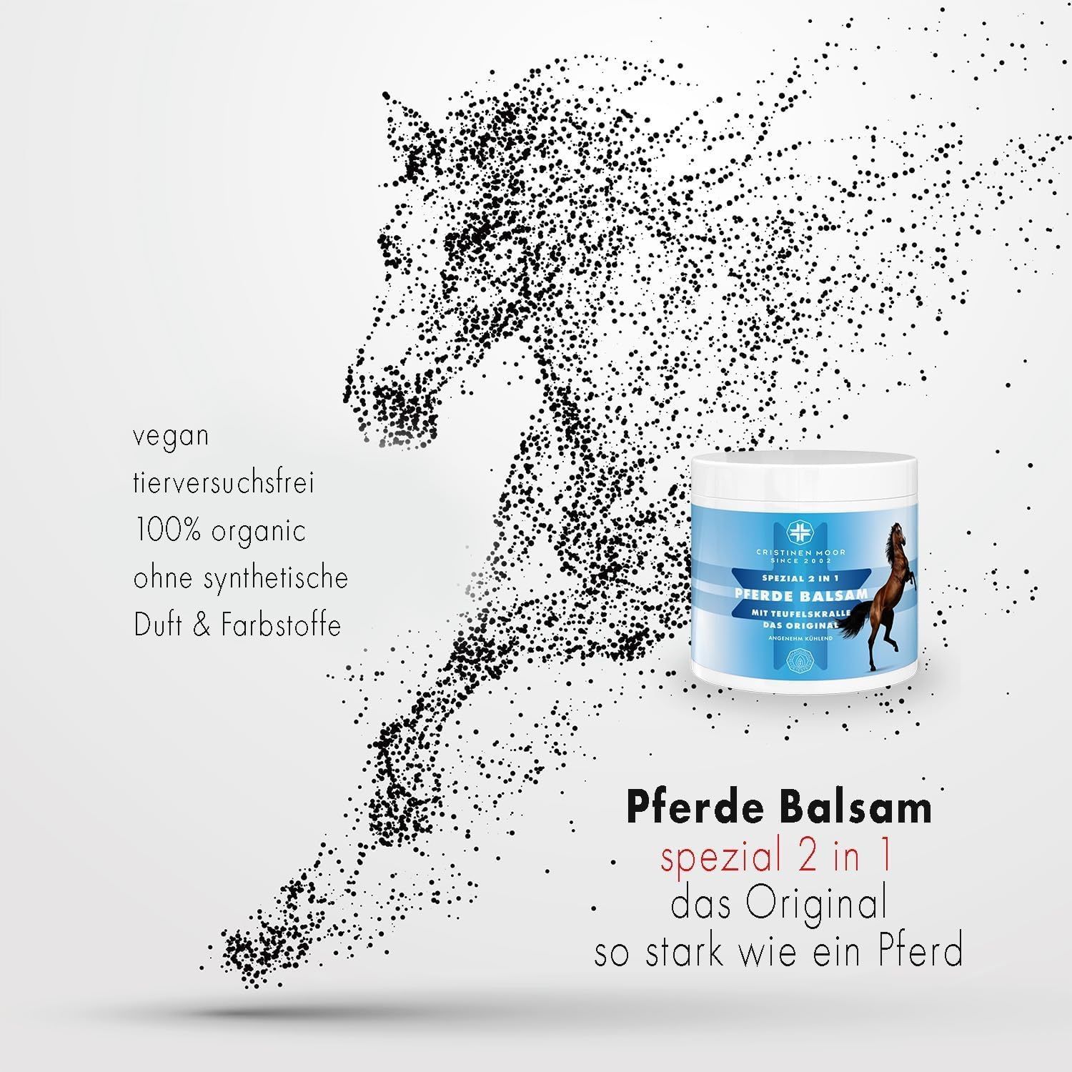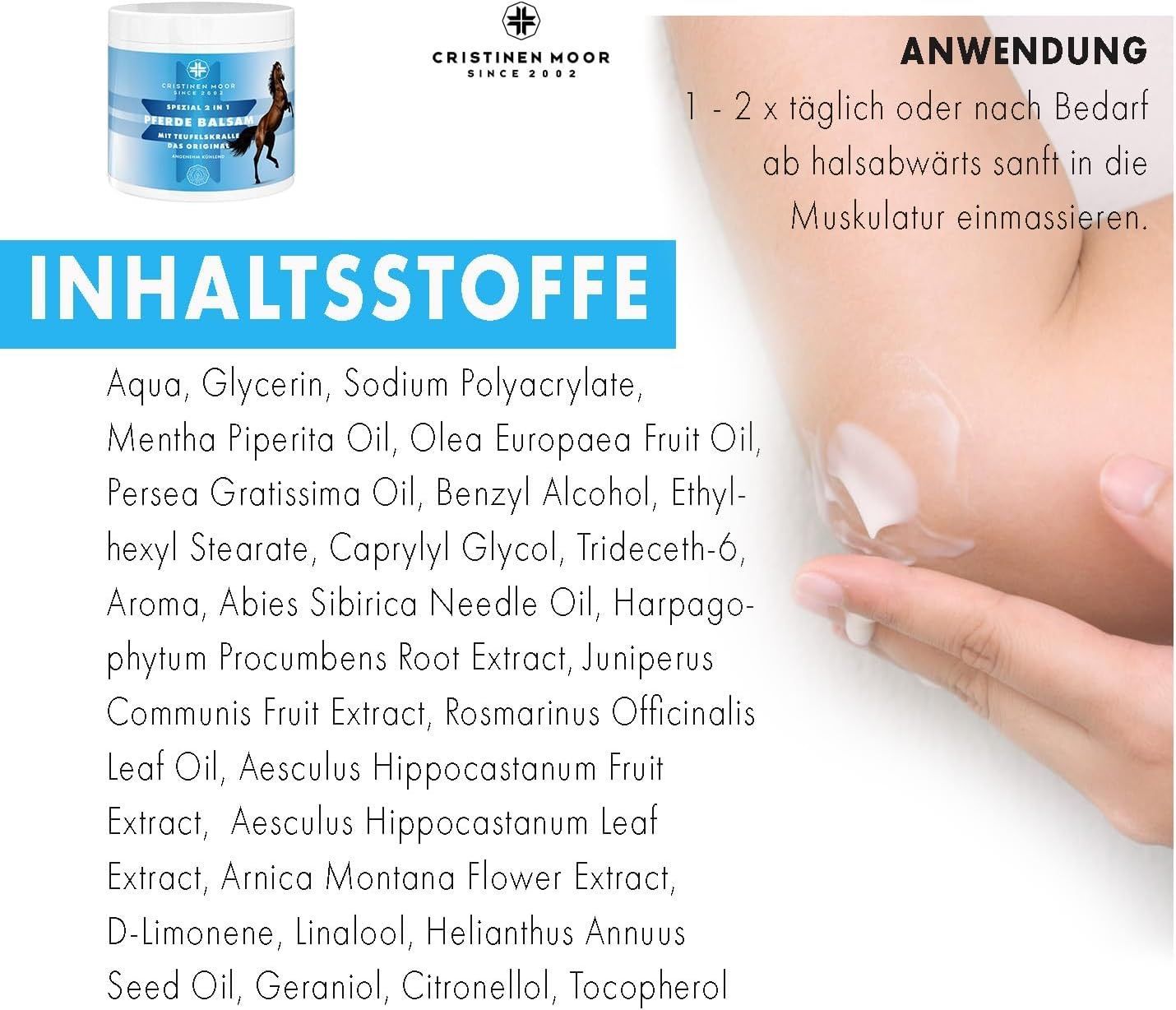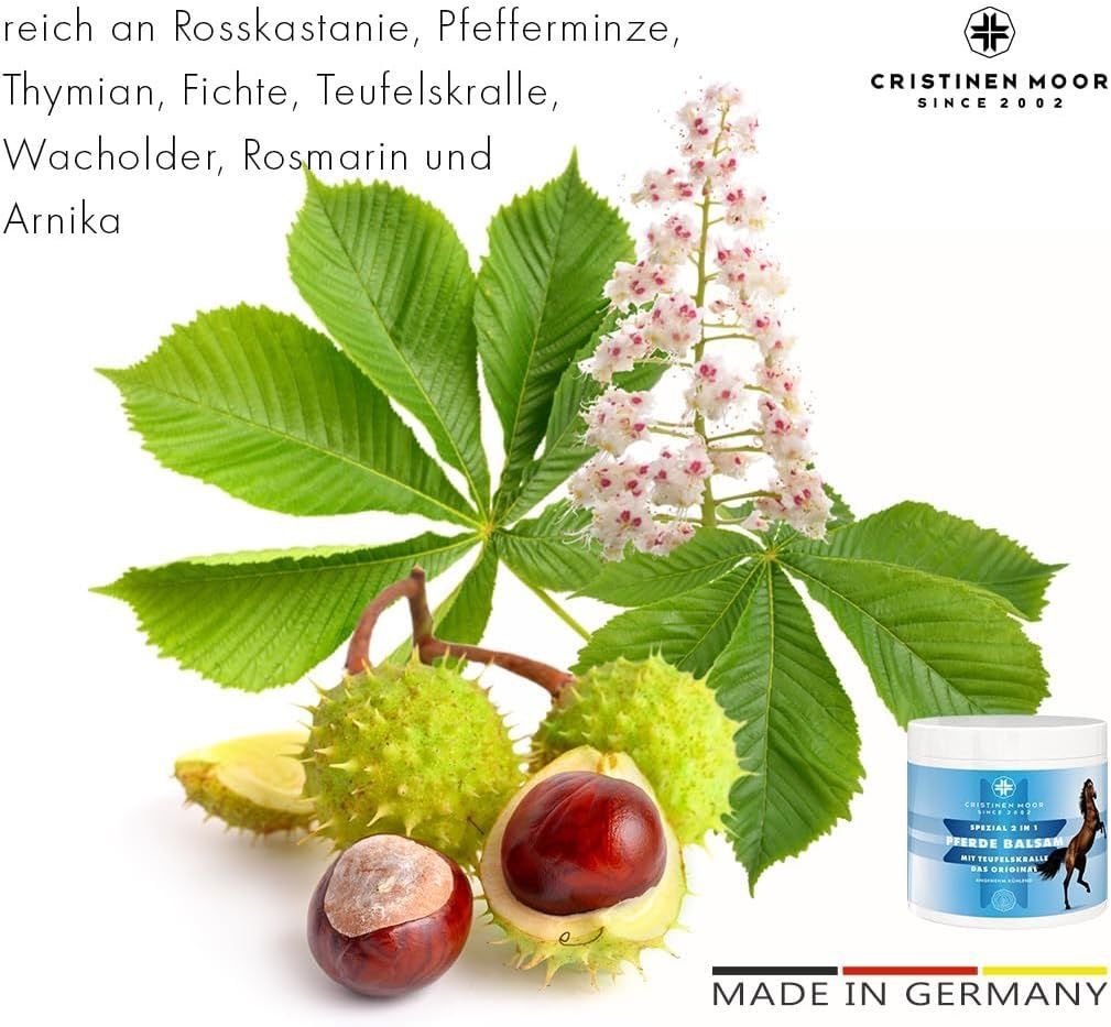 Pferde Balsam Spezial 2in1 Das Original von CristinenMoor vereint die Wirkung von Pferdebalsam und Teufelskralle. Mit naturreinen Ölen & Pflanzenextrakten (Pfefferminze, Rosskastanie, Wacholder, Fichtennadel, Thymian, Rosmarin, Arnika) fördert er Entspannung von Muskeln & Gelenken. Pflegt mit Avocadoöl, erfrischend, belebend, kühlend. Erfolgreich dermatologisch geprüft, tierversuchsfrei, frei von Parabenen, Farbstoffen, Duftstoffen, vegan. Zertifizierter Kosmetikhersteller nach ISO 9001 und GMP.