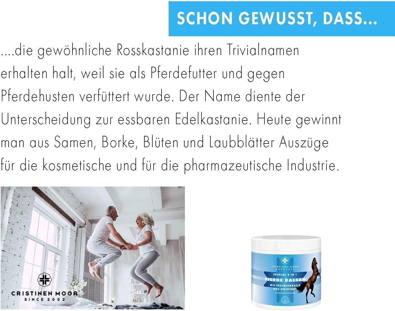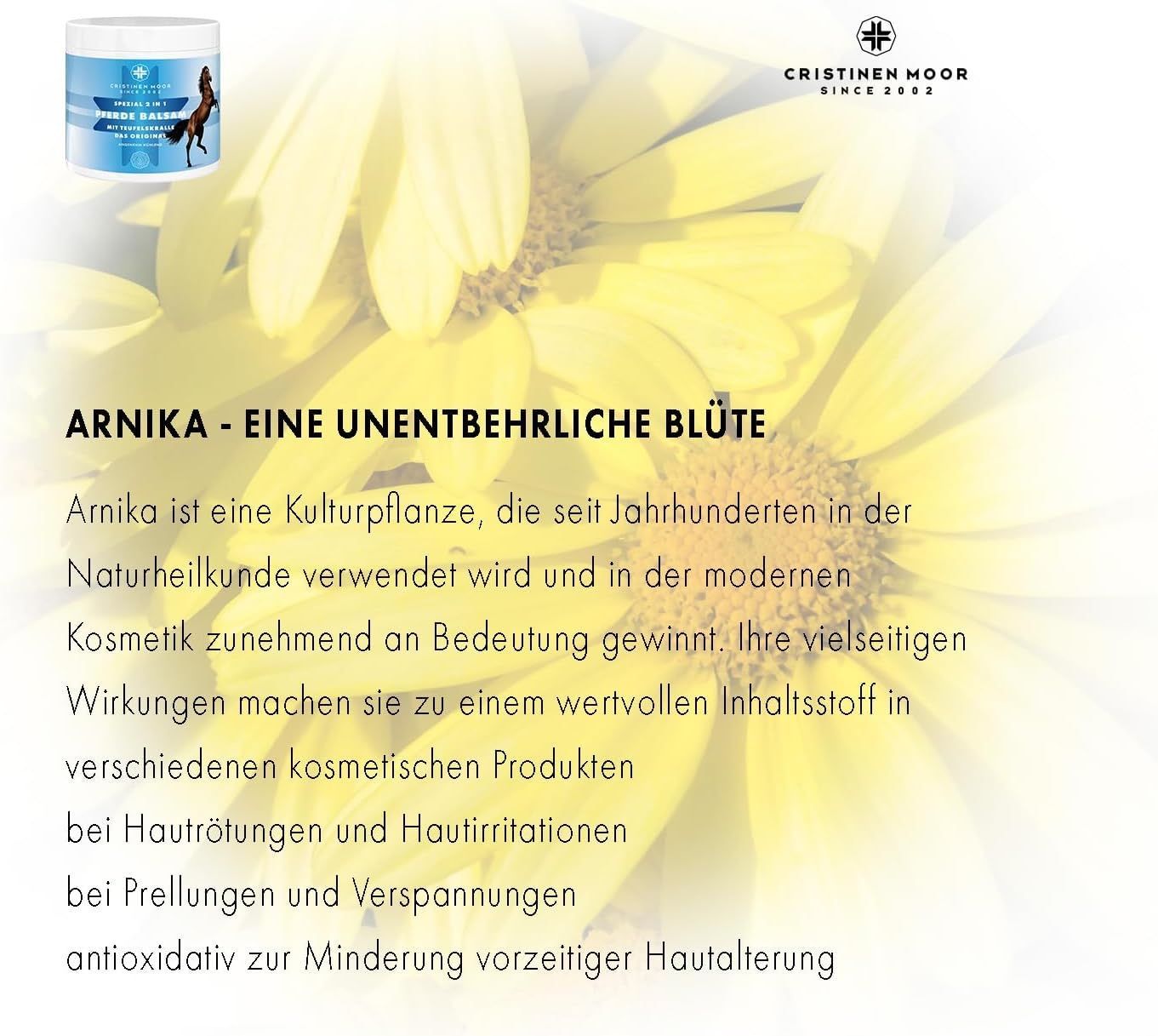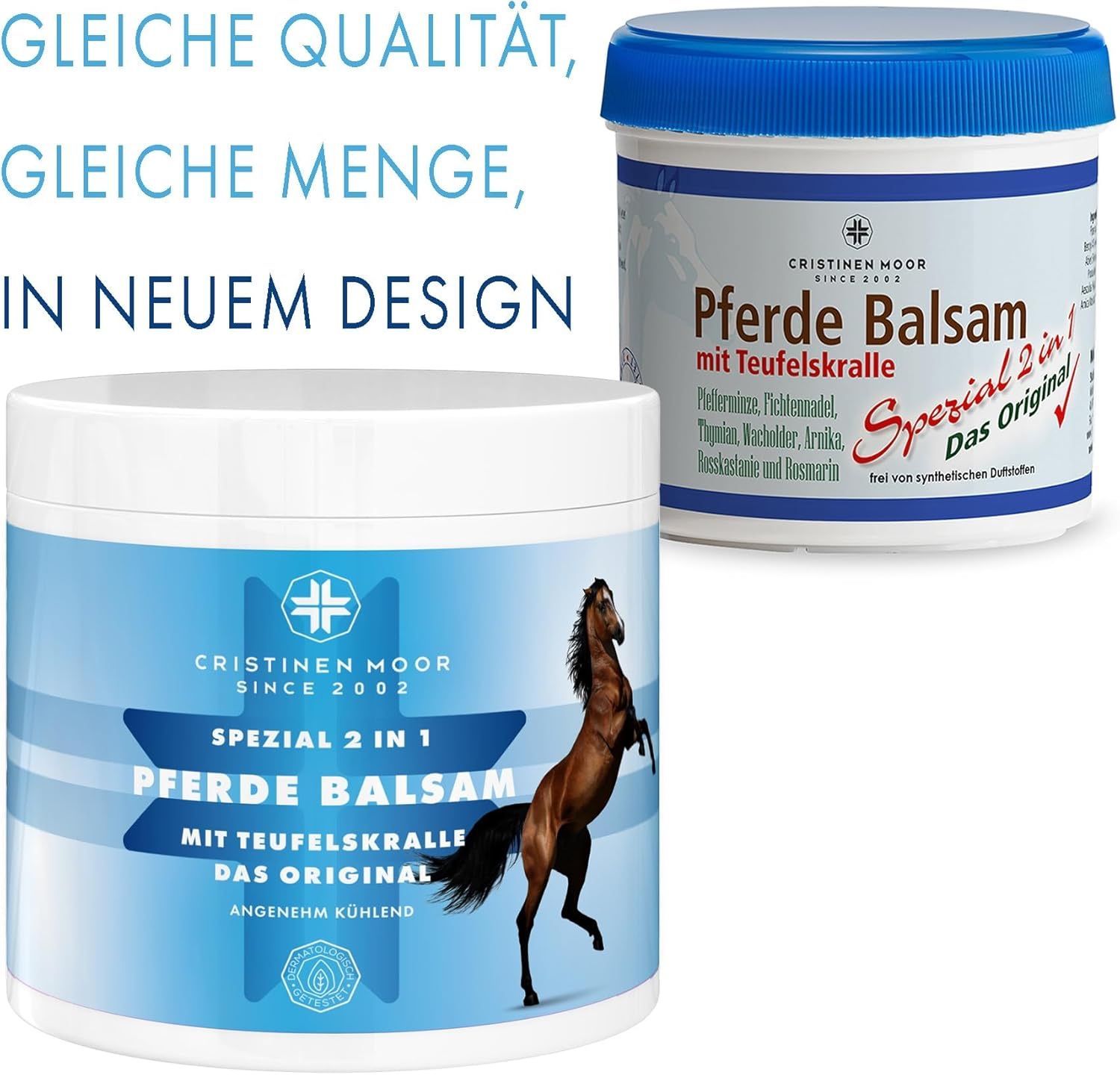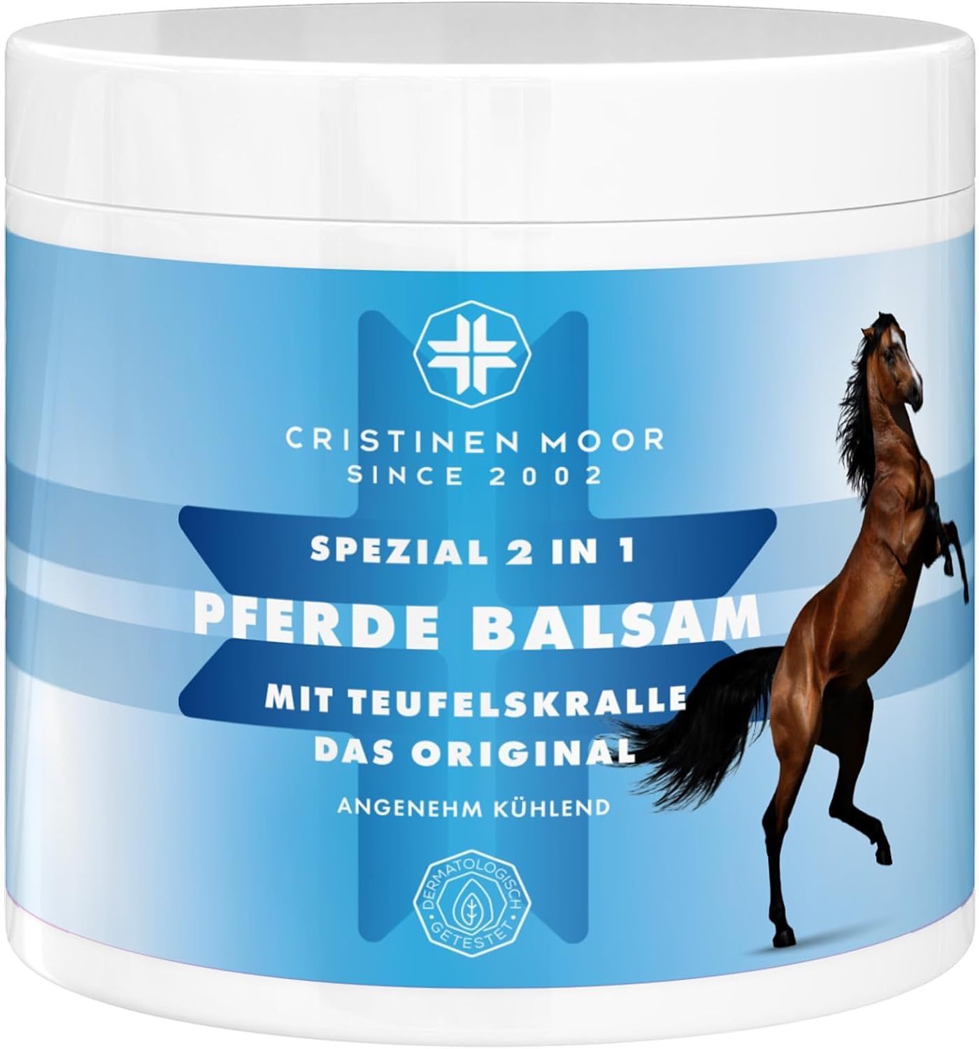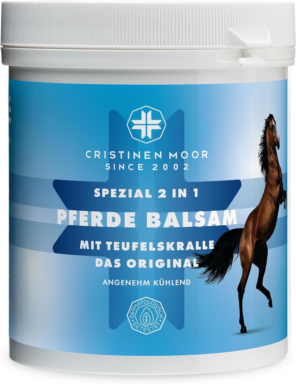 Pferde Balsam Spezial 2in1 Das Original von CristinenMoor vereint die Wirkung von Pferdebalsam und Teufelskralle. Mit naturreinen Ölen & Pflanzenextrakten (Pfefferminze, Rosskastanie, Wacholder, Fichtennadel, Thymian, Rosmarin, Arnika) fördert er Entspannung von Muskeln & Gelenken. Pflegt mit Avocadoöl, erfrischend, belebend, kühlend. Erfolgreich dermatologisch geprüft, tierversuchsfrei, frei von Parabenen, Farbstoffen, Duftstoffen, vegan. Zertifizierter Kosmetikhersteller nach ISO 9001 und GMP.