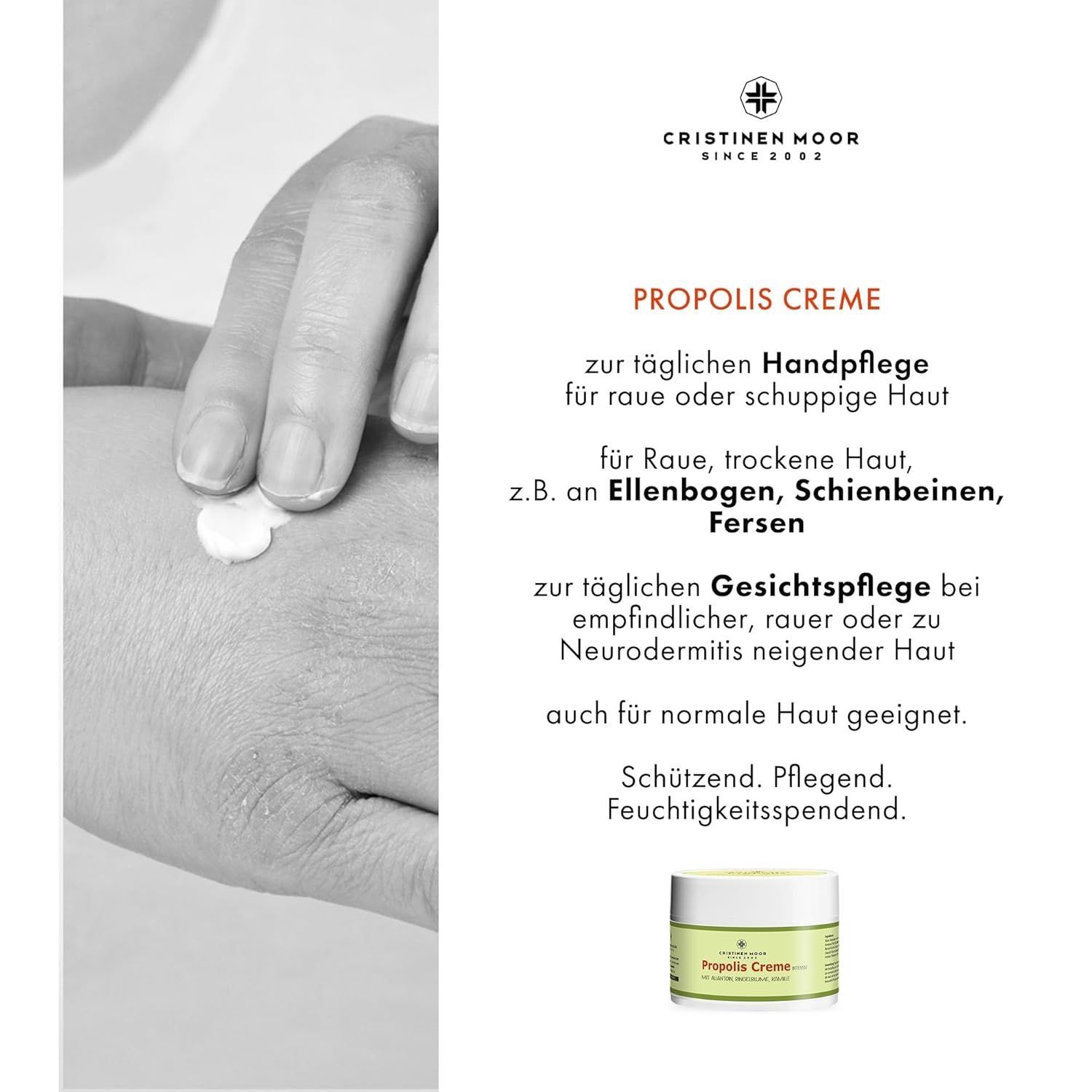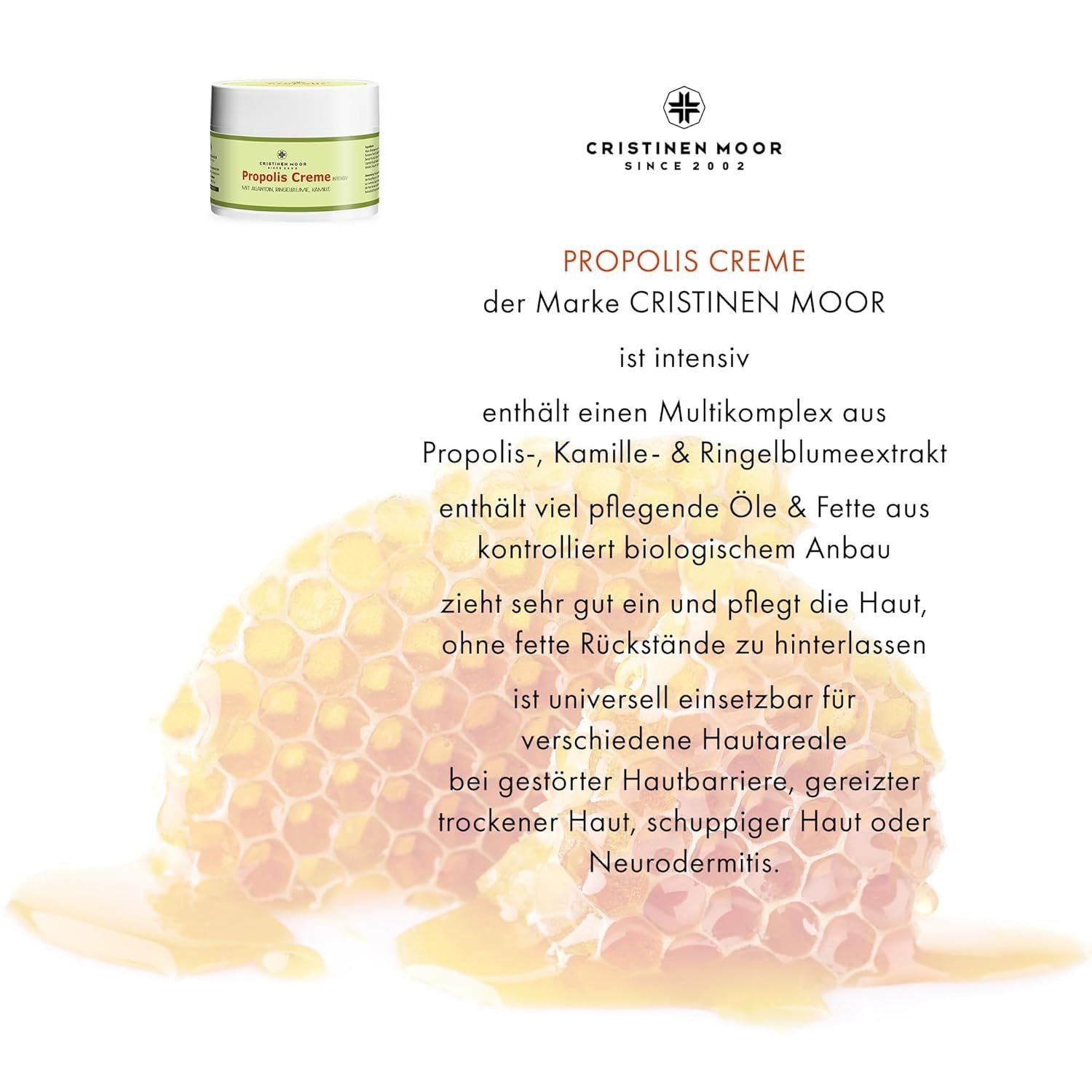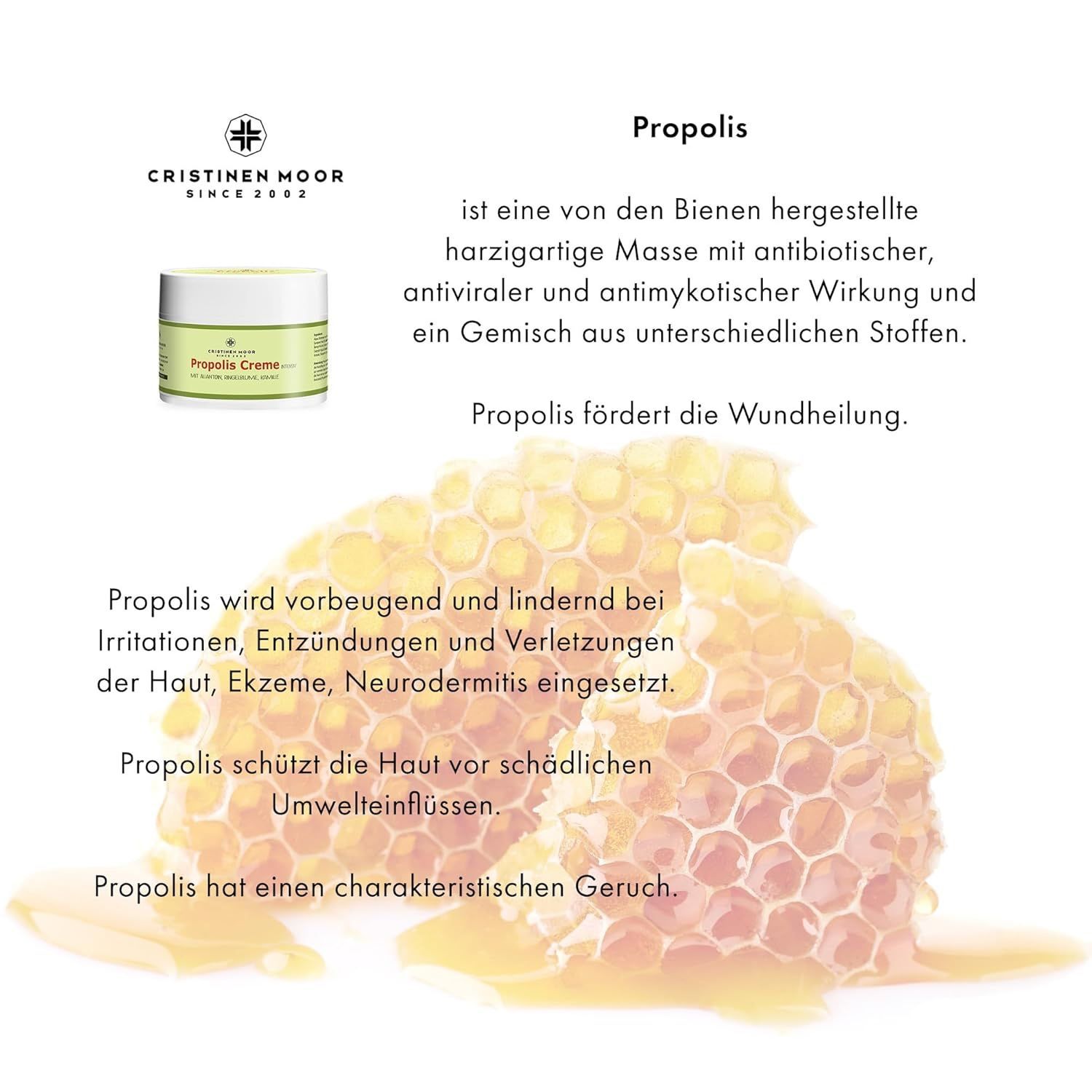 Intensiver Propolisauszug, Bio Sheabutter, Bio Hanfsamenöl & Olivenöl - Propolis Creme der Marke CristinenMoor ist eine Pflege für verletzte, sehr trockene oder entzündete, auch zu Neurodermitis neigende Haut. Hohe Anteile Hanfsamenöl, Sheabutter, Avocado- und Olivenöl unterstützen die Wundheilung u