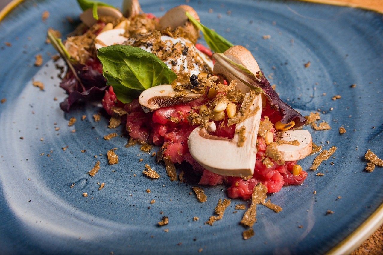 Roastbeef, Burgern, Sandwichs, Salaten und Pommes frites verspeisen.