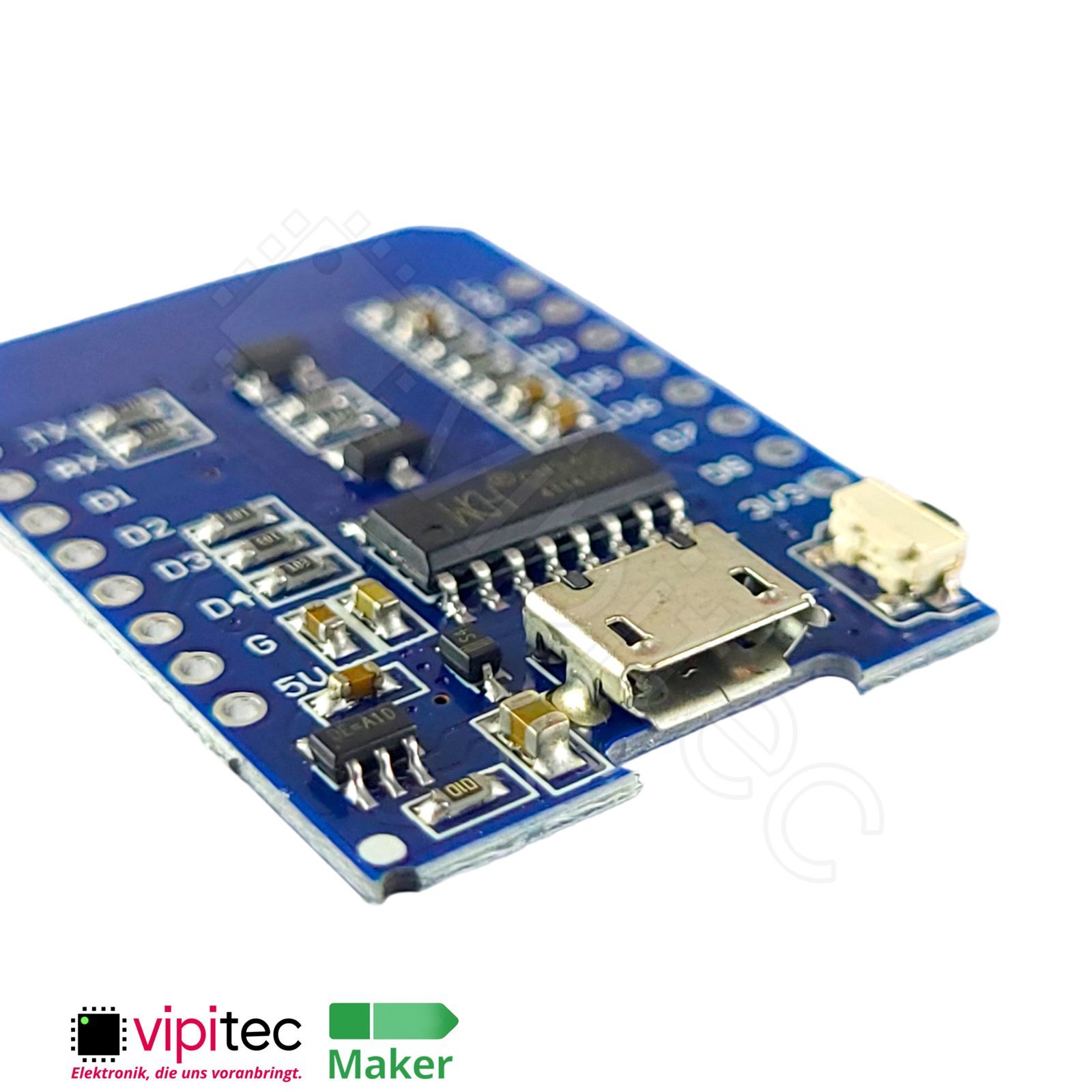Warenkorb vipitec Shop Aktuelle Angebote Kontakt Komponenten > Entwicklungsplatinen D1 Mini ESP8266 Ent& 173;wicklungs& 173;board mit Arduino& 174;-kompatiblem Bootloader , wahlweise mit Micro-USB oder USB-C Spezifikation: 3,3 V, 26 MHz, ESP8266MOD, 11 GPIOs, 1 ADC-Port In unserem Shop finden Sie