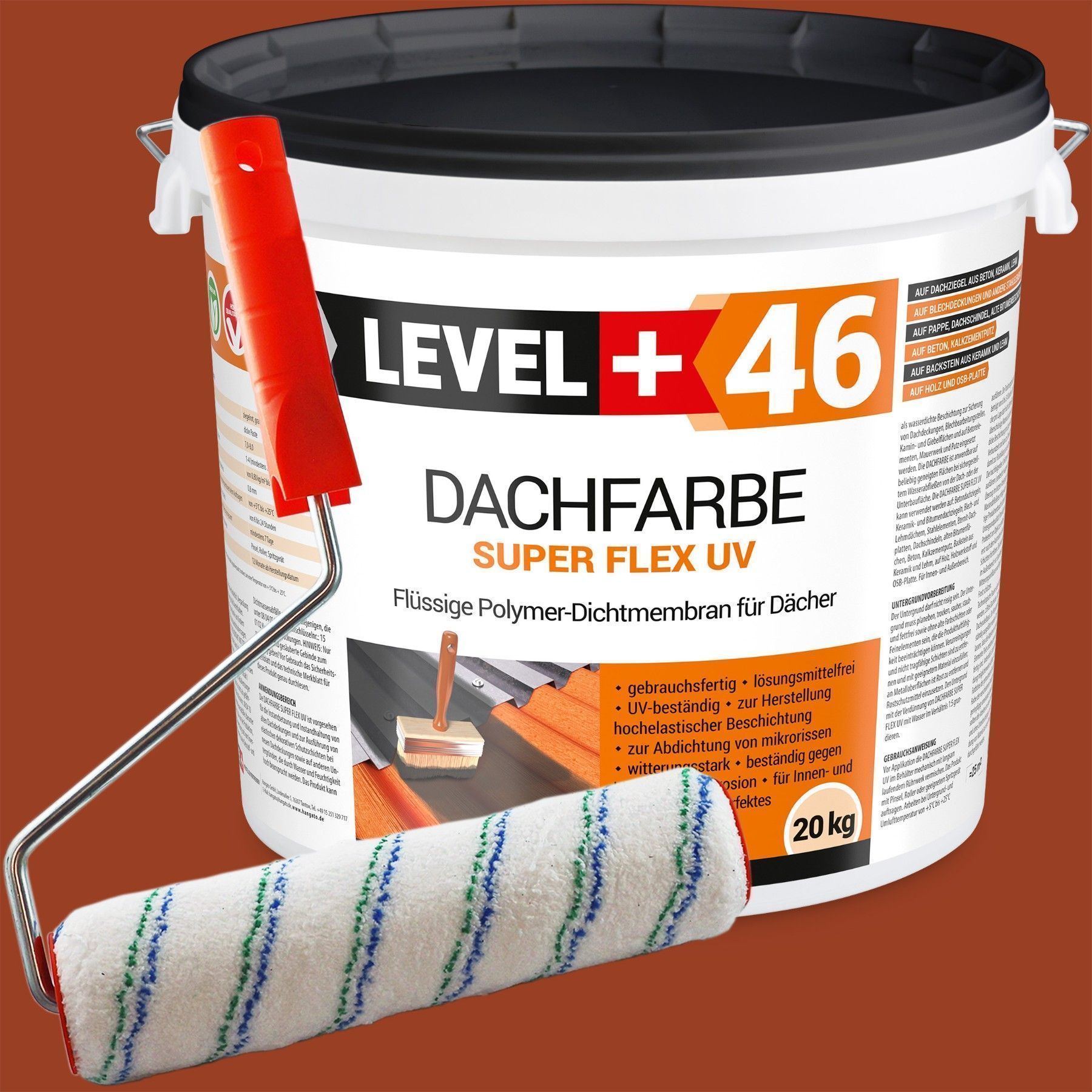 Dachfarbe 20kg Flexible Sockelfarbe Dachlack Ziegelrot + Farbroller 25cm Set L+46