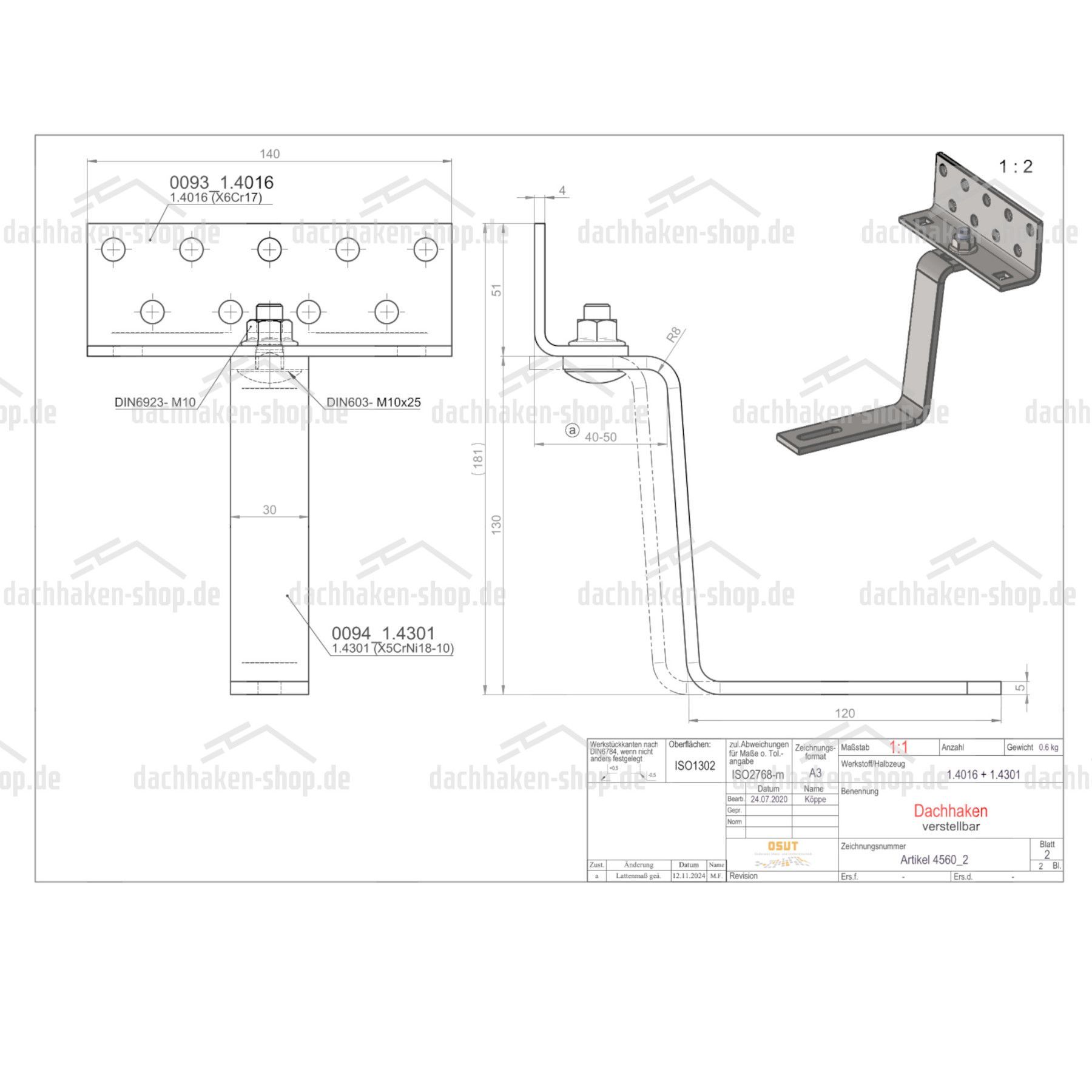 Dachhaken 1-fach verstellbar | senkrechter Ausleger | Material 1.4016/1.4301
