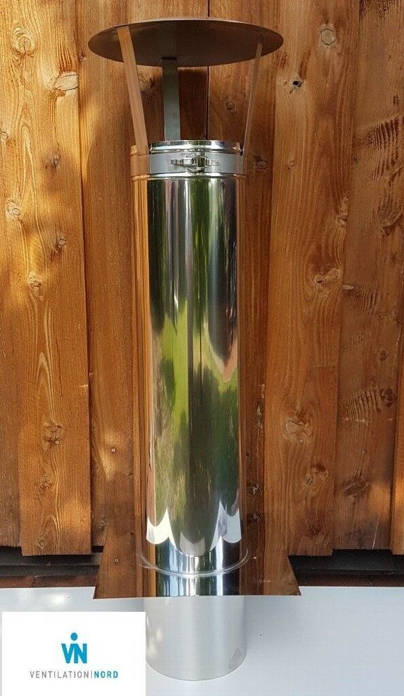 Schornsteinverlängerung mit Haube komplett aus Edelstahl aus deutscher Fertigung aus Edelstahl 1.4404 in folgenden Duchmessern: 120, 130, 140,150,160,180, 200, 225, 250, 300 mm mit Höhe: 500 mm (ab Oberkante Bodenblech bis Anfang Haube) in folgenden Ausführungen: Rund zum Einstecken, abgerundete Eck