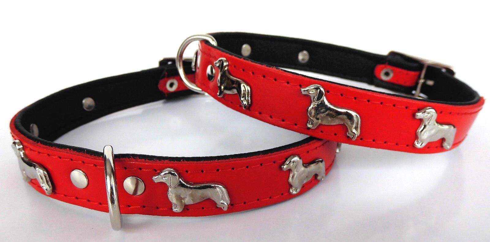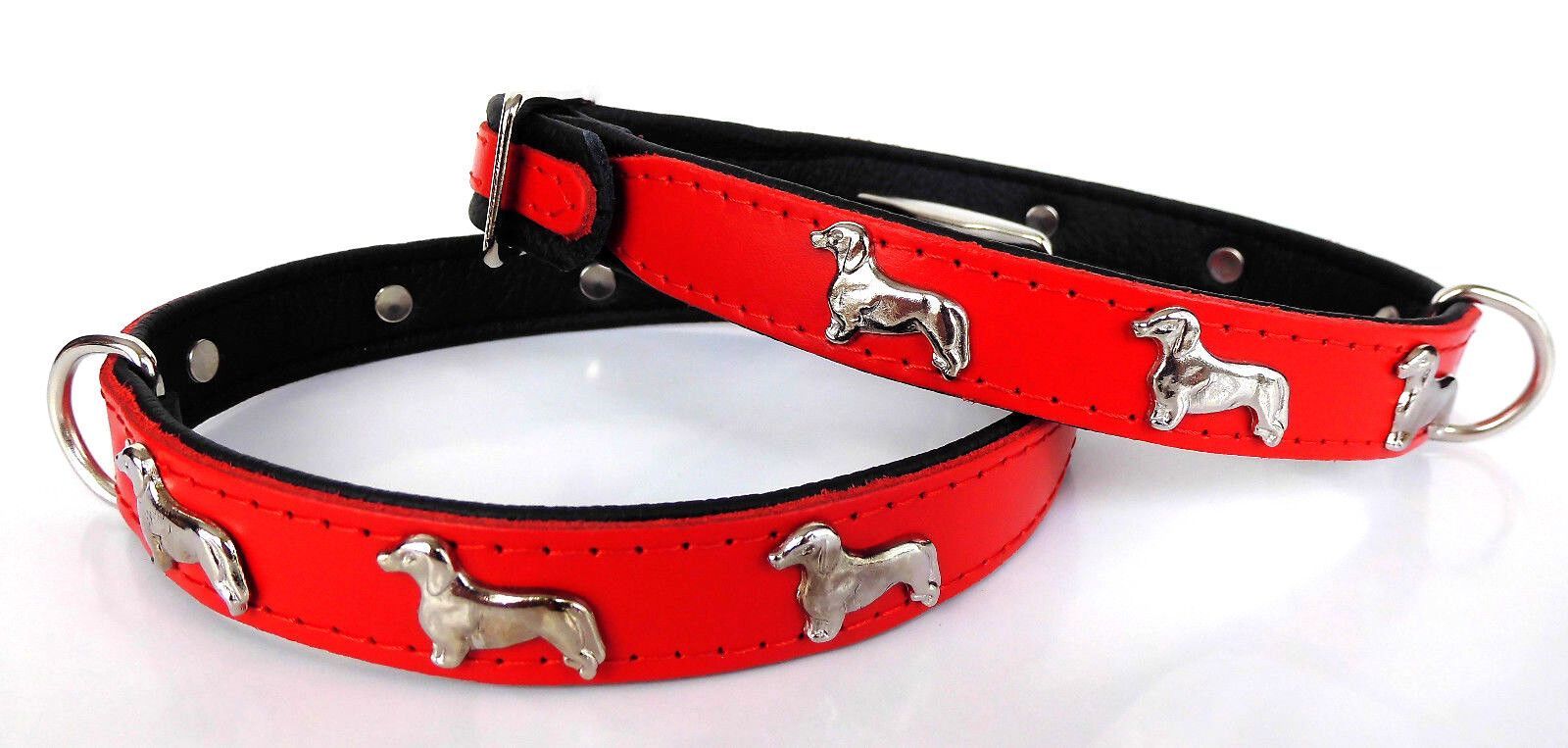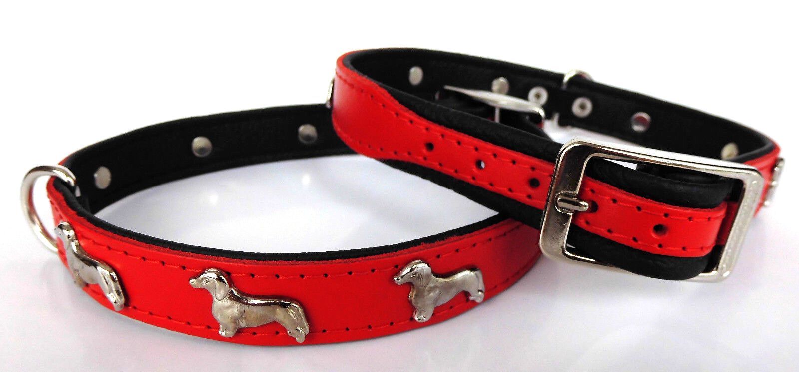 LEDERHALSBAND mit tollen Metallaplikationen ***DACKEL*** *** ROT - SCHWARZ *** Maße: Gesamtlänge : 45 cm Halsumfang : 36 - 41 cm Breit : 20 mm Messen Sie hierzu bitte den Hals ihres Hundes. Material - 100% hochwertiges Leder, sehr robust - Verziert mit tollen Metallaplikationen - je Seite 3 Hunde Sc