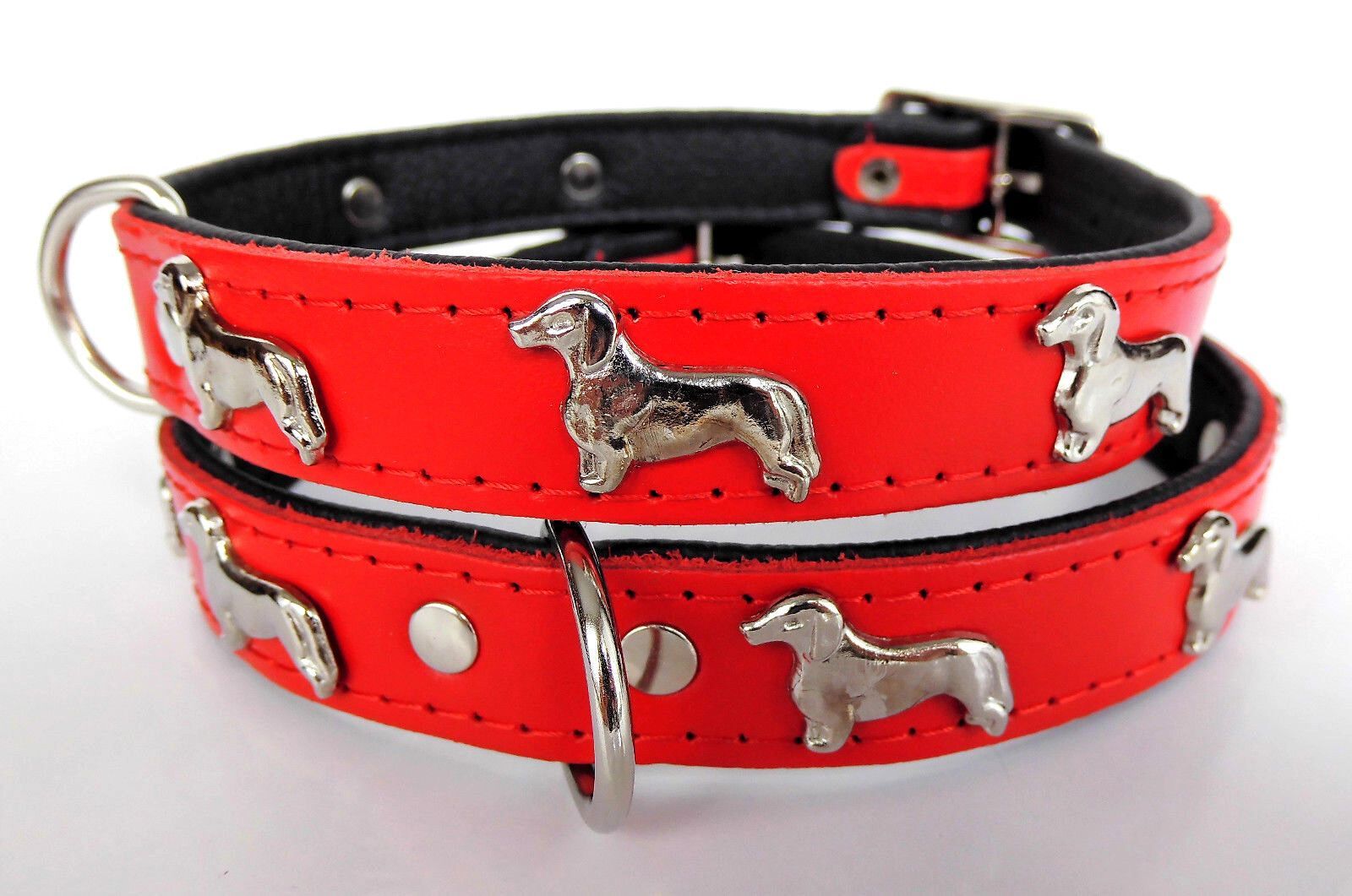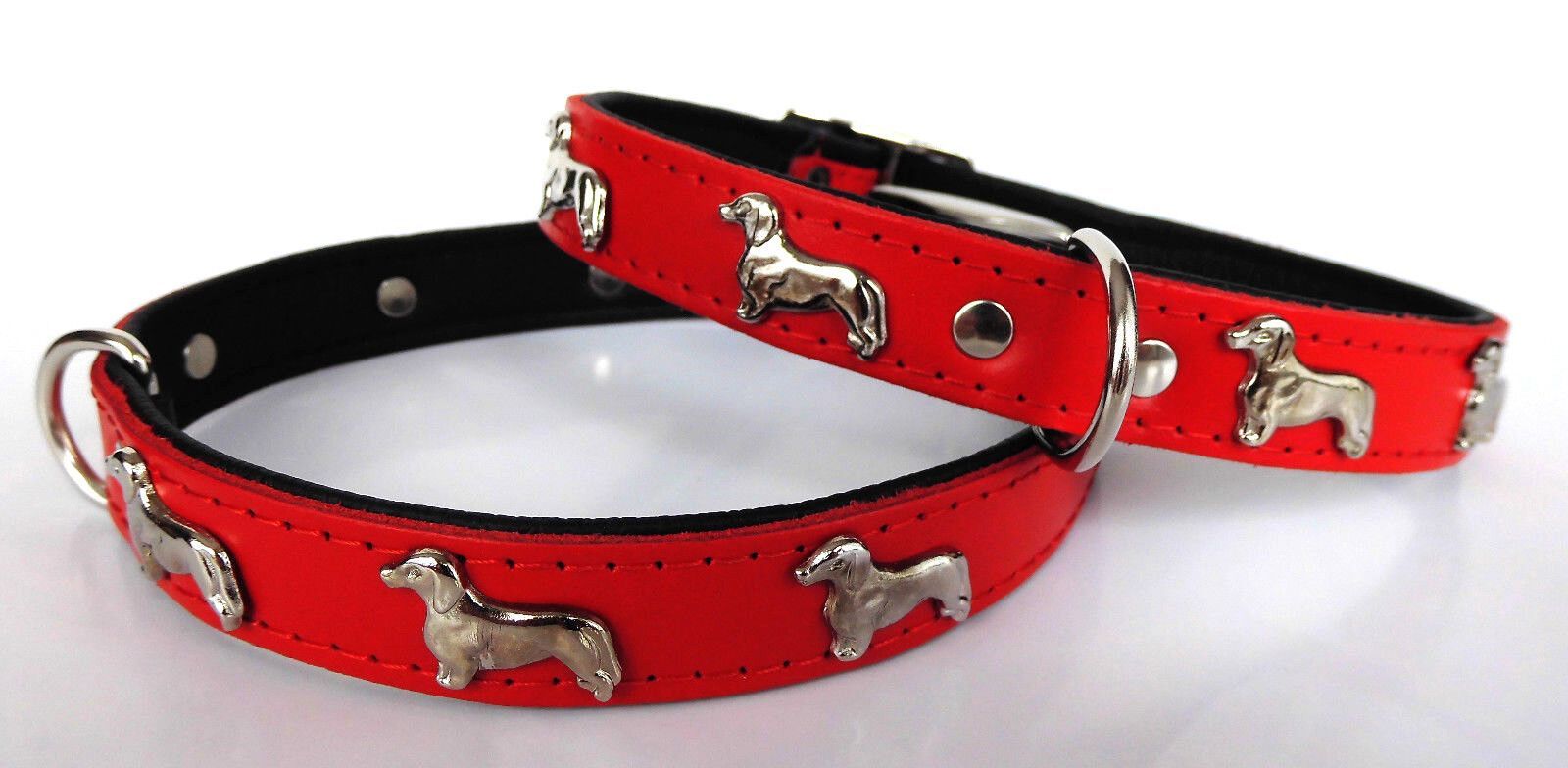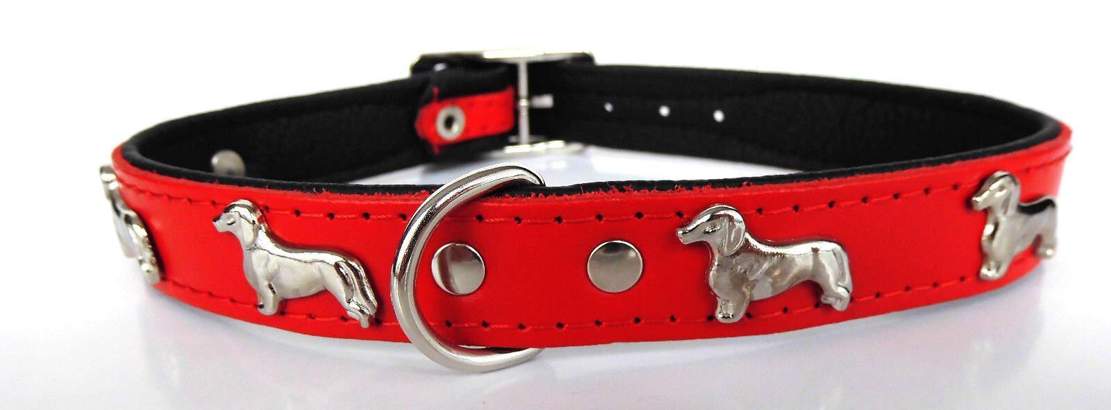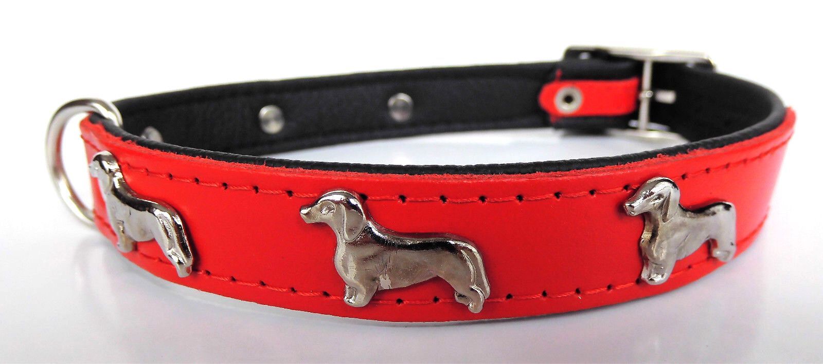 LEDERHALSBAND mit tollen Metallaplikationen ***DACKEL*** *** ROT - SCHWARZ *** Maße: Gesamtlänge : 45 cm Halsumfang : 36 - 41 cm Breit : 20 mm Messen Sie hierzu bitte den Hals ihres Hundes. Material - 100% hochwertiges Leder, sehr robust - Verziert mit tollen Metallaplikationen - je Seite 3 Hunde Sc