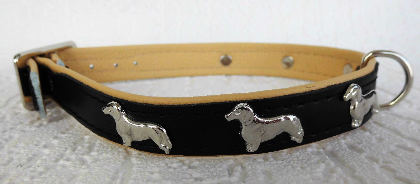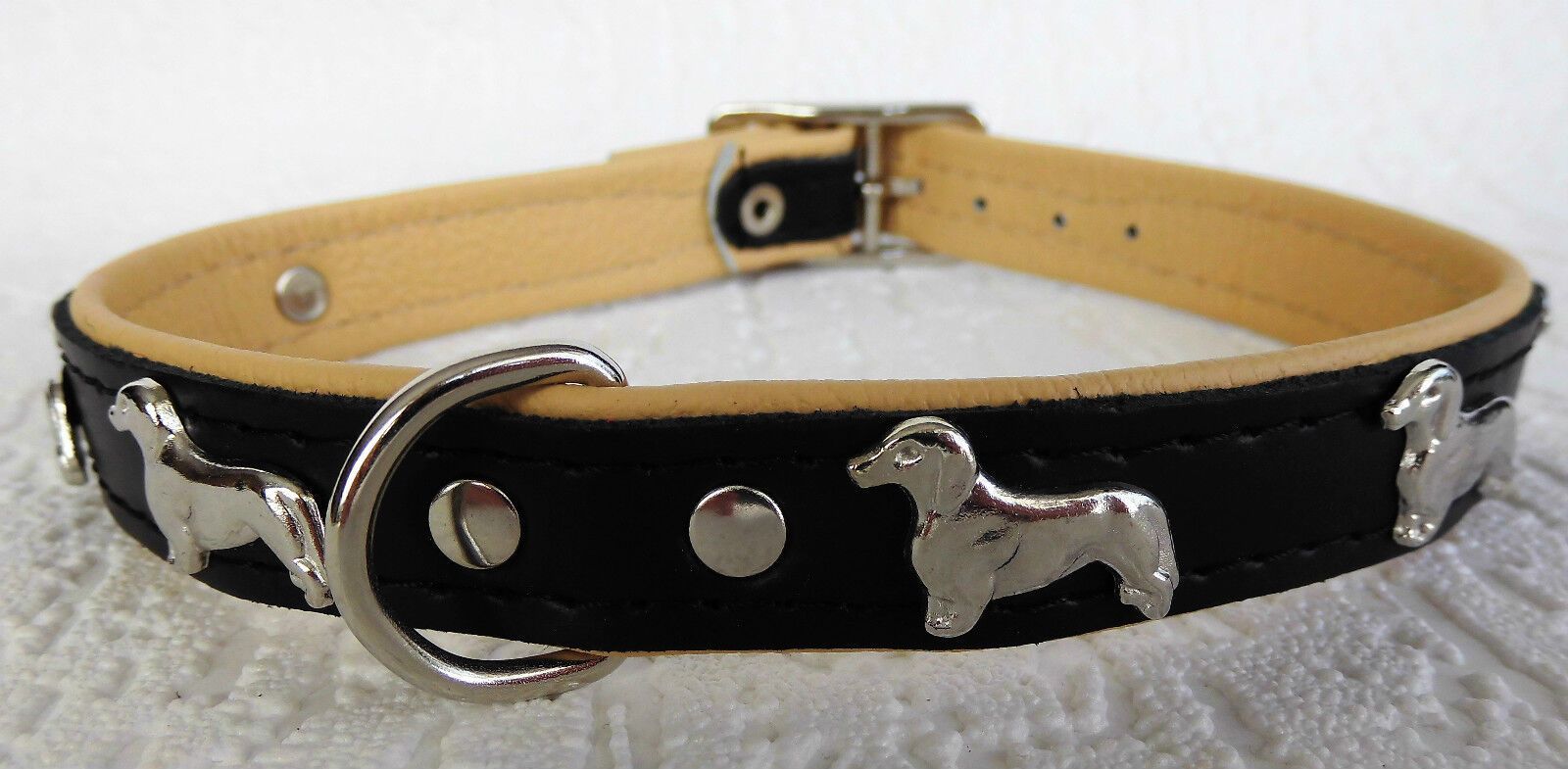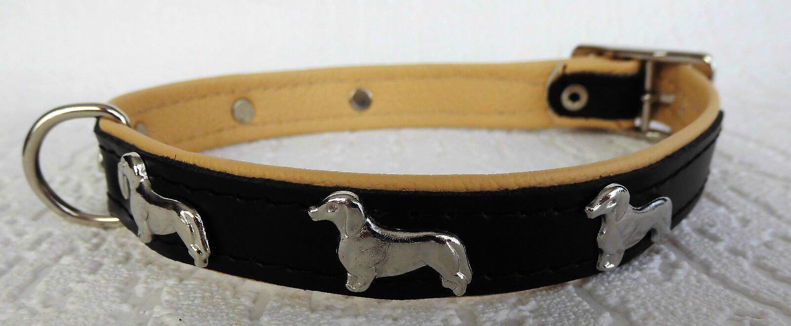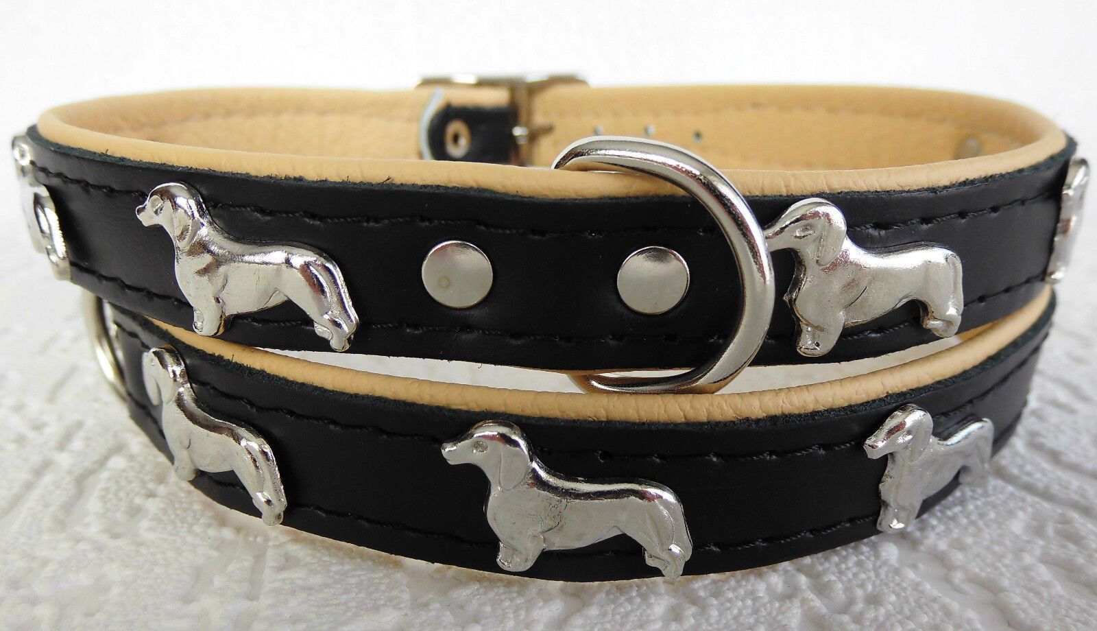 LEDERHALSBAND mit tollen Metallaplikationen ***DACKEL*** *** SCHWARZ - Beige *** Maße: Gesamtlänge : 45 cm Halsumfang : 36 - 42 cm Breit : 20 mm Messen Sie hierzu bitte den Hals ihres Hundes. Material - 100% hochwertiges Leder, sehr robust - Verziert mit tollen Metallaplikationen - je Seite 3 Hunde