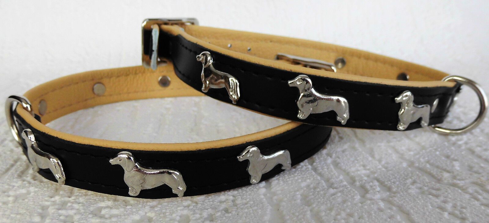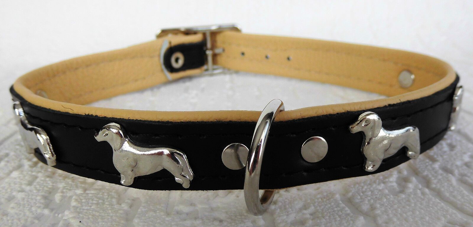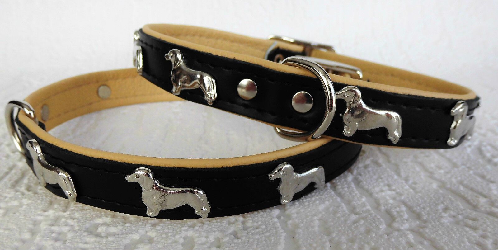LEDERHALSBAND mit tollen Metallaplikationen ***DACKEL*** *** SCHWARZ - Beige *** Maße: Gesamtlänge : 45 cm Halsumfang : 36 - 42 cm Breit : 20 mm Messen Sie hierzu bitte den Hals ihres Hundes. Material - 100% hochwertiges Leder, sehr robust - Verziert mit tollen Metallaplikationen - je Seite 3 Hunde
