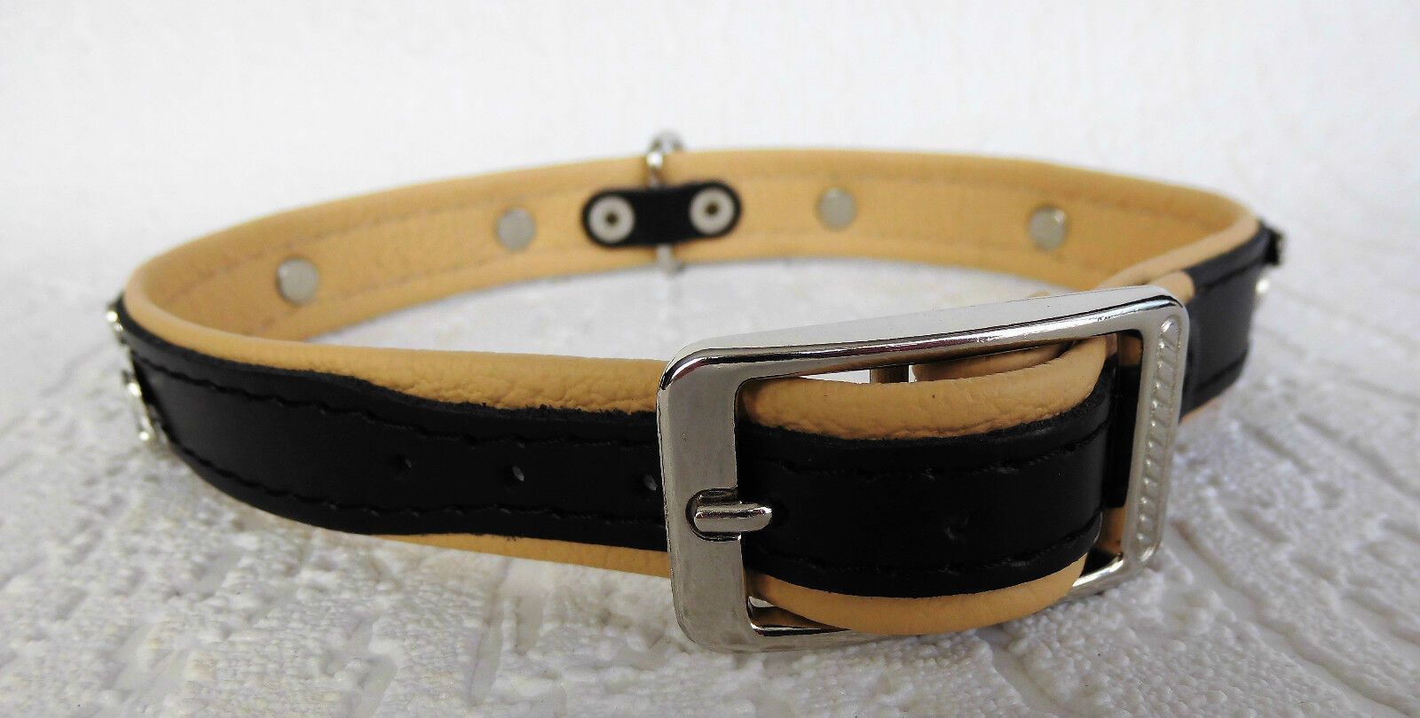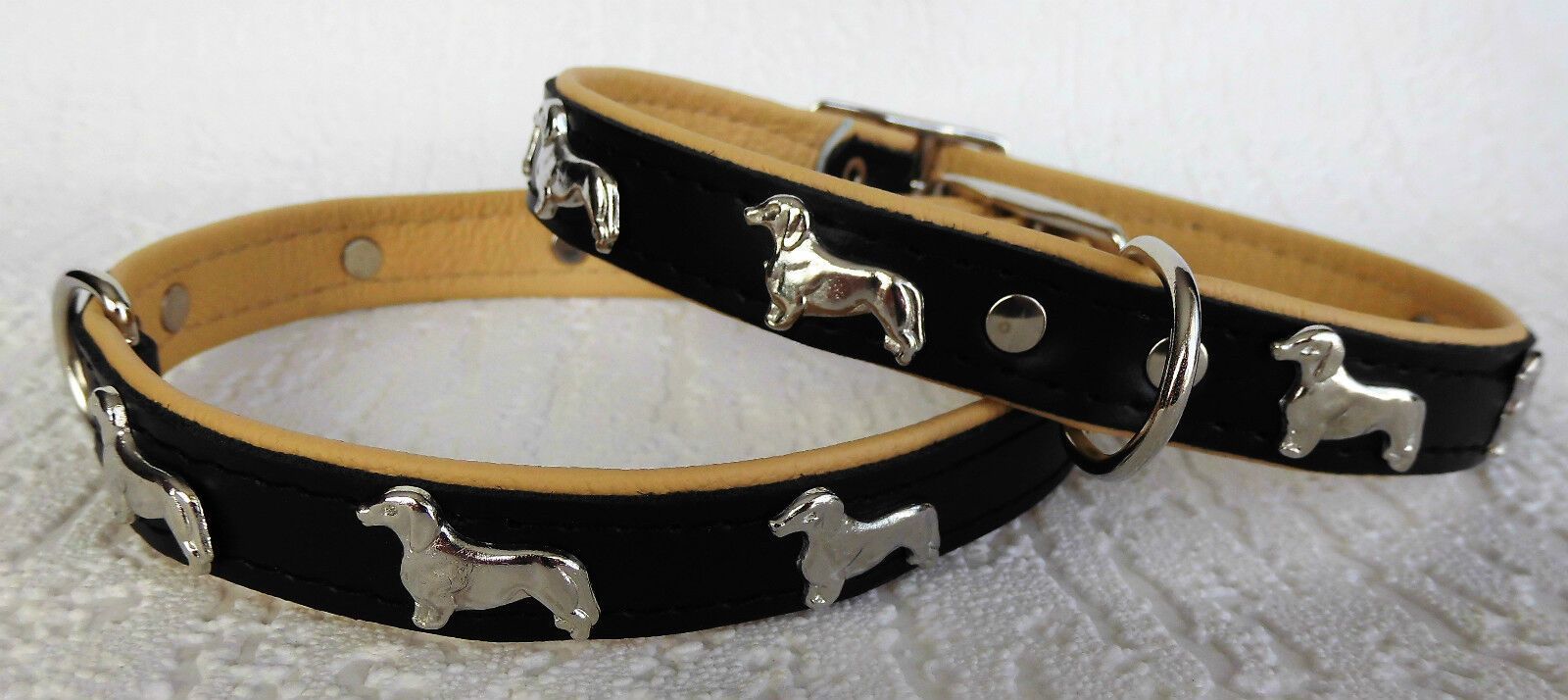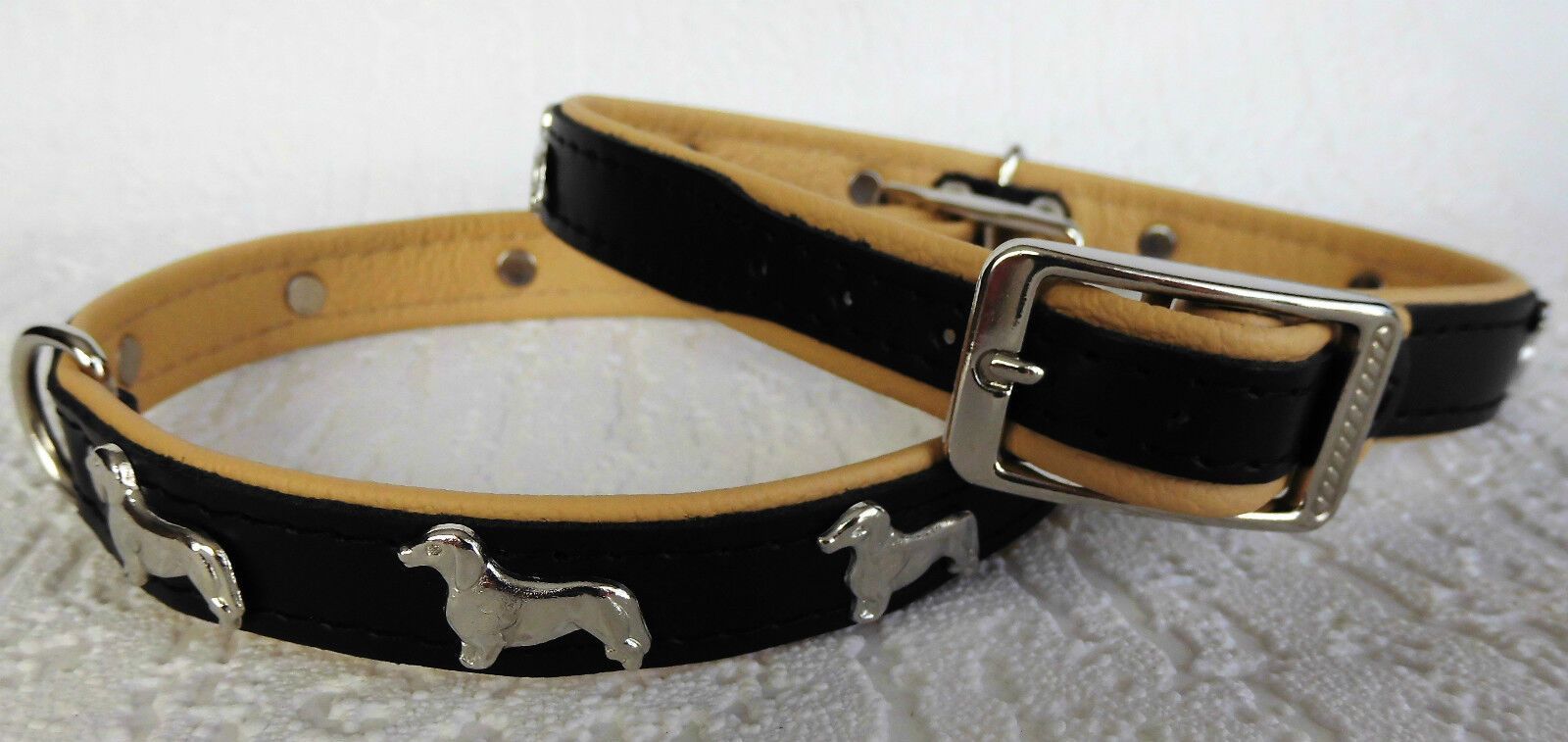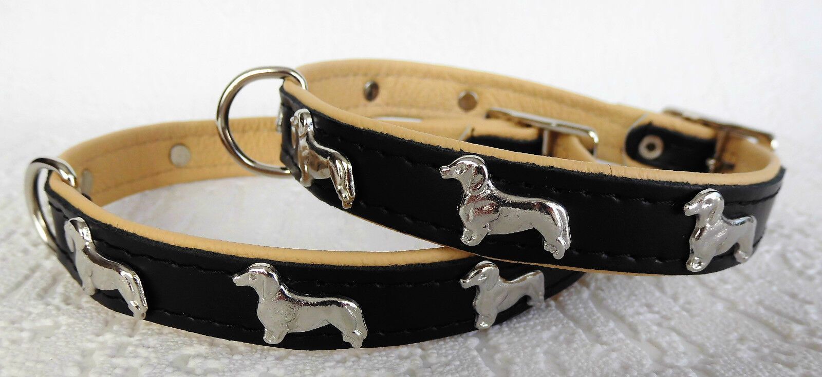 LEDERHALSBAND mit tollen Metallaplikationen ***DACKEL*** *** SCHWARZ - Beige *** Maße: Gesamtlänge : 45 cm Halsumfang : 36 - 42 cm Breit : 20 mm Messen Sie hierzu bitte den Hals ihres Hundes. Material - 100% hochwertiges Leder, sehr robust - Verziert mit tollen Metallaplikationen - je Seite 3 Hunde